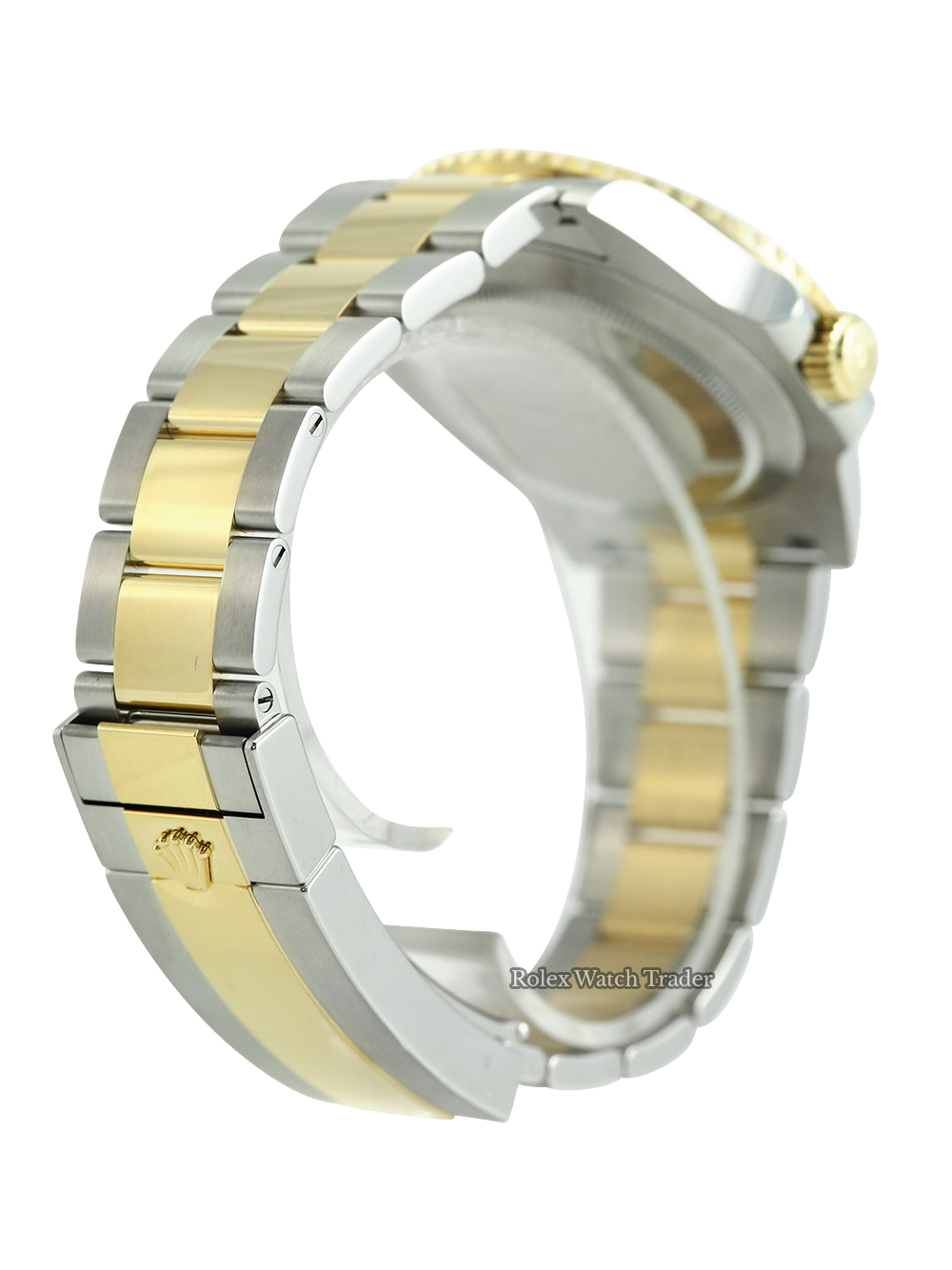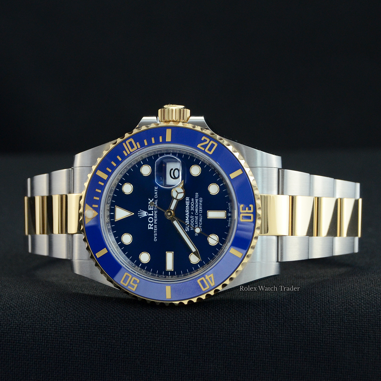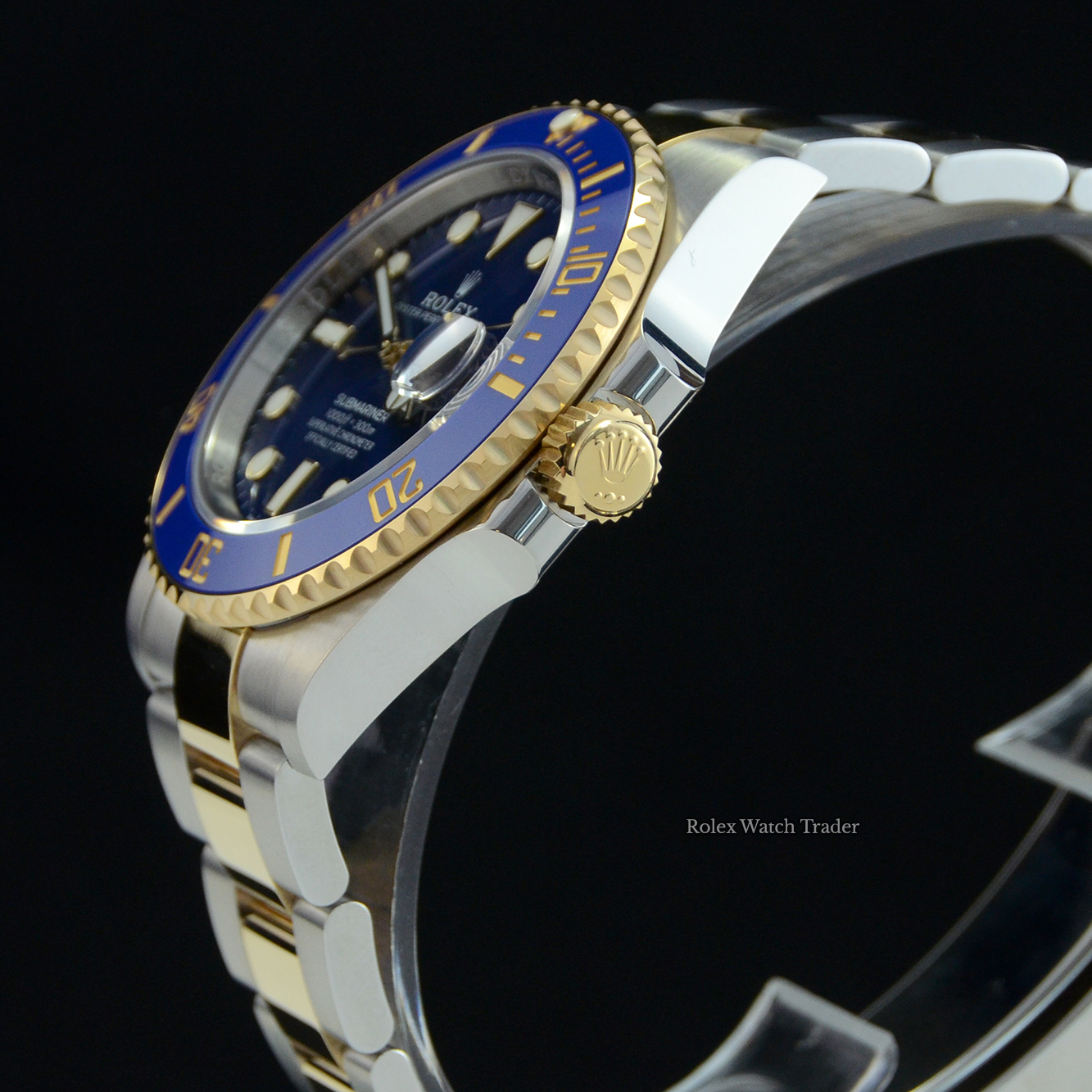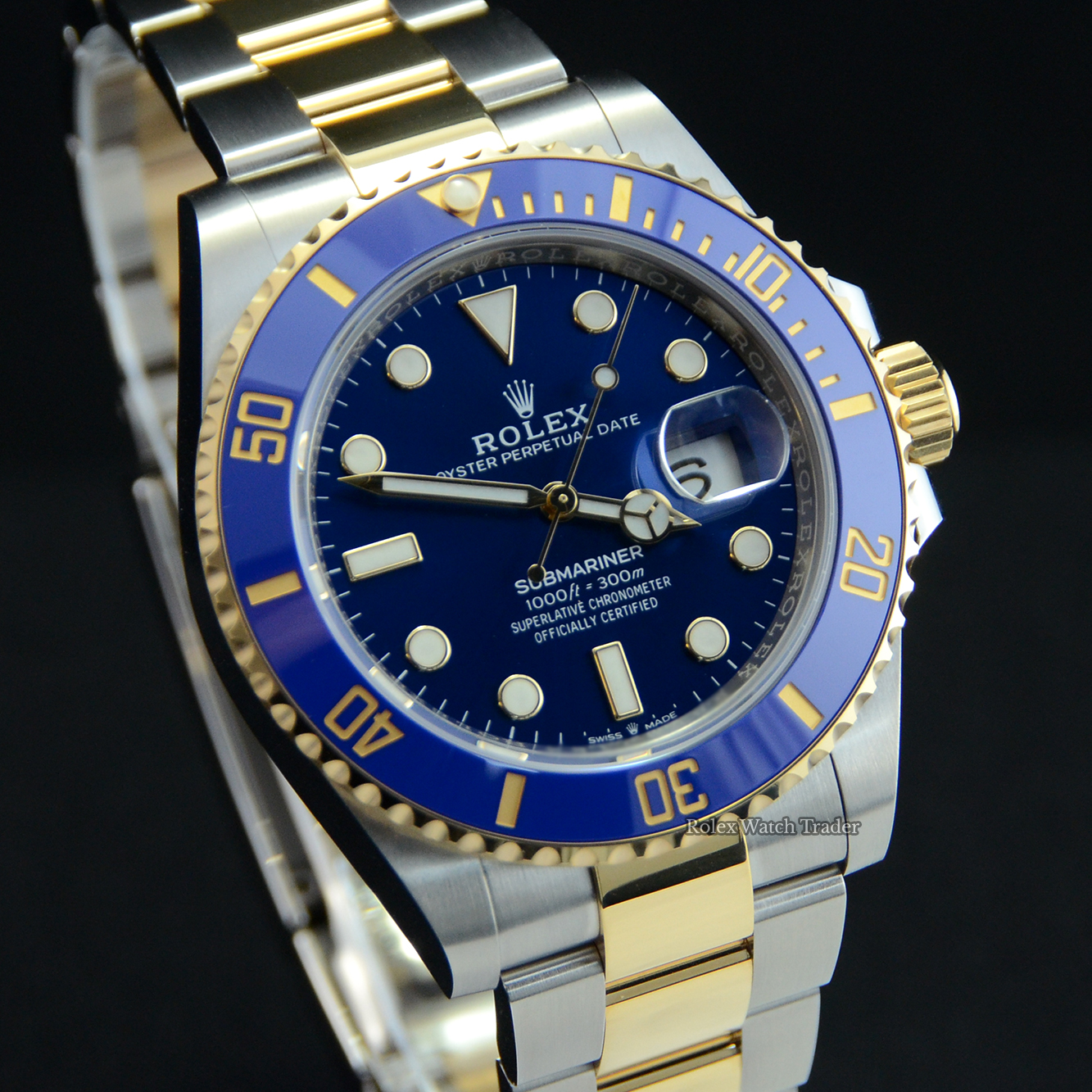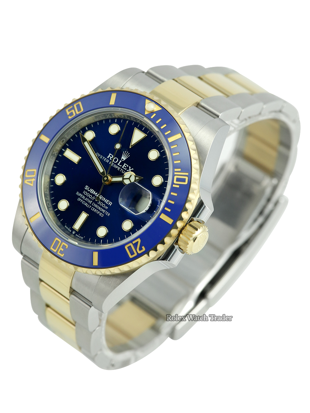 A brand new unworn and unsized superlative chronometer certified automatic movement Rolex Submariner Date model reference 126613LB. Featuring a 41mm bimetal stainless steel and yellow gold case, housing a sunburst blue baton dial with gold trim luminous hour markers and a date aperture at 3 o'clock with an external cyclops. The dial is surrounded by a blue 60 minute uni-directional rotating ceramic bezel. All presented on a full retail length stainless steel and yellow gold Rolex Oyster bracelet with an Oysterlock secure folding clasp.