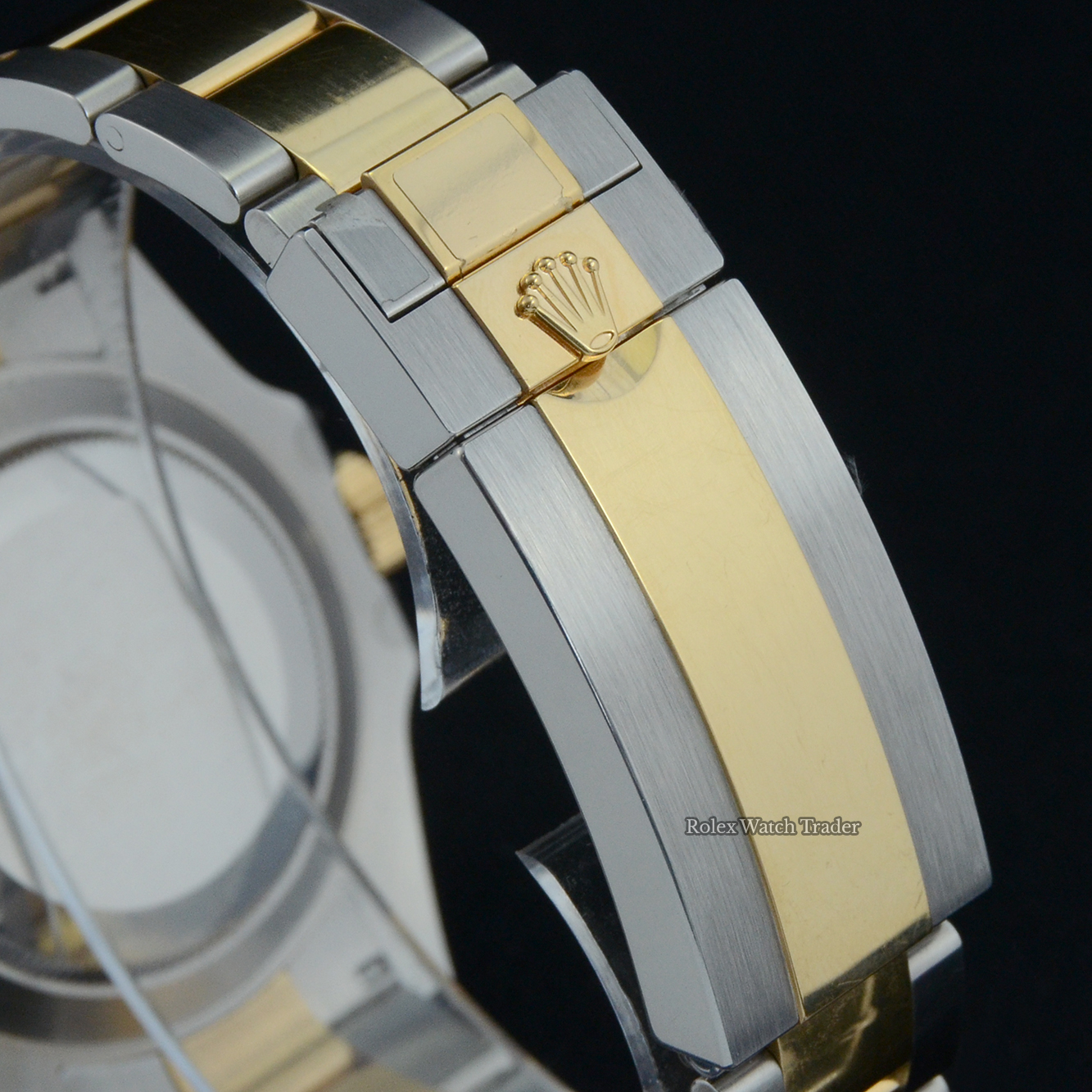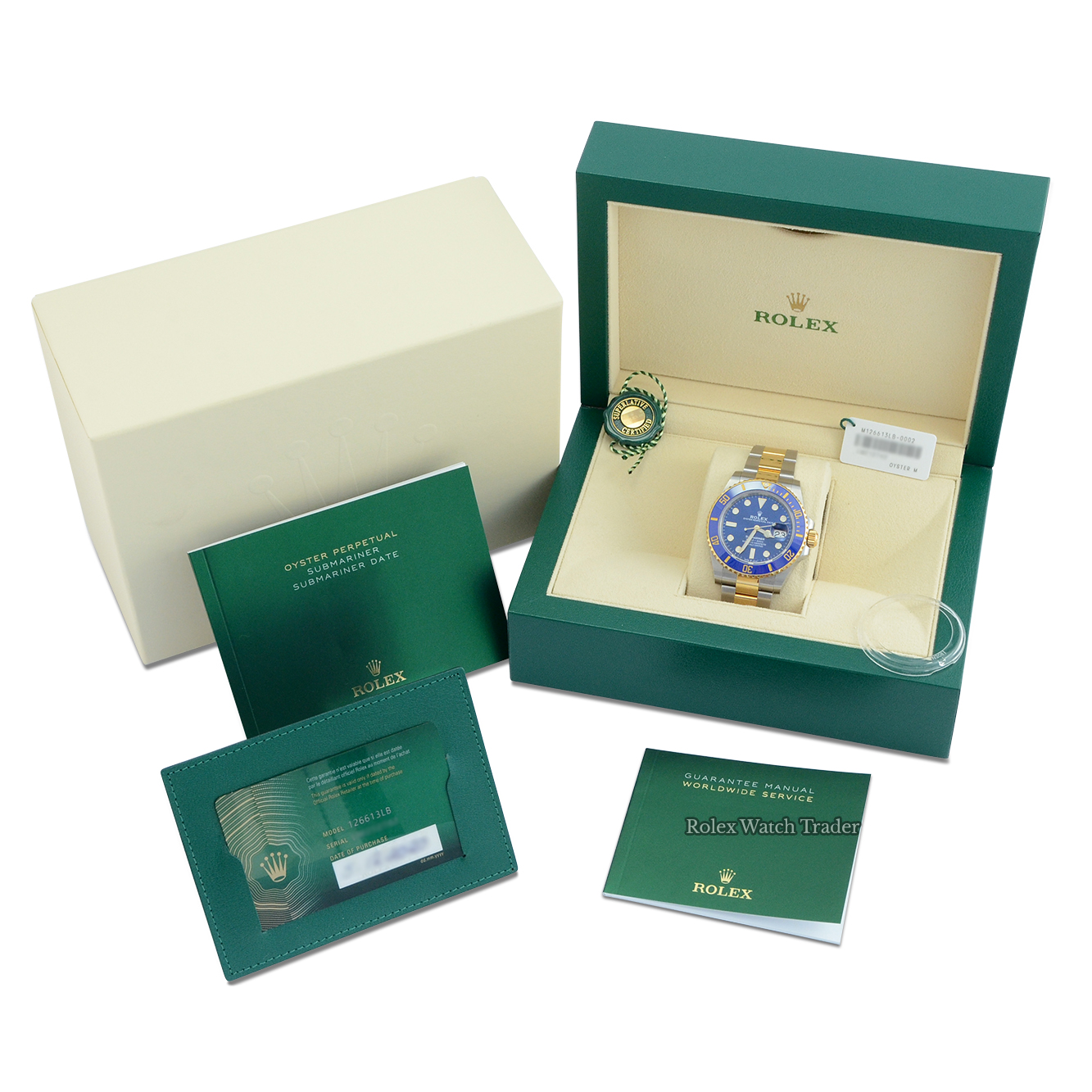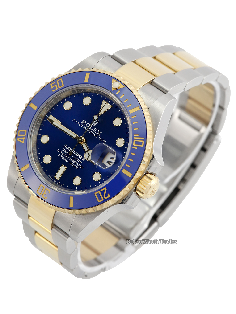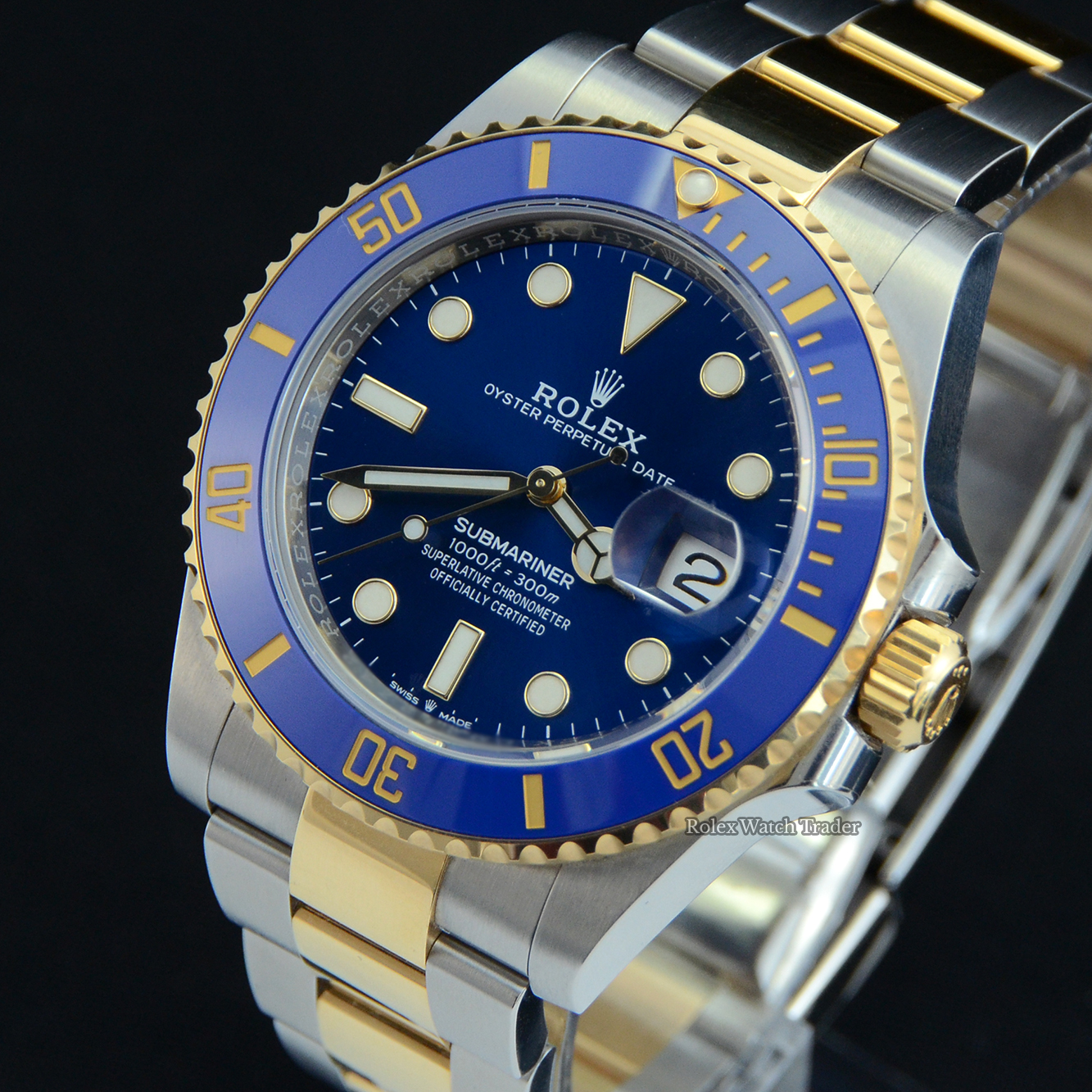 A pre-owned in excellent condition superlative chronometer certified automatic movement Rolex Submariner Date model reference 126613LB. Featuring a 41mm bimetal stainless steel and yellow gold case, housing a sunburst blue baton dial with gold trim luminous hour markers and a date aperture at 3 o'clock with an external cyclops. The dial is surrounded by a blue 60 minute uni-directional rotating ceramic bezel. All presented on a full retail length stainless steel and yellow gold Rolex Oyster bracelet with an Oysterlock secure folding clasp.
