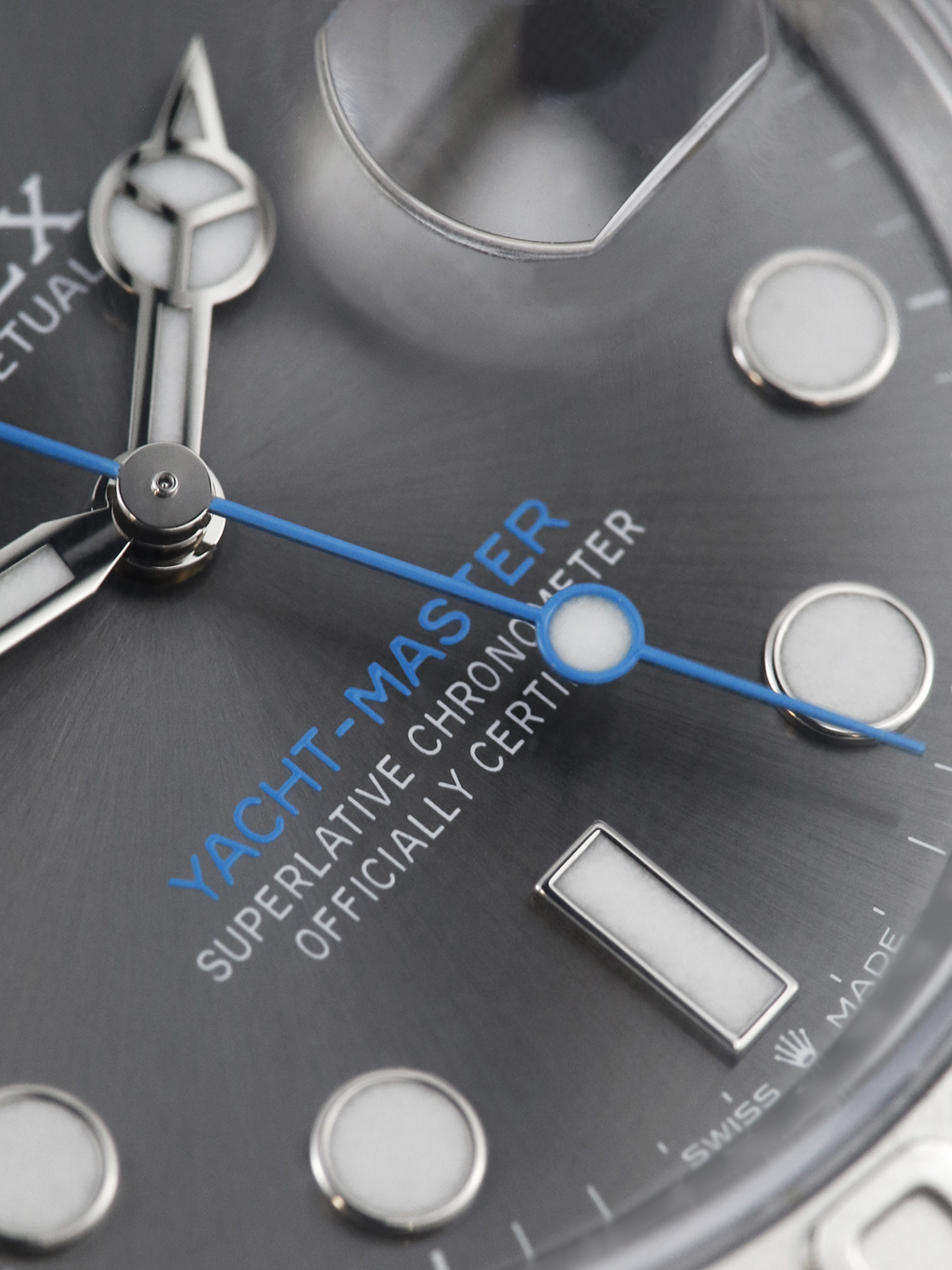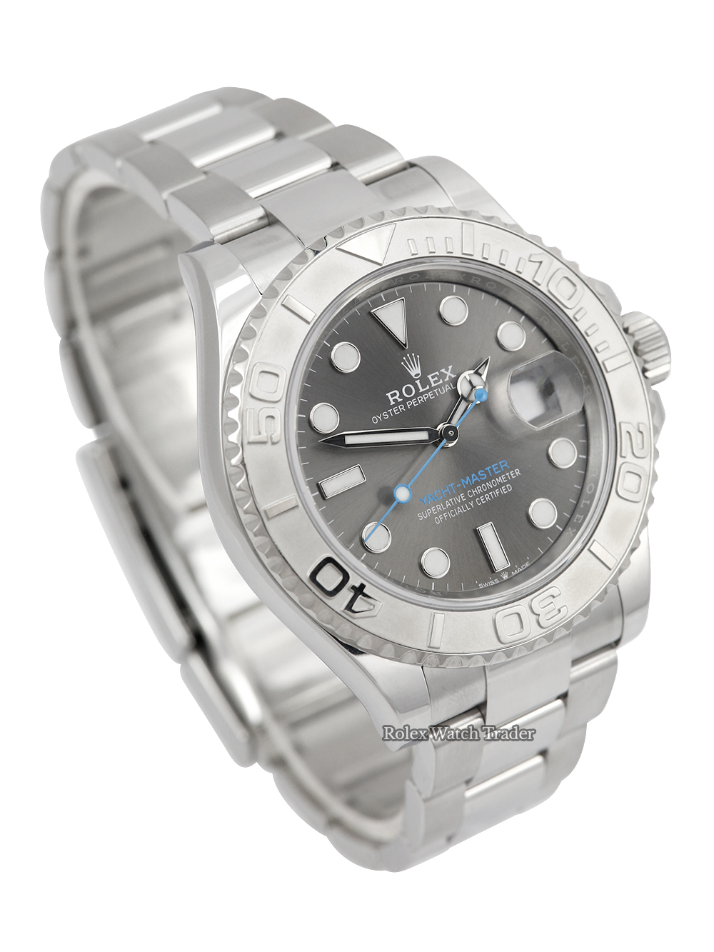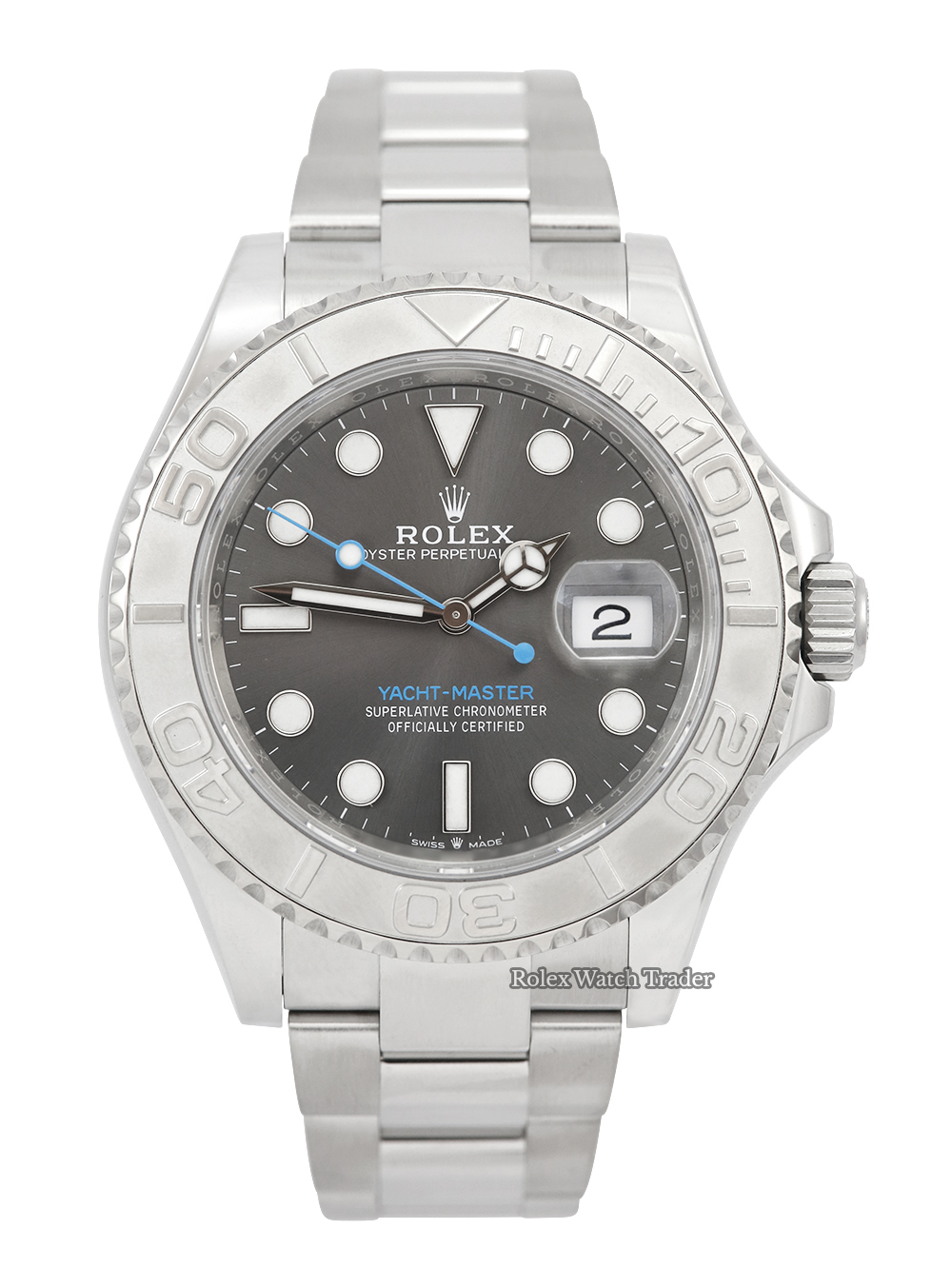 A pre-owned in pristine condition chronometer certified, automatic movement Rolex Yacht-Master, model reference 126622. Featuring a 40mm stainless steel case, housing a Slate dial with a date aperture at 3 o'clock and an external cyclops. The dial is surrounded by a sandblasted platinum 60-minute rotating bezel with polished finish numerals. Presented on a full retail length stainless steel Rolex Oyster bracelet.