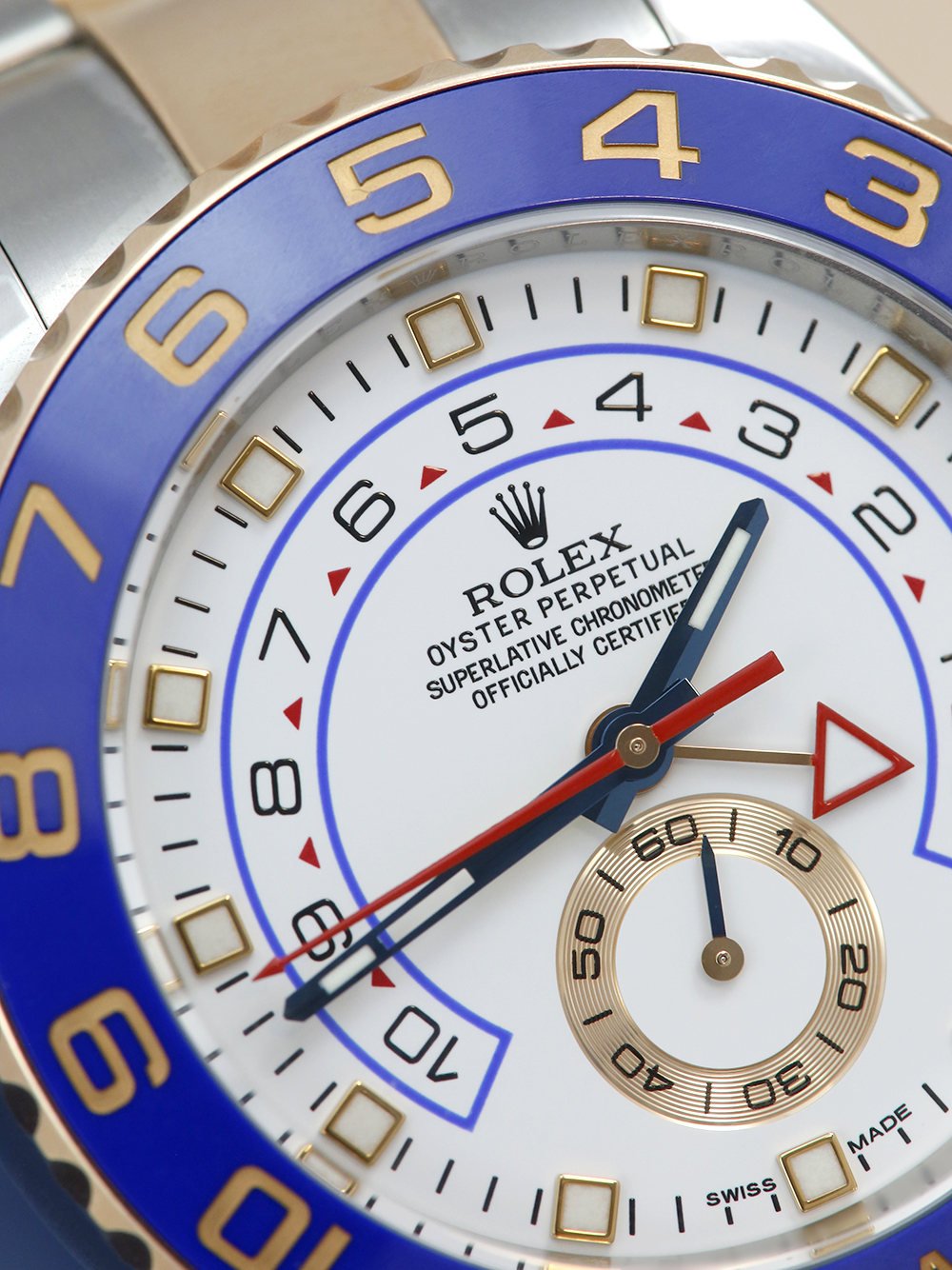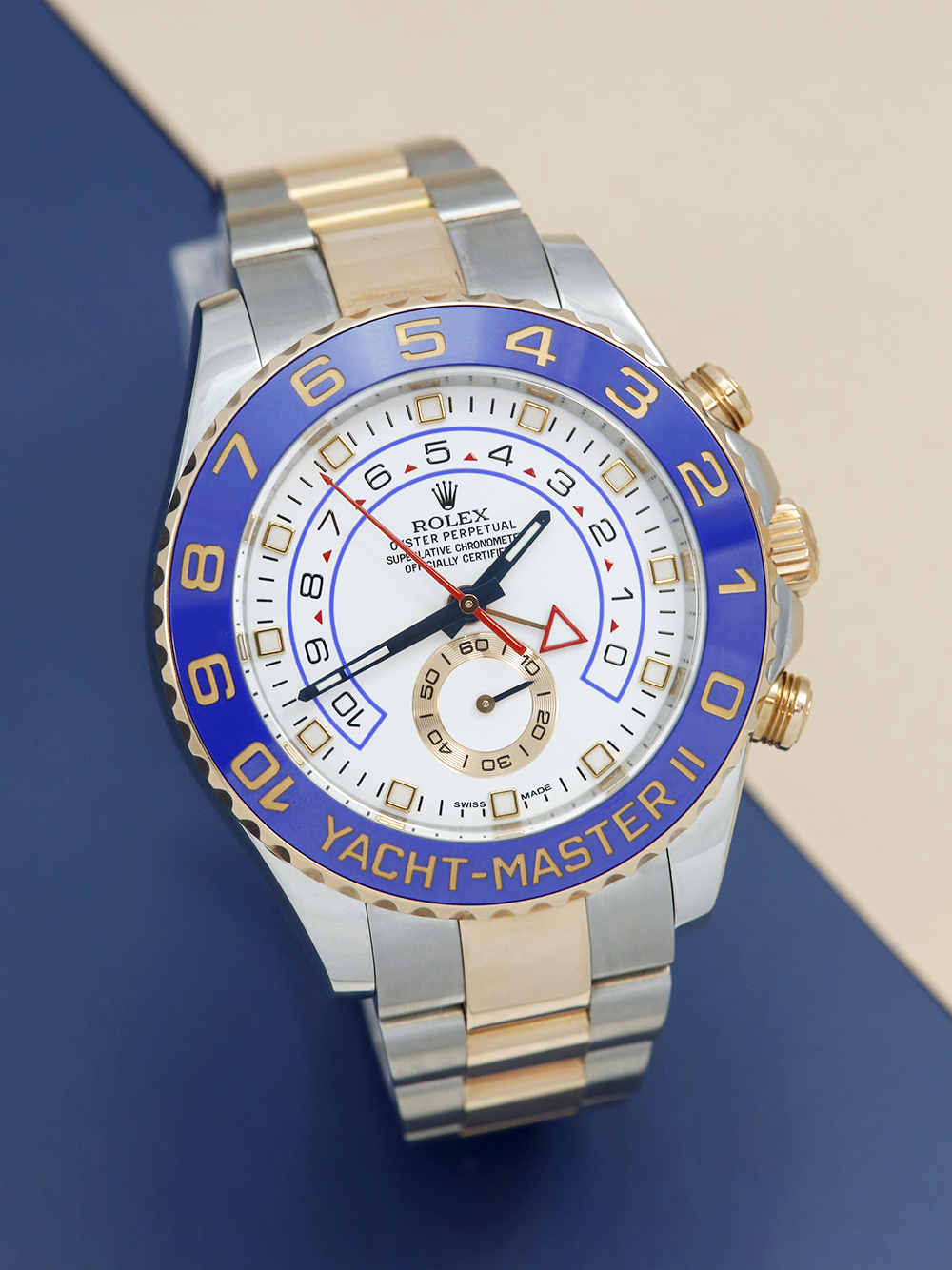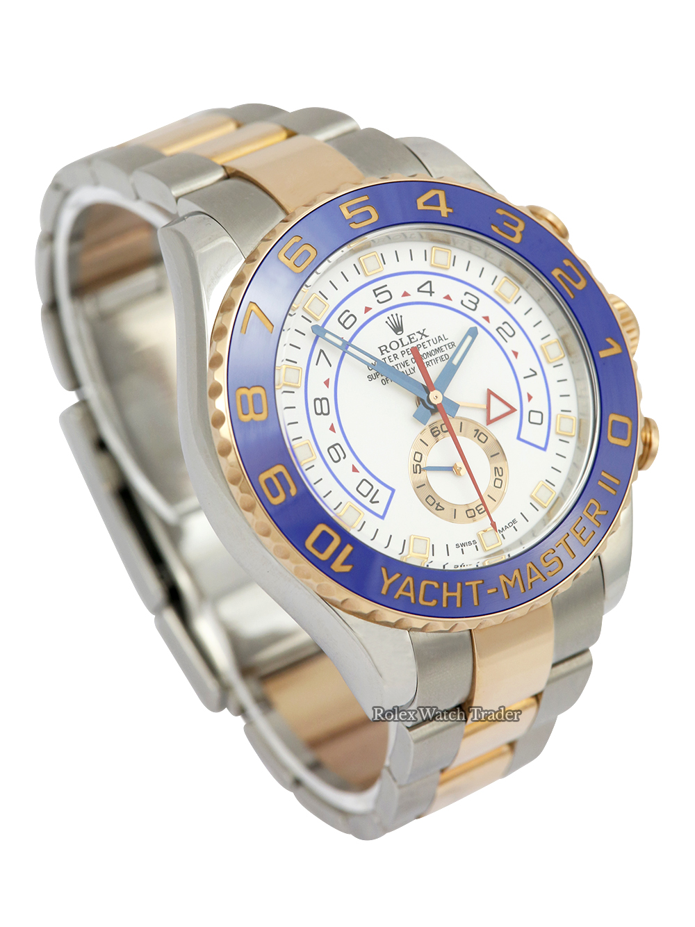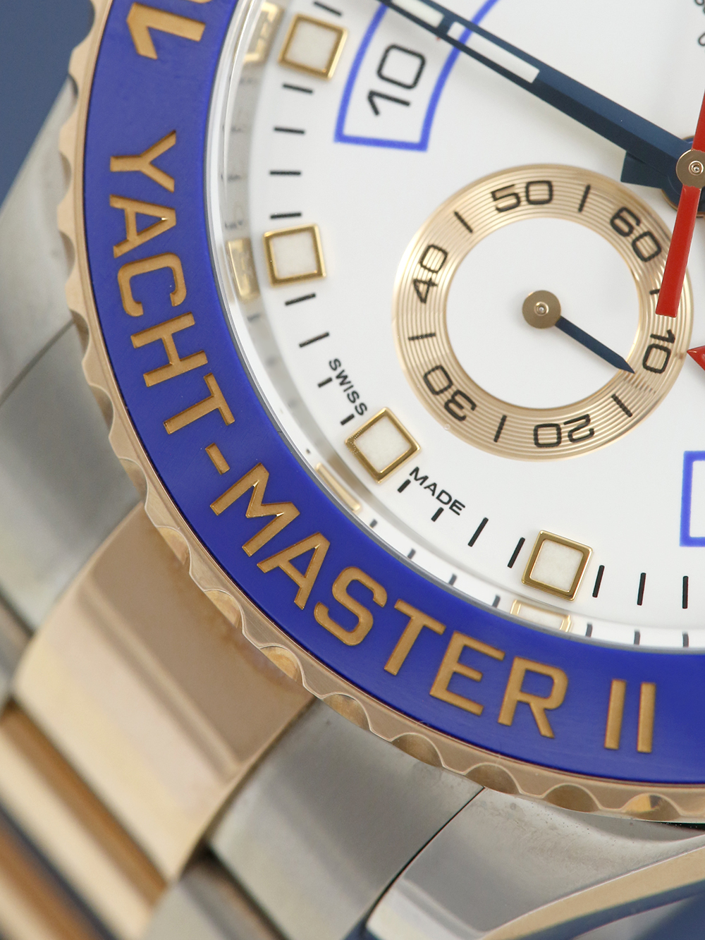 An excellent condition, pre-owned, superlative chronometer certified, automatic movement Rolex Yacht-Master II, model reference 116681. Featuring a 44mm bi-metal stainless steel and rose gold case, housing a white baton dial with a regatta chronograph function, small seconds sub-dial and a red chronograph hand. The dial is surrounded by a 10 minute countdown blue ceramic bezel. All presented a stainless steel and rose gold Rolex Oyster bracelet with a secure Oysterlock folding clasp.