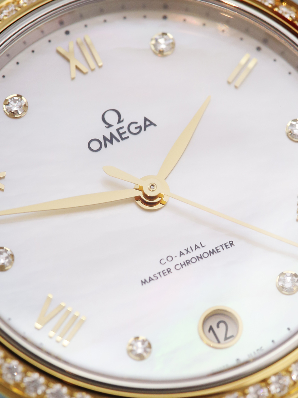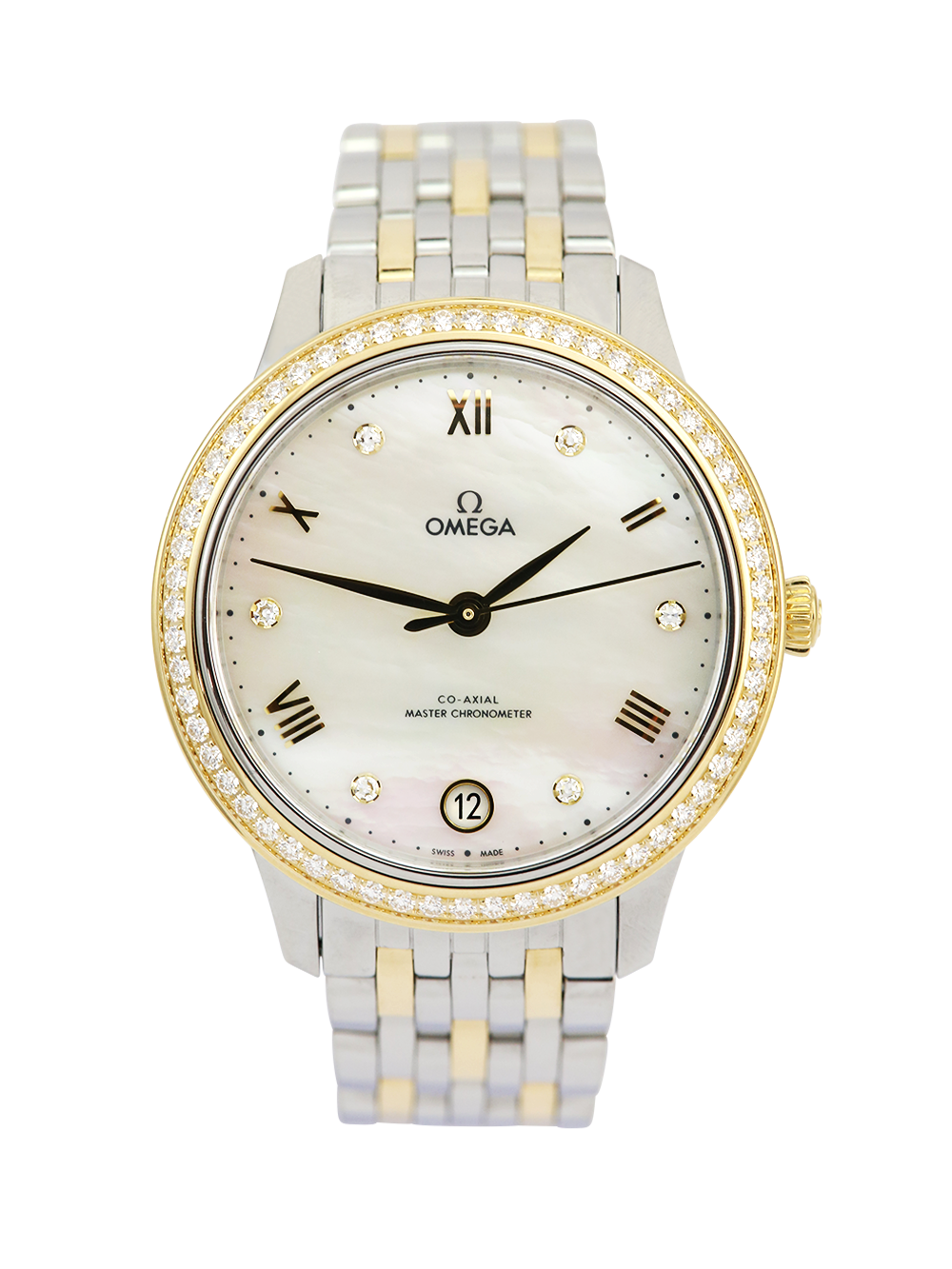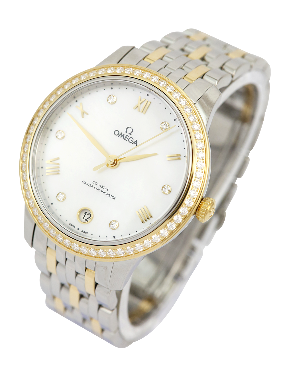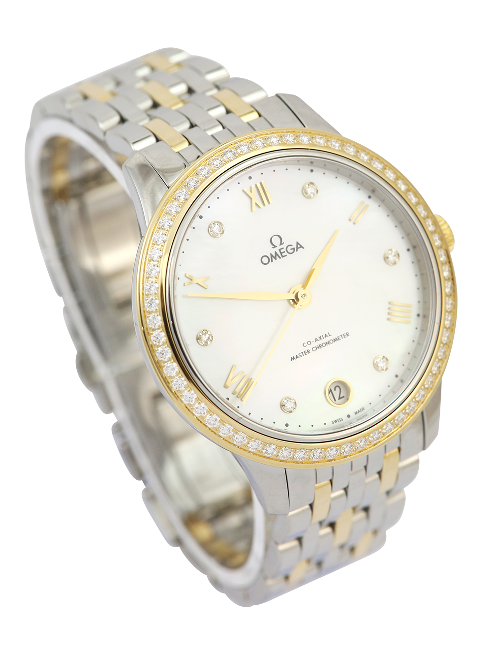 A brand new, unworn 34 mm stainless steel and 18K yellow gold Omega De Ville Prestige 434.25.34.20.55.002 features a diamond-paved bezel and a dial crafted from white mother-of-pearl. The display is distinguished by yellow gold-plated hands, as well as alternating Roman numerals and diamond markers.