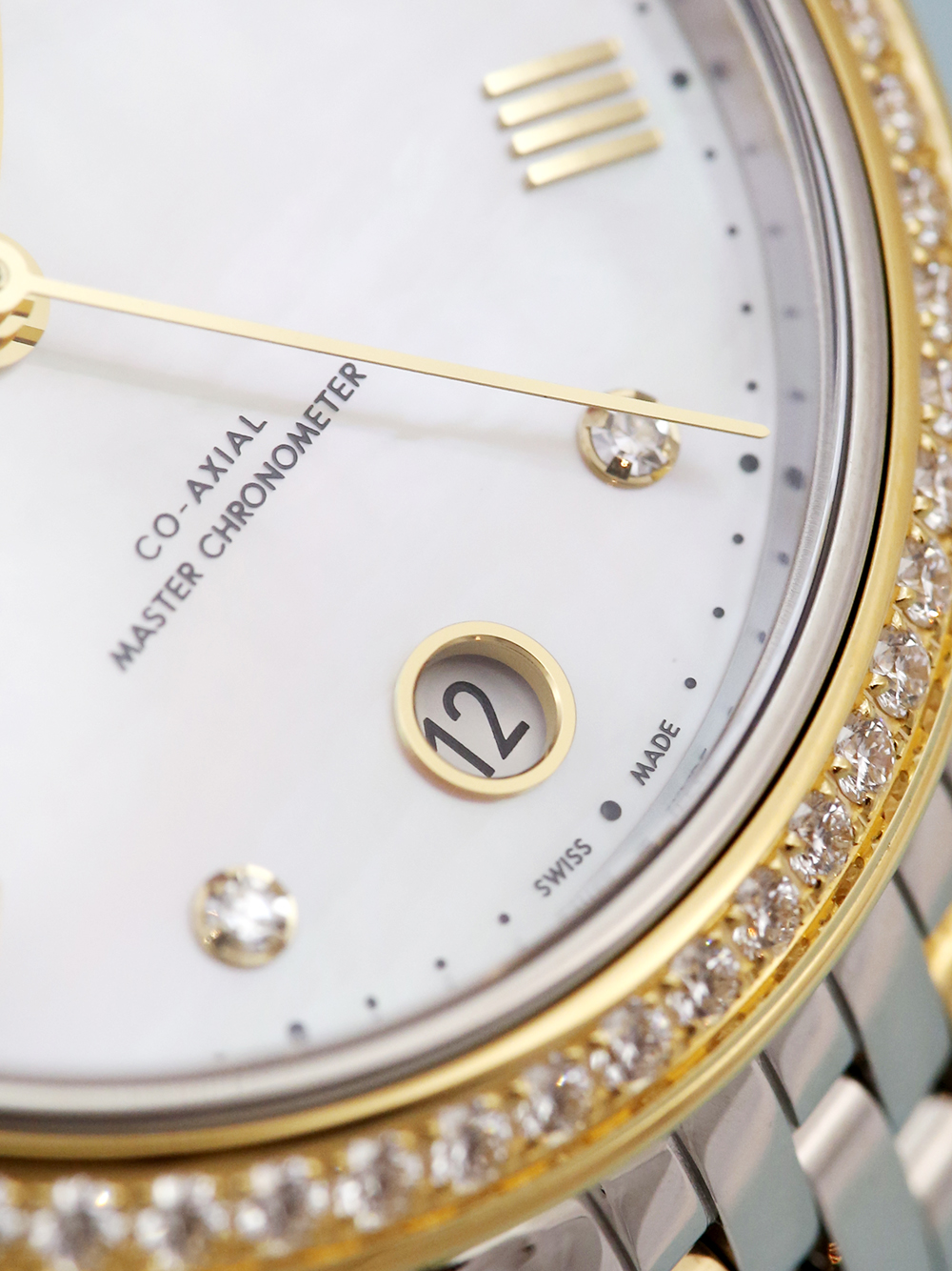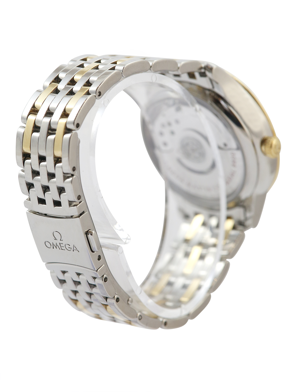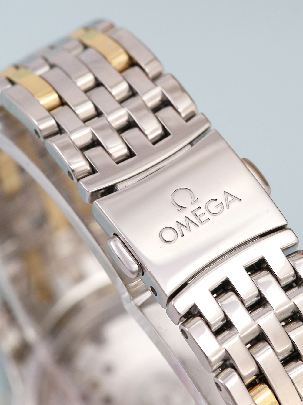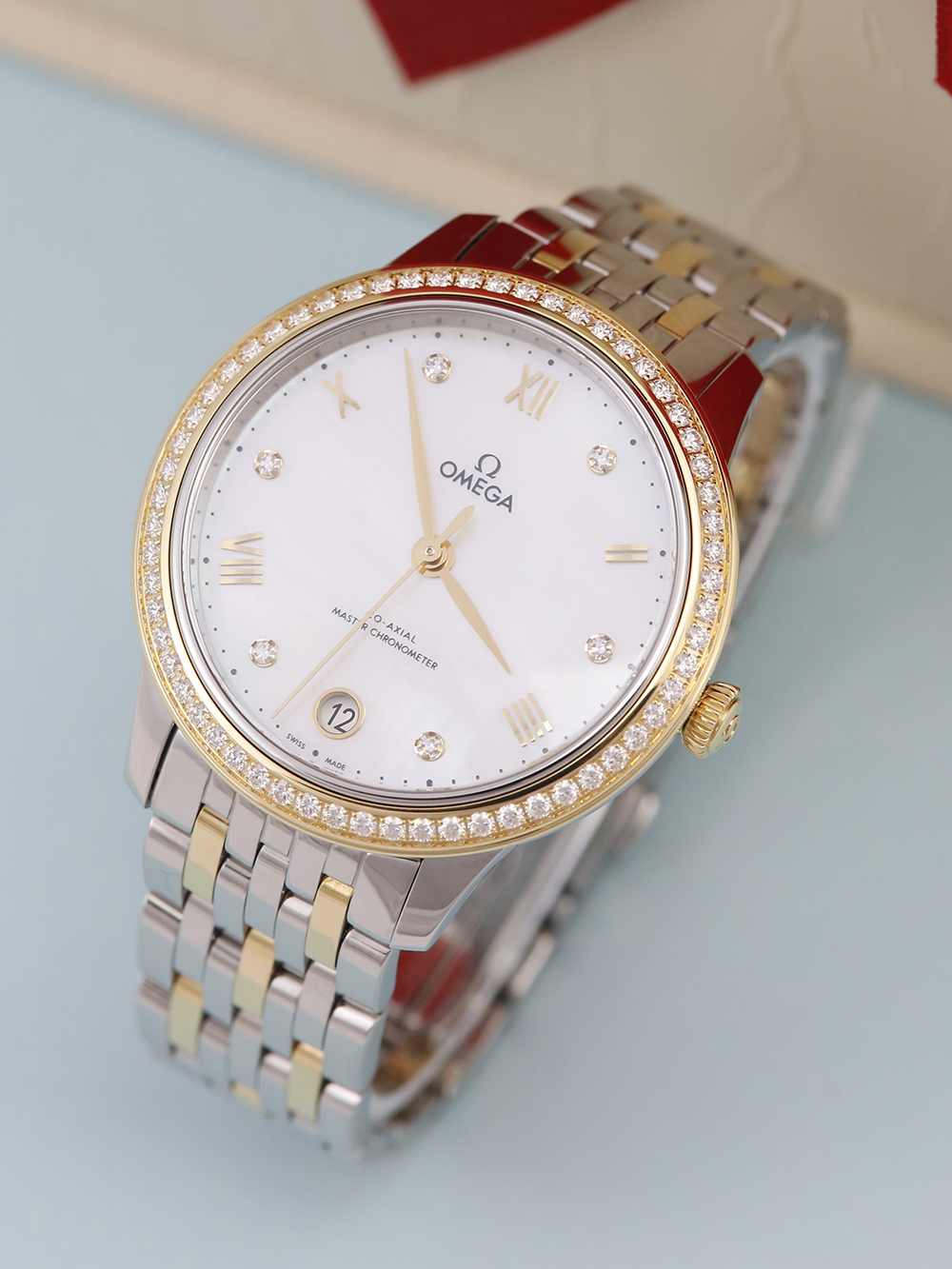 A brand new, unworn 34 mm stainless steel and 18K yellow gold Omega De Ville Prestige 434.25.34.20.55.002 features a diamond-paved bezel and a dial crafted from white mother-of-pearl. The display is distinguished by yellow gold-plated hands, as well as alternating Roman numerals and diamond markers.