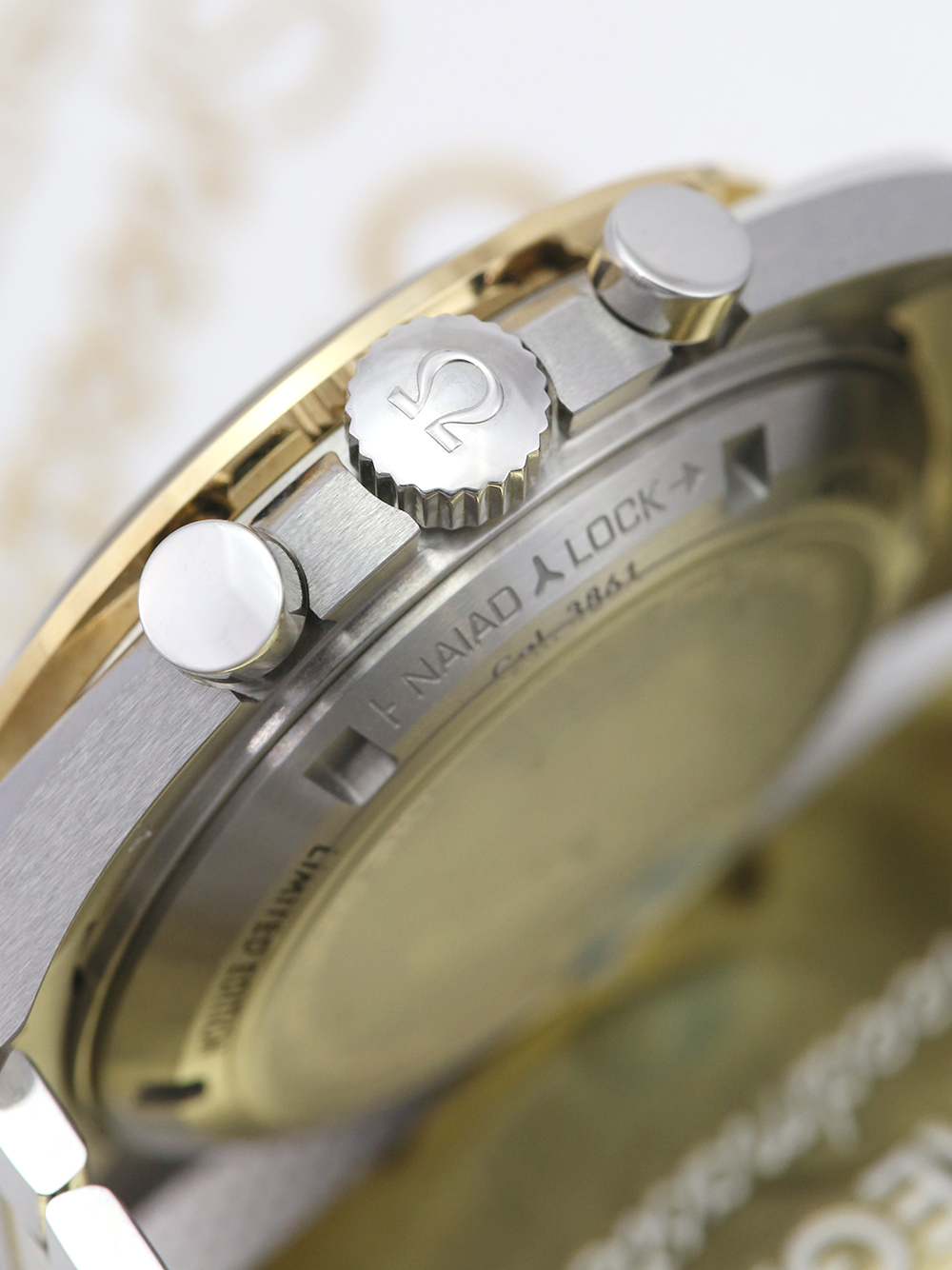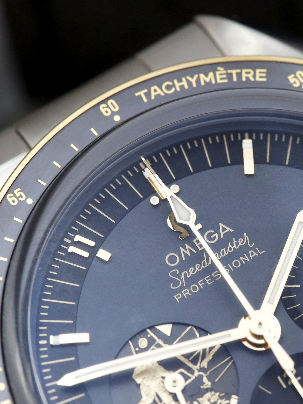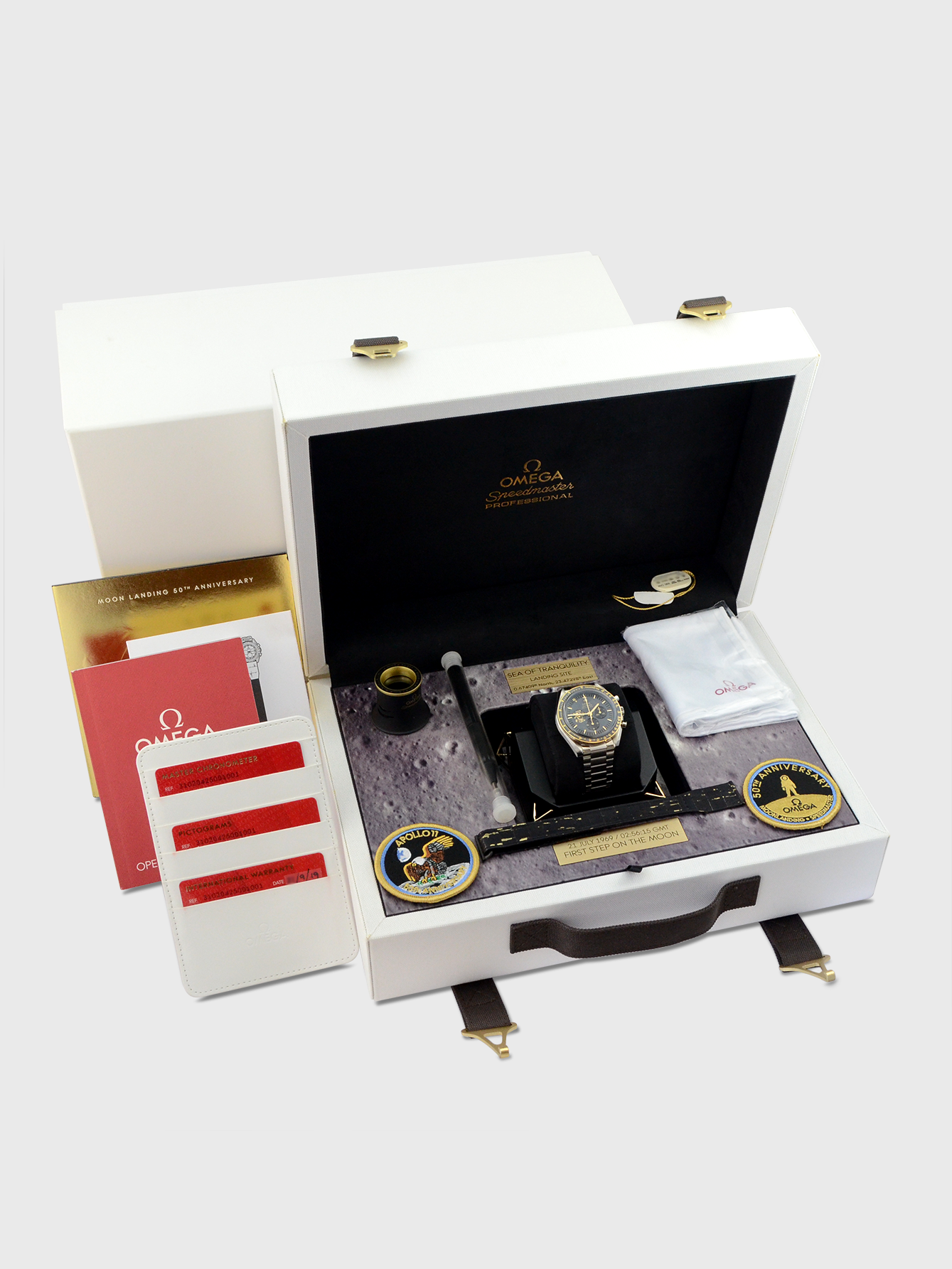 The Speedmaster is one of Omega’s most iconic timepieces, having been a part of all six moon landings. Celebrating the 50th anniversary of Apollo 11 in 1969, Omega produced this Limited Edition model of 6,969 pieces: An excellent condition pre-owned 42mm case size stainless steel & 18ct ‘Moonshine’ gold mechanical hand-wound, calibre 3861, movement Omega Speedmaster Apollo 11 50th Anniversary Moonwatch model 310.20.42.50.01.001 featuring a grey and black baton dial surrounded by a black ceramic tachymetre bezel. This particular watch comes on a full retail length stainless steel Omega Speedmaster bracelet.