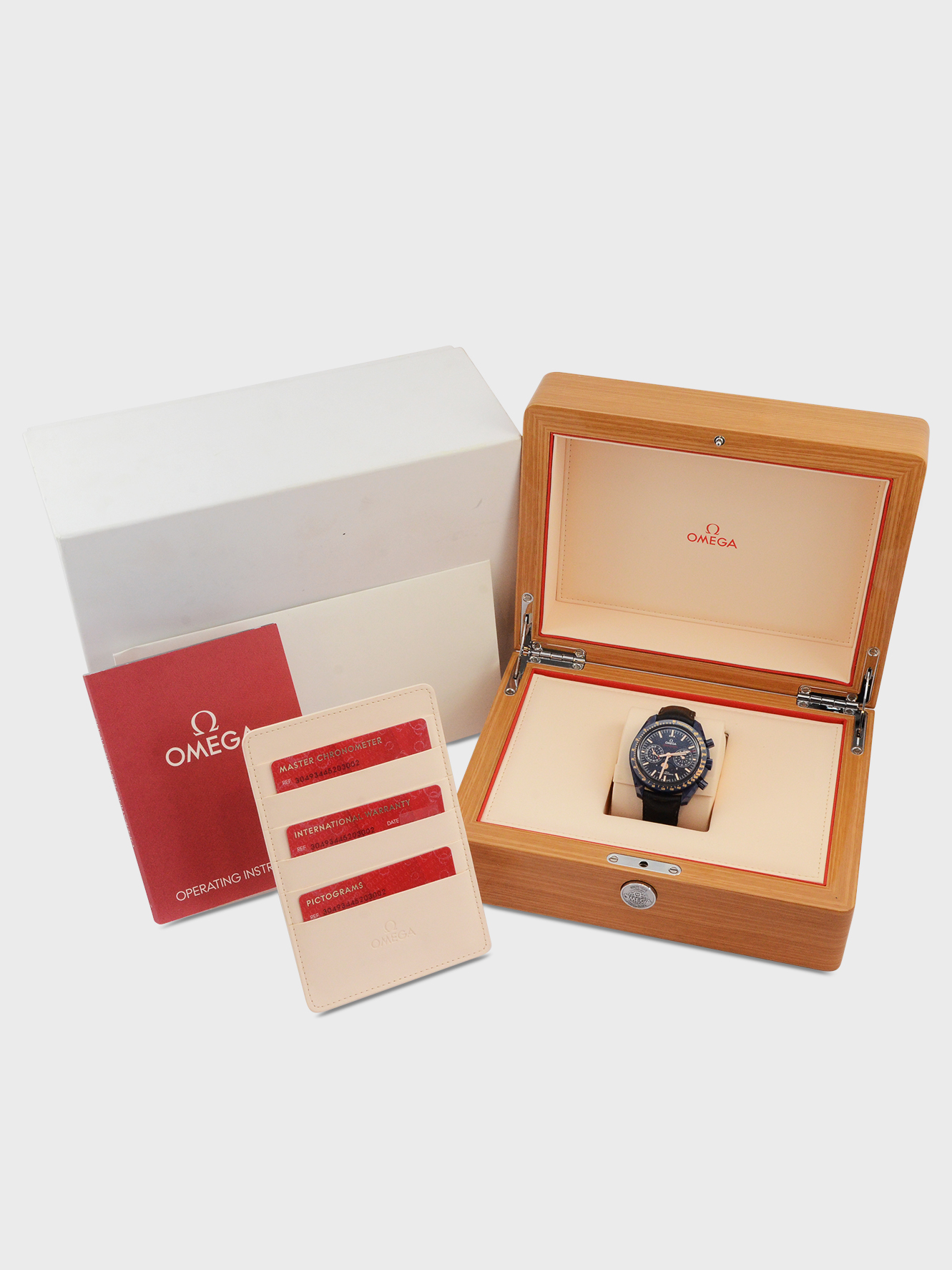 A preowned in excellent condition an Omega Speedmaster Moonwatch Moonphase model reference 304.93.44.52.03.002.