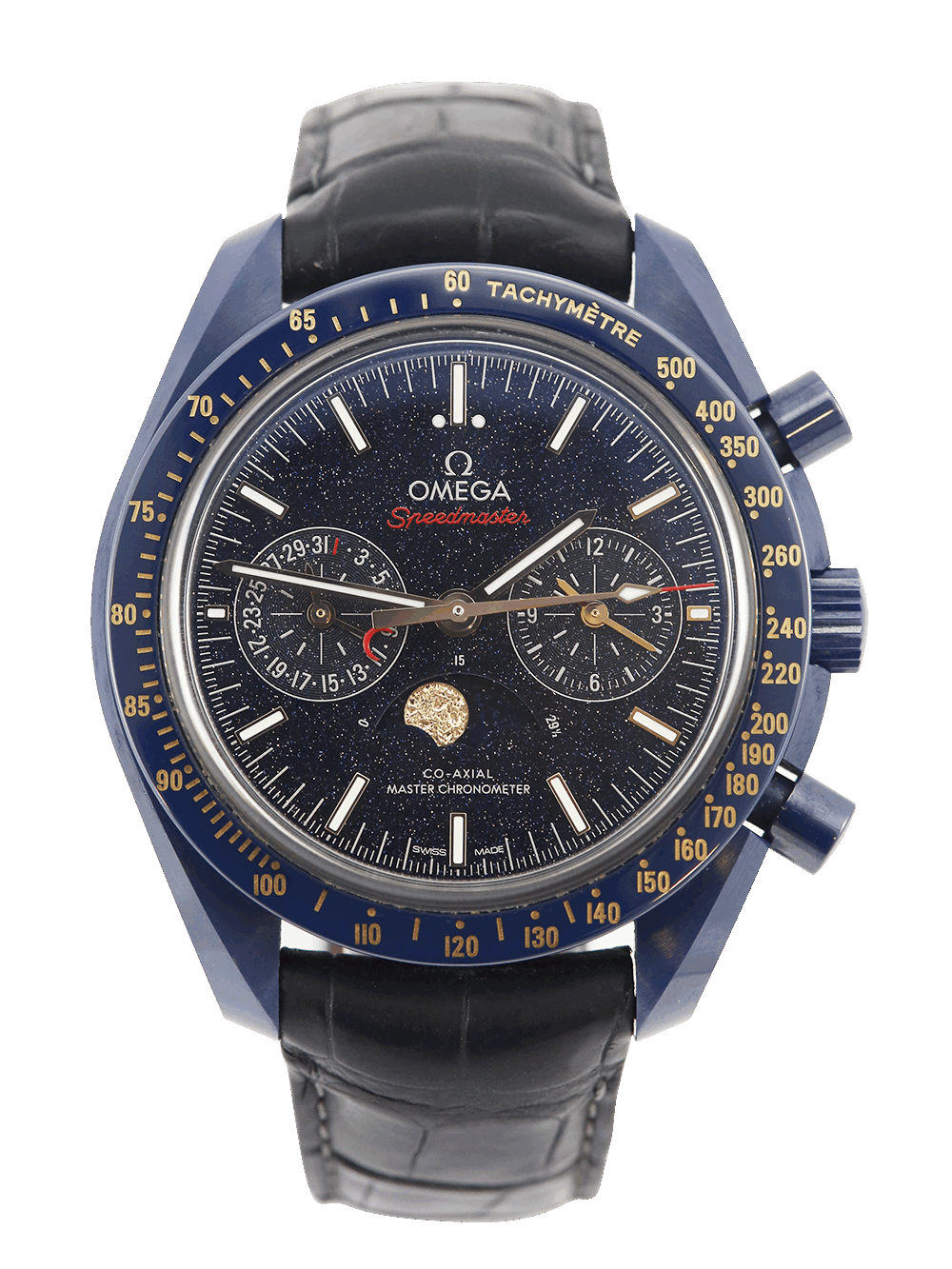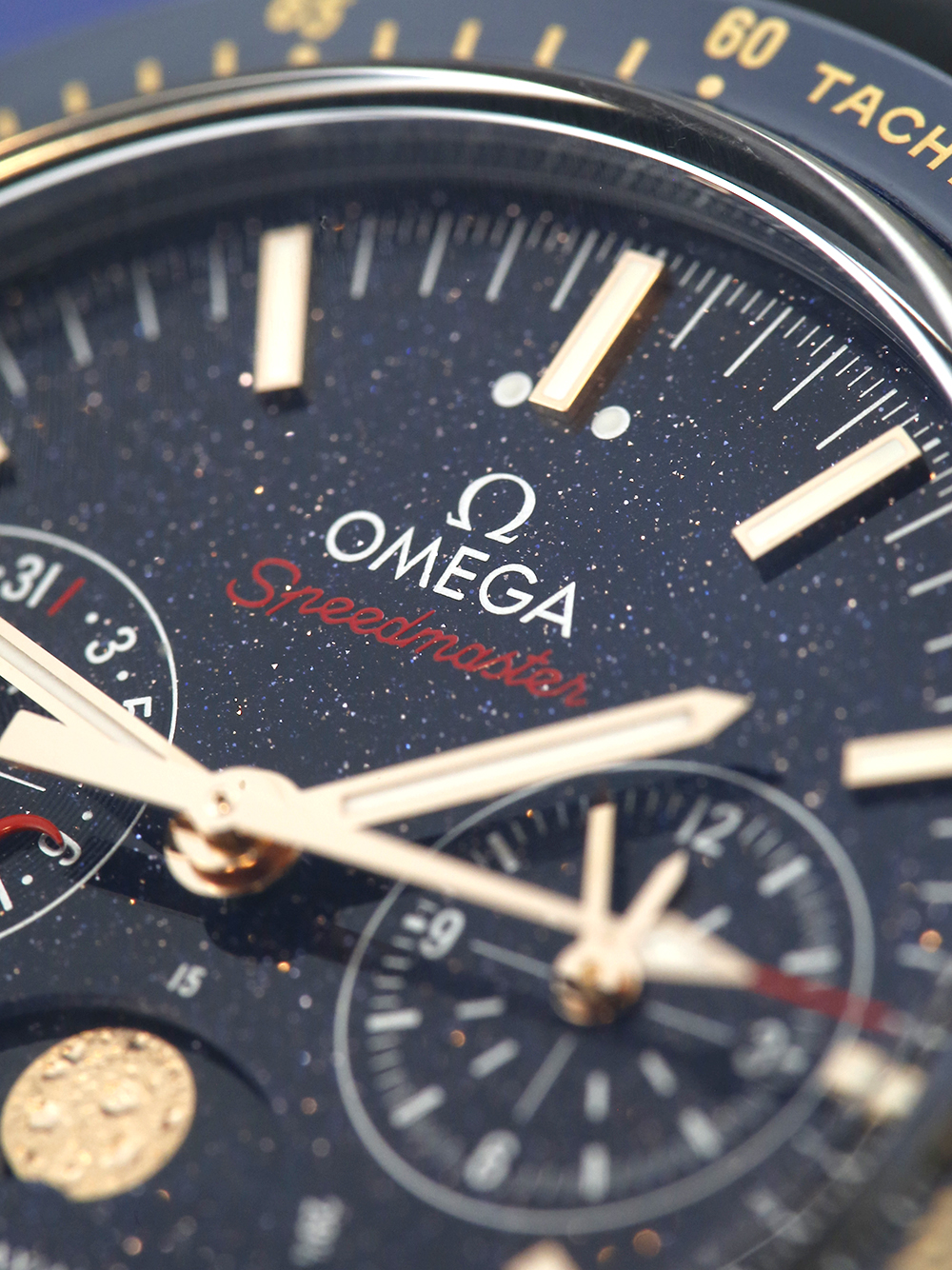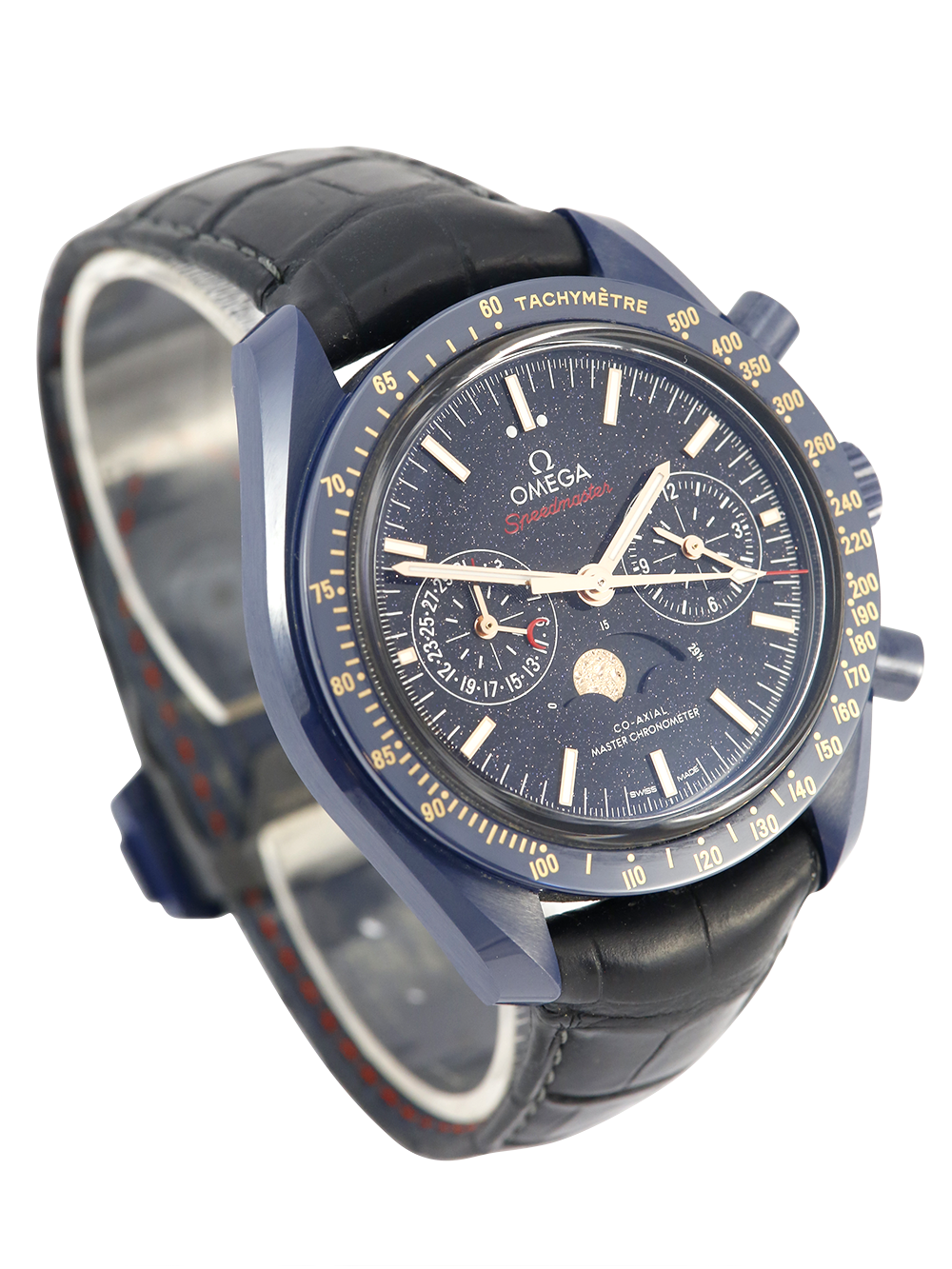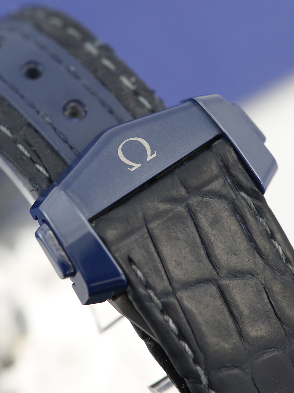 The 44.25 mm chronograph features a blue ceramic case complemented by a blue ceramic bezel ring with an OMEGA Ceragold tachymeter scale. Powering the timepiece is the OMEGA Master Chronometer Calibre 9904, certified at the industry’s highest standard by the Swiss Federal Institute of Metrology (METAS). Most vividly, the dial is blue aventurine glass and includes 18K Sedna gold indexes and hands as well as a date hand with red tip. At 6 o’clock is the accurate Moonphase indication, which features a blue enamel aventurine glass Moonphase disc (patent pending) with near and far sides of the moon in Sedna gold. It is presented on a blue leather strap with a blue ceramic and ceramised titanium foldover clasp.