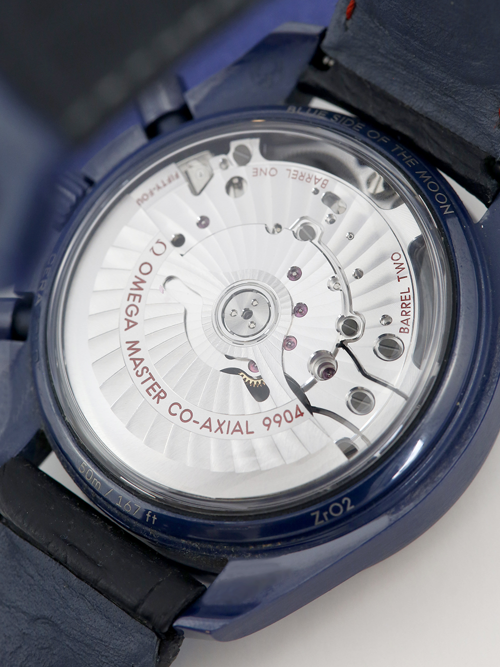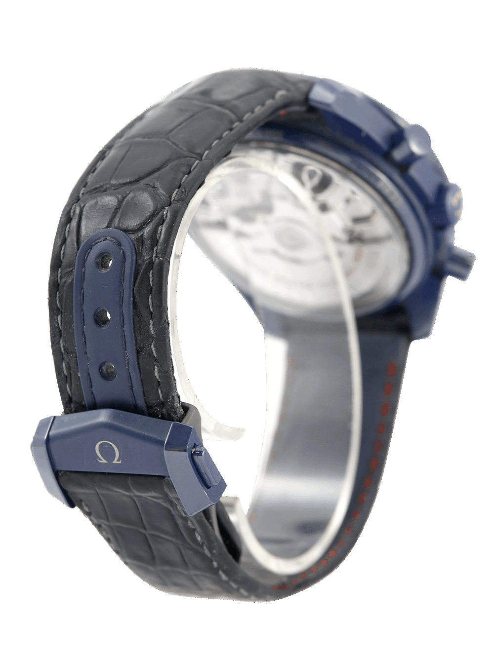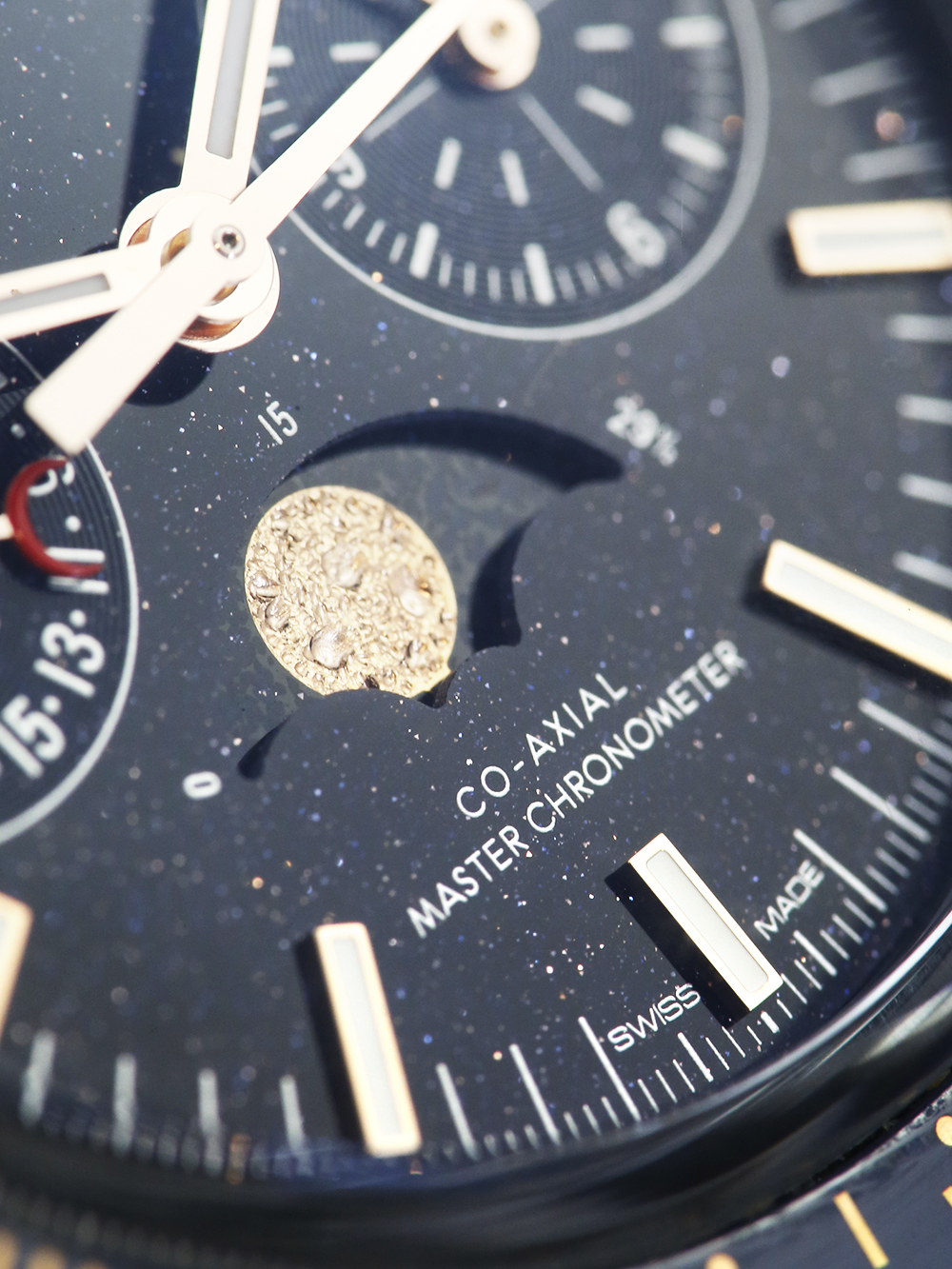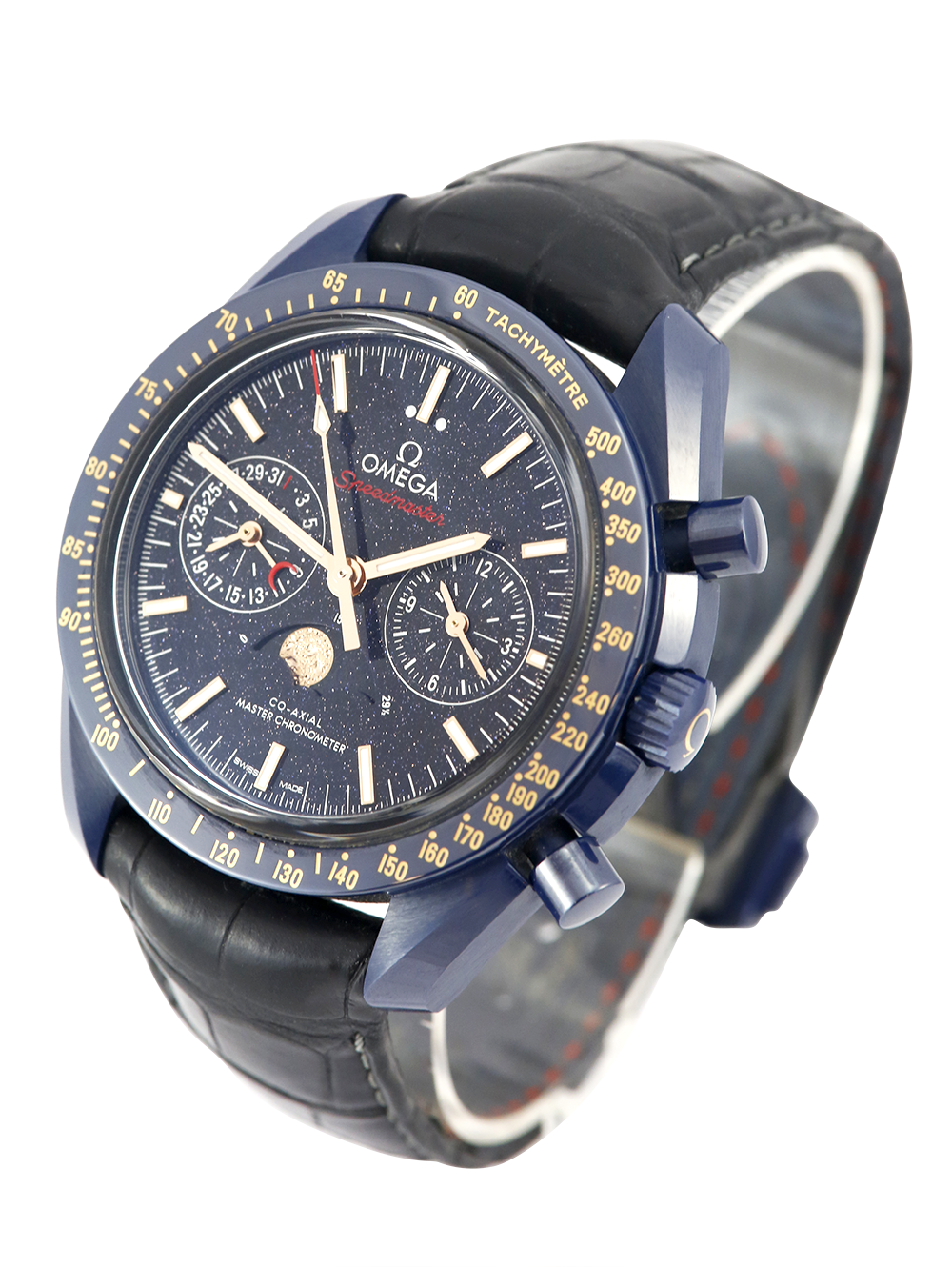 The 44.25 mm chronograph features a blue ceramic case complemented by a blue ceramic bezel ring with an OMEGA Ceragold tachymeter scale. Powering the timepiece is the OMEGA Master Chronometer Calibre 9904, certified at the industry’s highest standard by the Swiss Federal Institute of Metrology (METAS). Most vividly, the dial is blue aventurine glass and includes 18K Sedna gold indexes and hands as well as a date hand with red tip. At 6 o’clock is the accurate Moonphase indication, which features a blue enamel aventurine glass Moonphase disc (patent pending) with near and far sides of the moon in Sedna gold. It is presented on a blue leather strap with a blue ceramic and ceramised titanium foldover clasp.