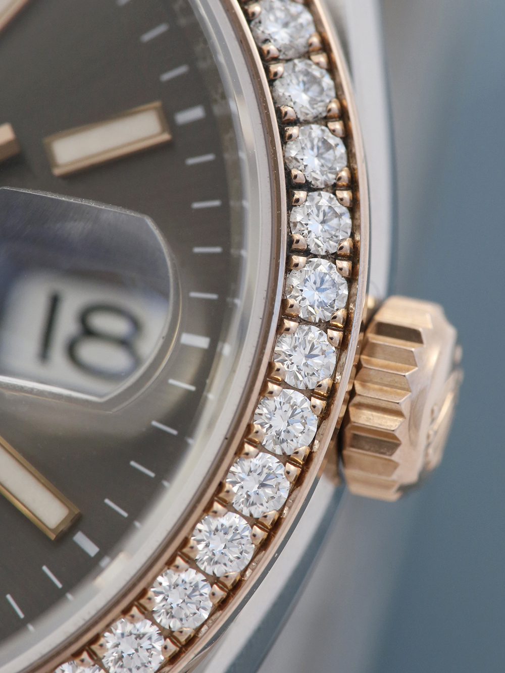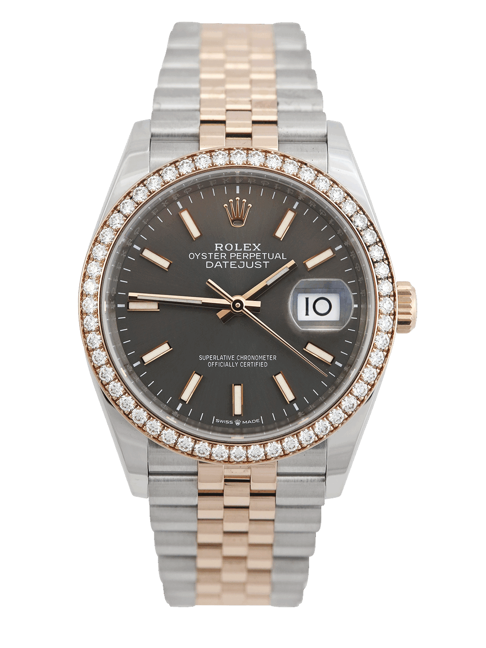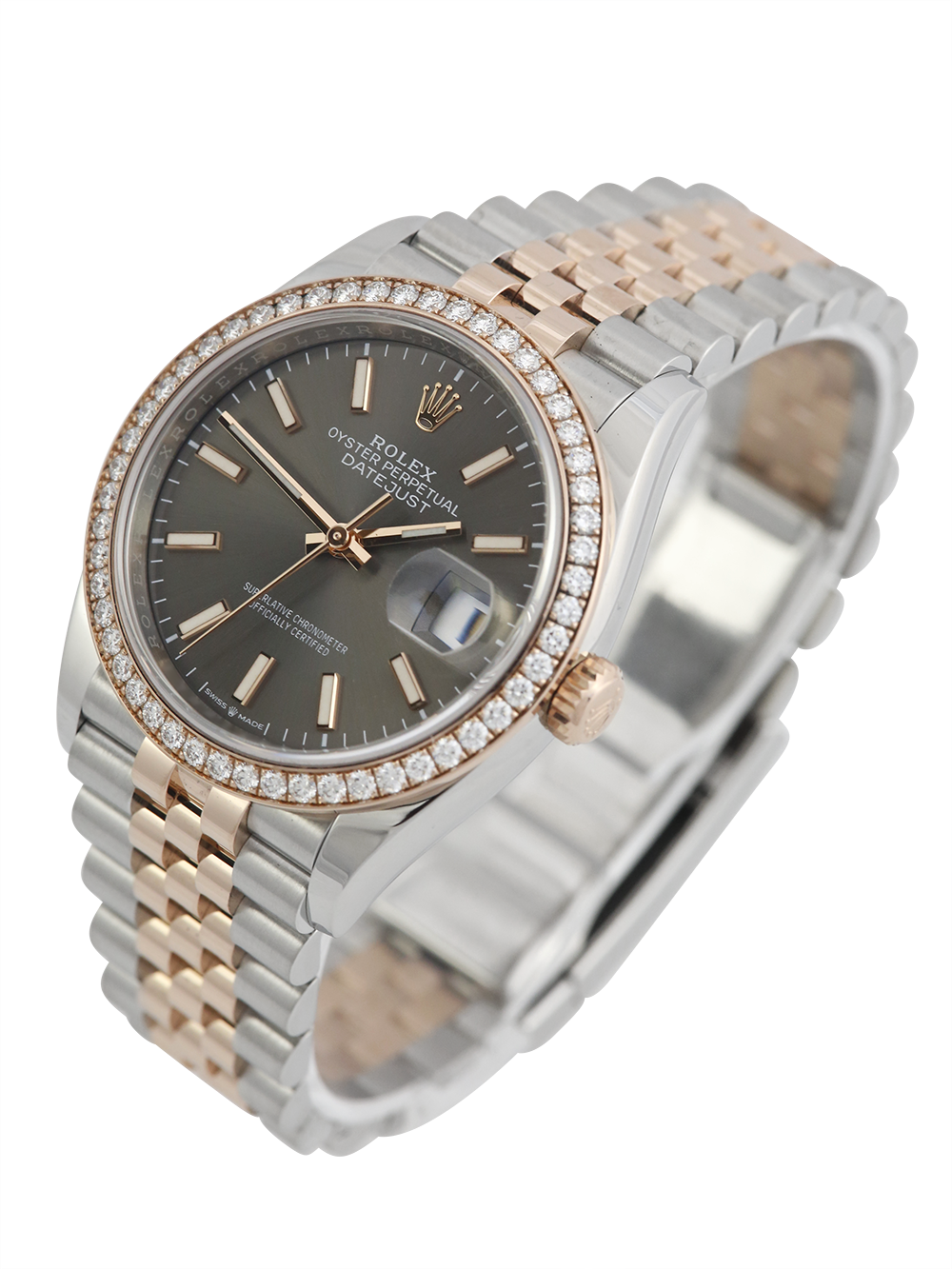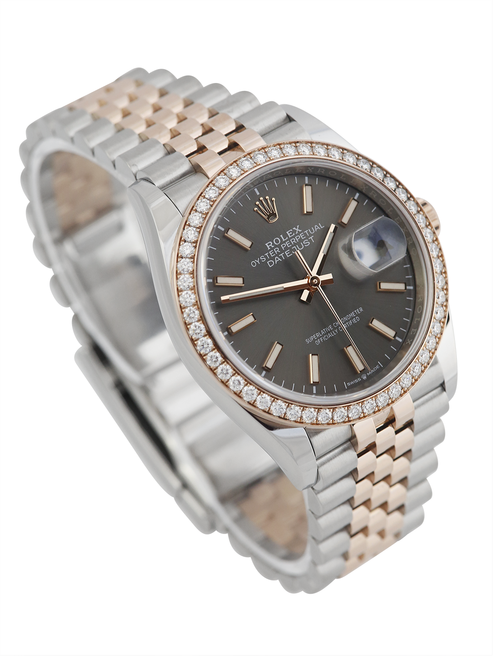 An excellent condition pre-owned stainless steel and rose gold chronometer certified automatic calibre 3235 movement 36mm case size Rolex Datejust model reference 126281RBR featuring a dark Rhodium baton dial housing a date aperture at 3 O’clock surrounded by a rose gold diamond set bezel on a full retail length stainless steel and rose gold Rolex Jubilee bracelet.