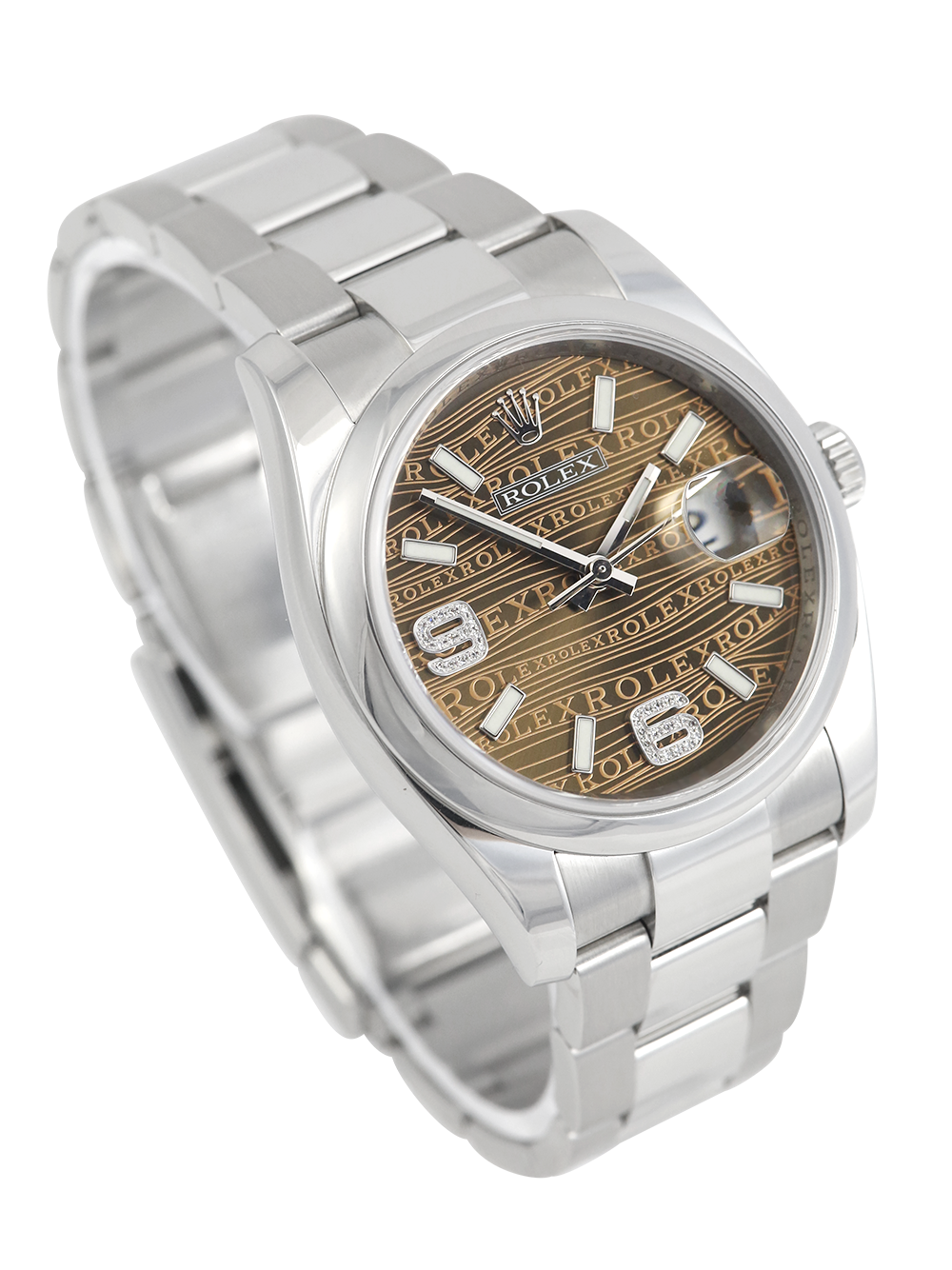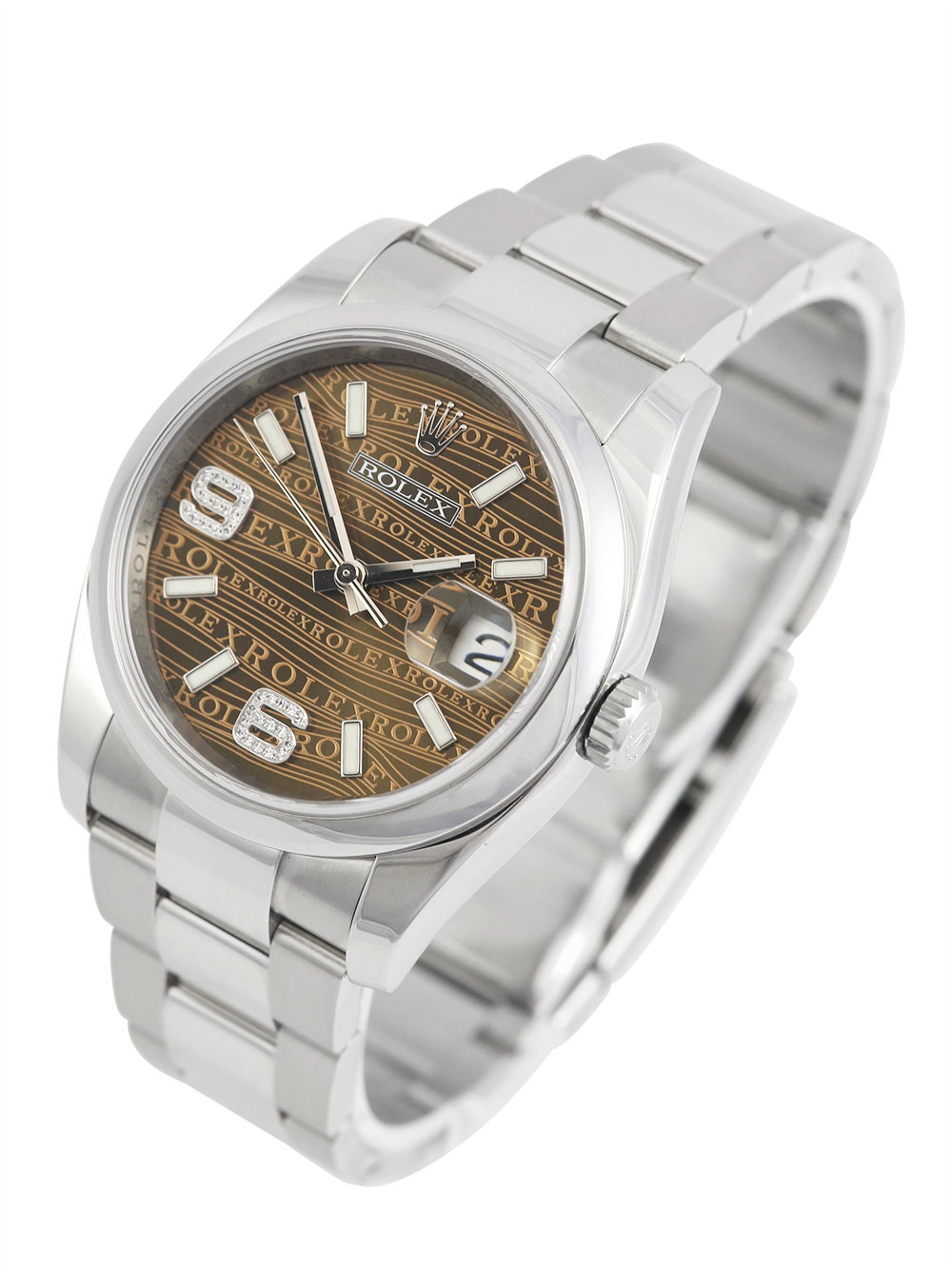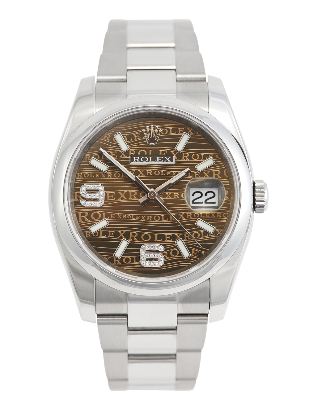 A previously owned, in excellent condition, superlative chronometer certified, automatic movement Rolex Datejust, model reference 116200. Featuring a 36mm stainless steel case, housing a unique bronze wave Jubilee dial with luminous indexes and 32 diamonds at numerals 6 and 9, as well as a aperture at 3 o’clock with an external cyclops. The dial is surrounded by a polished finish stainless steel domed bezel. Presented on a full retail length stainless steel Rolex Oyster bracelet with an Oysterclasp folding closure.