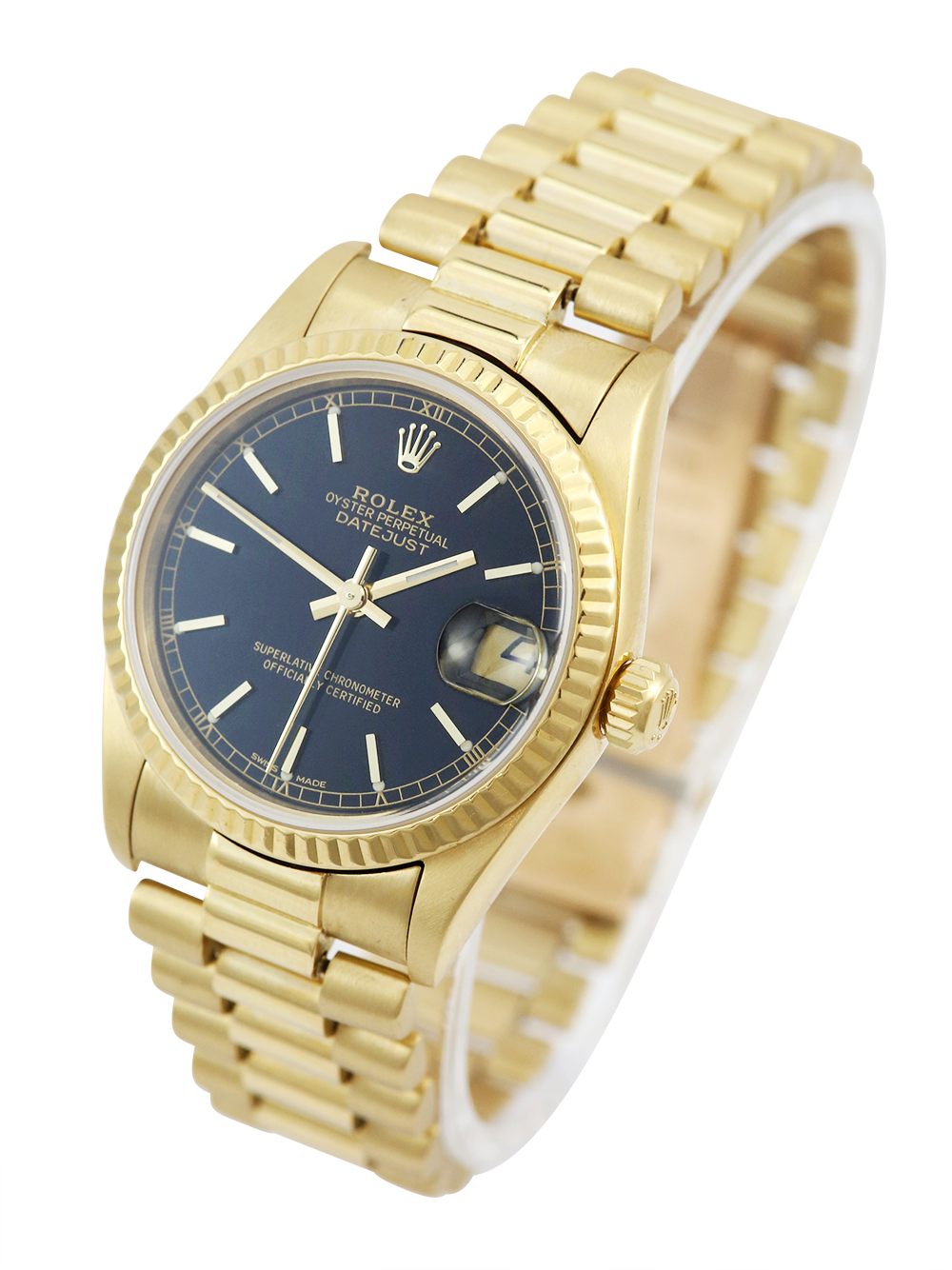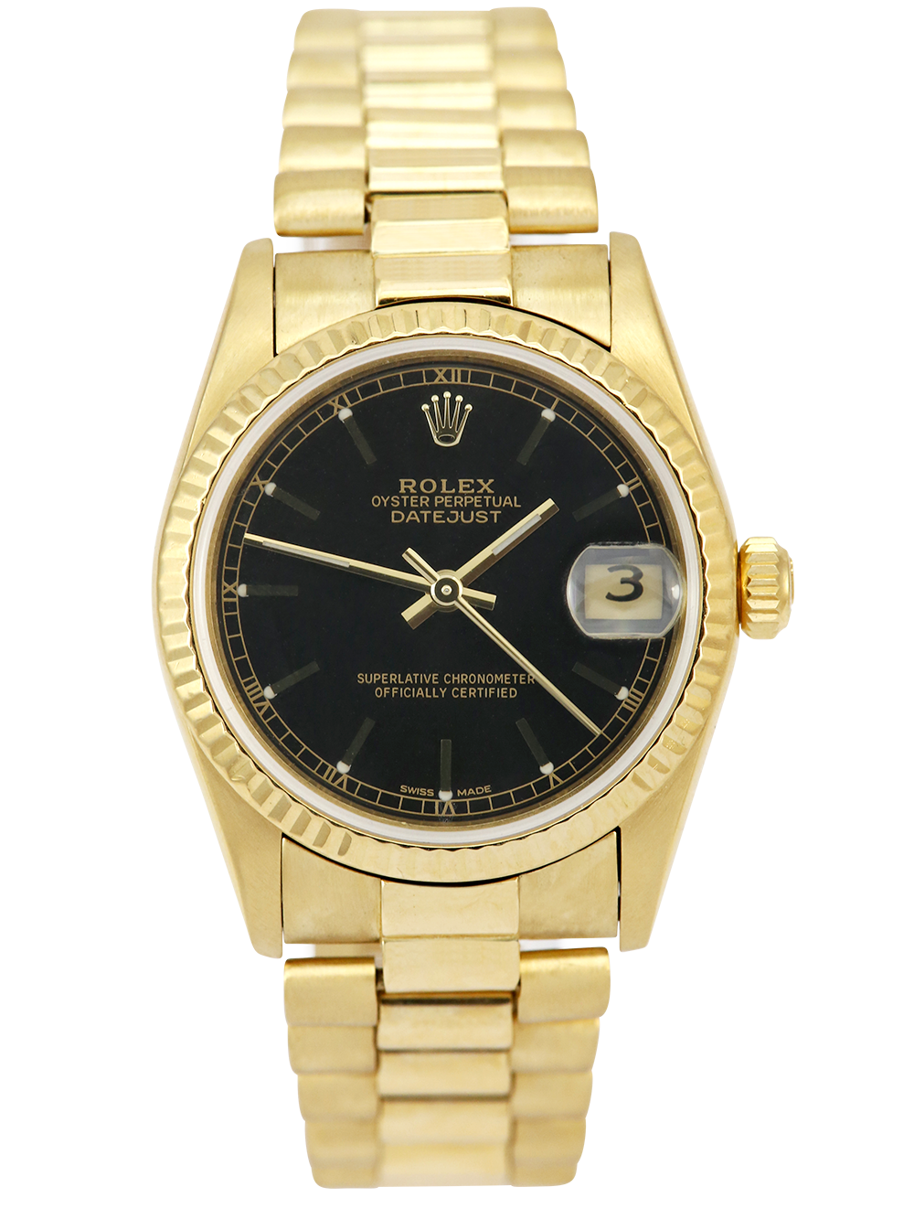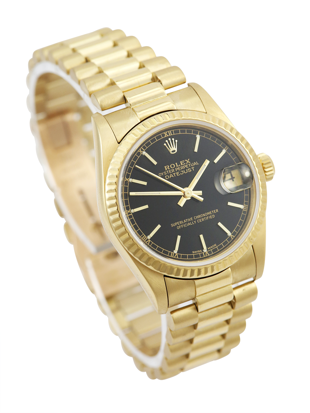 A pre-owned serviced by Rolex and unworn since a Rolex Datejust model reference 68278 housing an automatic movement in a 31mm size yellow gold case. Featuring a black dial with applied baton hour markers housing a sapphire crystal with a date window at 3 o’clock surrounded by yellow gold fluted bezel presented on a yellow gold Rolex president bracelet with a folding concealed clasp.