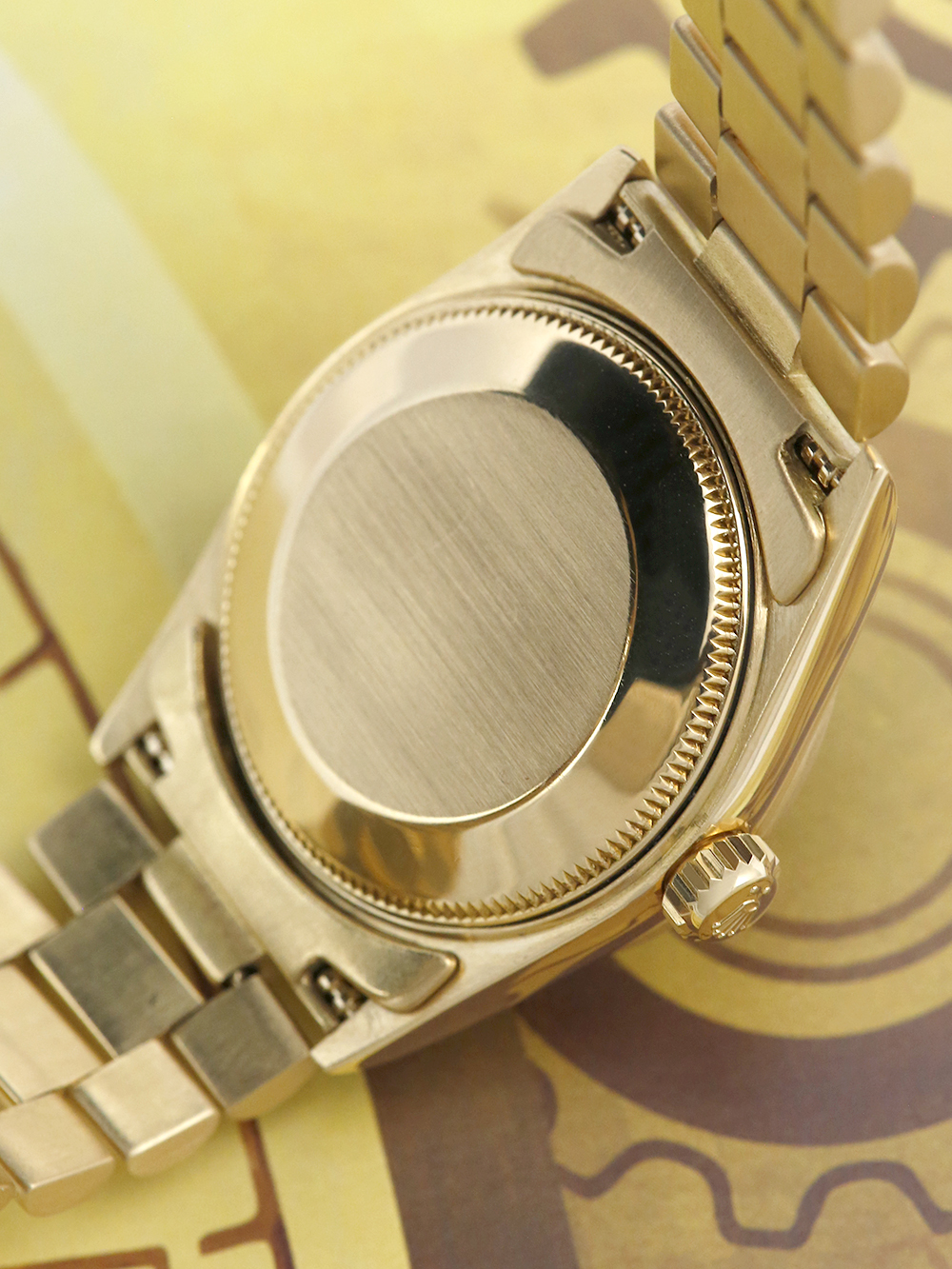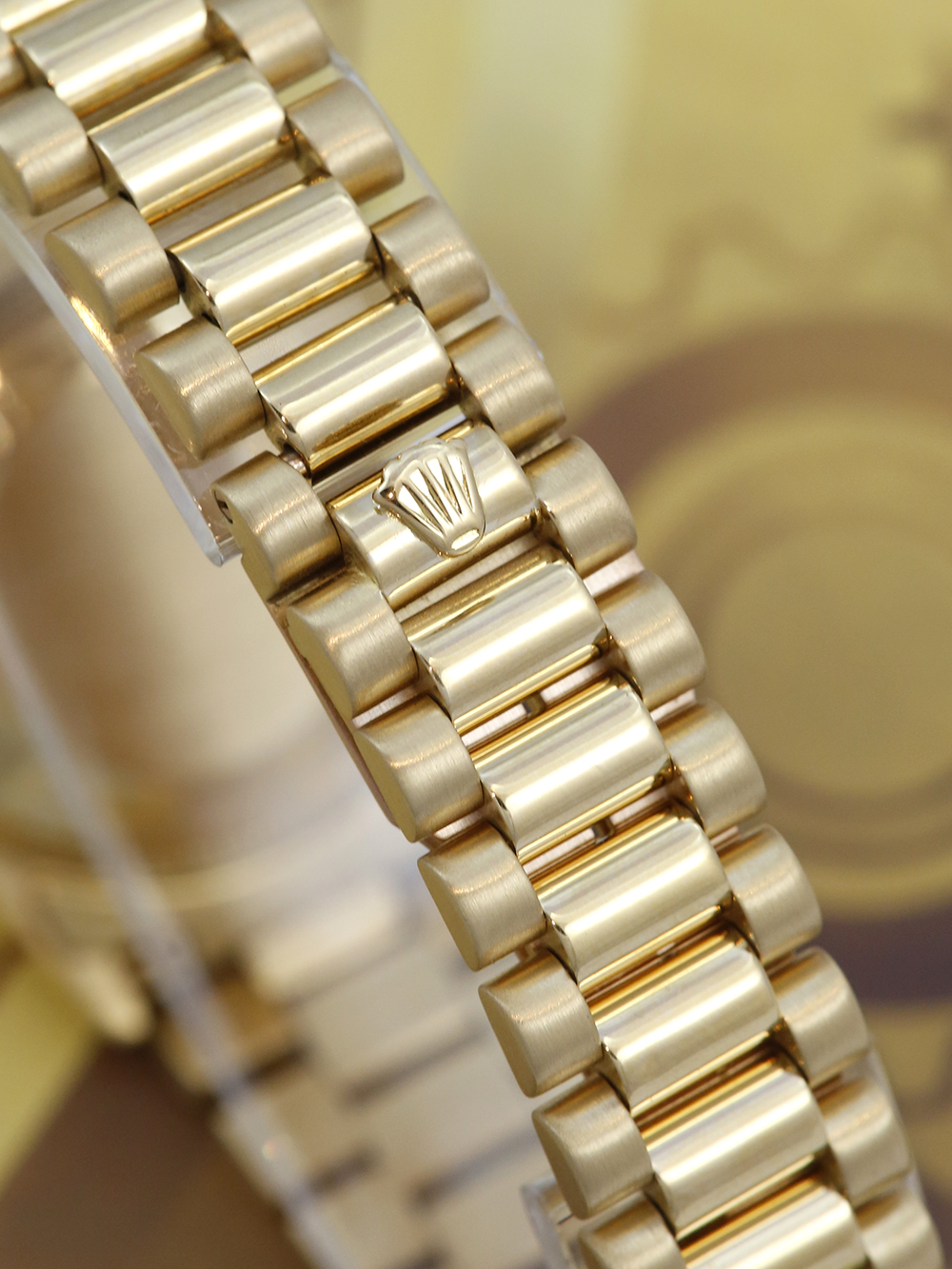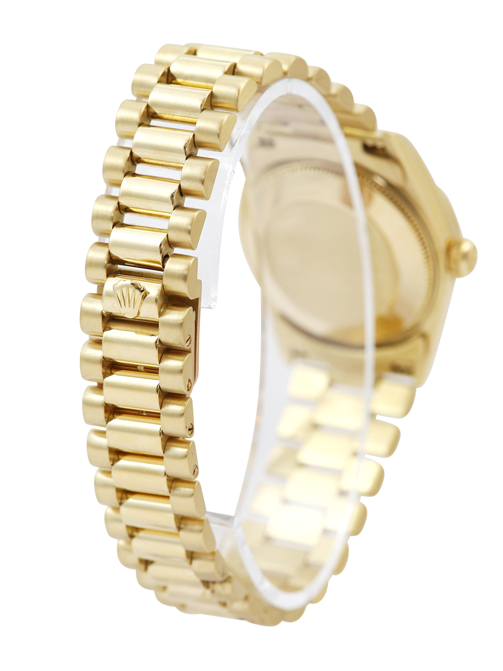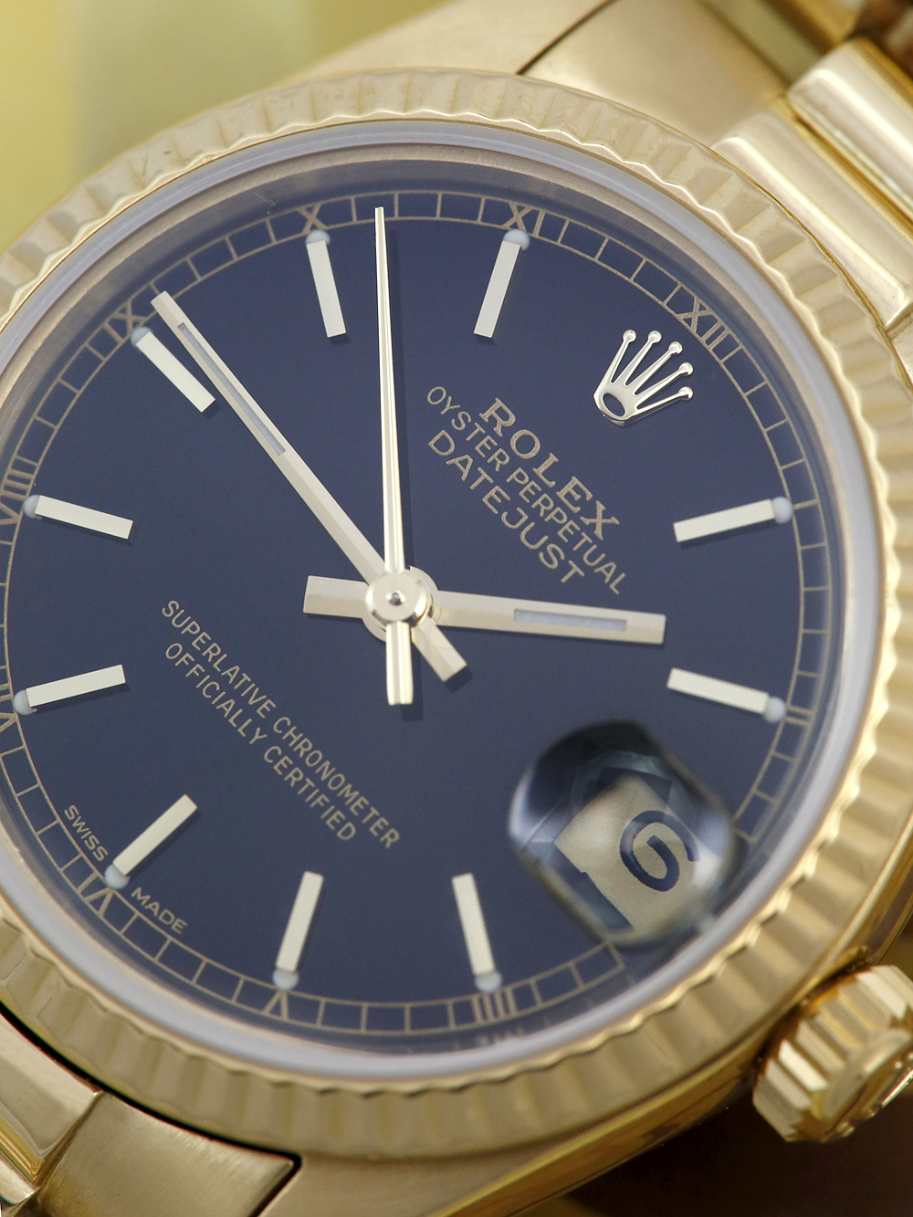 A pre-owned serviced by Rolex and unworn since a Rolex Datejust model reference 68278 housing an automatic movement in a 31mm size yellow gold case. Featuring a black dial with applied baton hour markers housing a sapphire crystal with a date window at 3 o’clock surrounded by yellow gold fluted bezel presented on a yellow gold Rolex president bracelet with a folding concealed clasp.