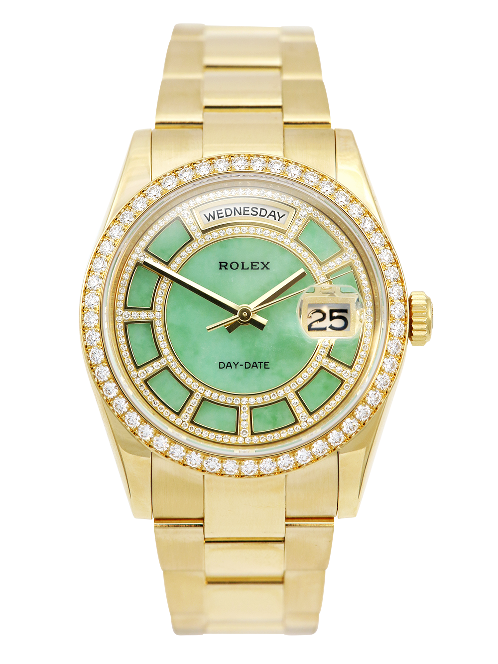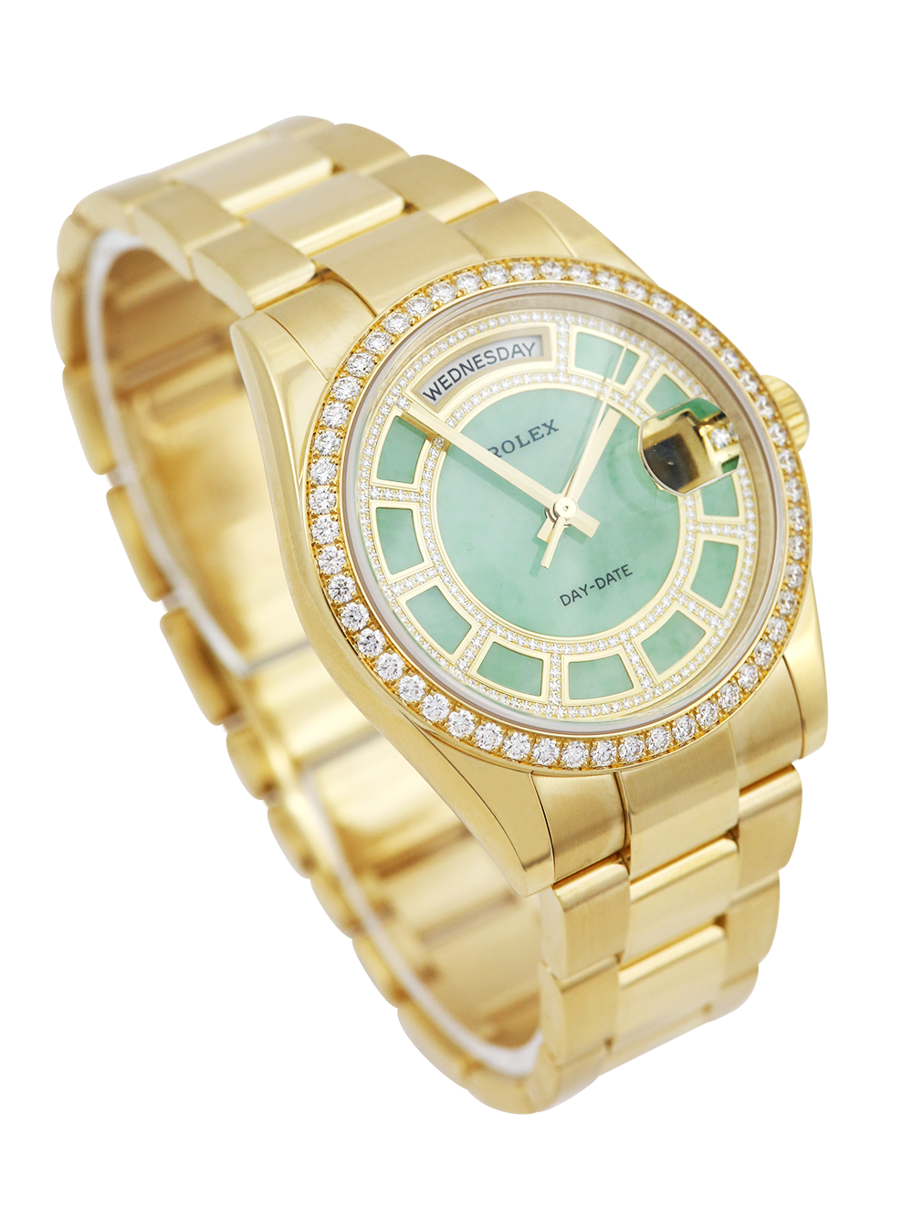 An excellent condition pre-owned yellow gold chronometer rated automatic movement 36mm case size Rolex Day-Date model reference 118348 featuring a very rare green jade carousel dial mounted with 217 diamonds. housing an external Cyclops date aperture at 3 O’clock and a day aperture in-between 11 & 1 O’clock. The dial is surrounded by a factory set round brilliant cut Diamond bezel and the watch comes on a full retail length yellow gold Rolex oyster bracelet with a folding concealed clasp.