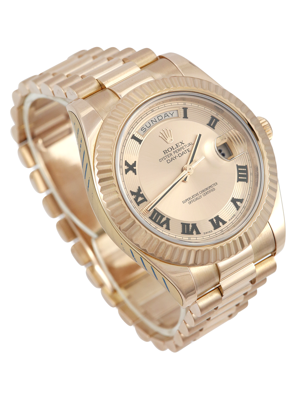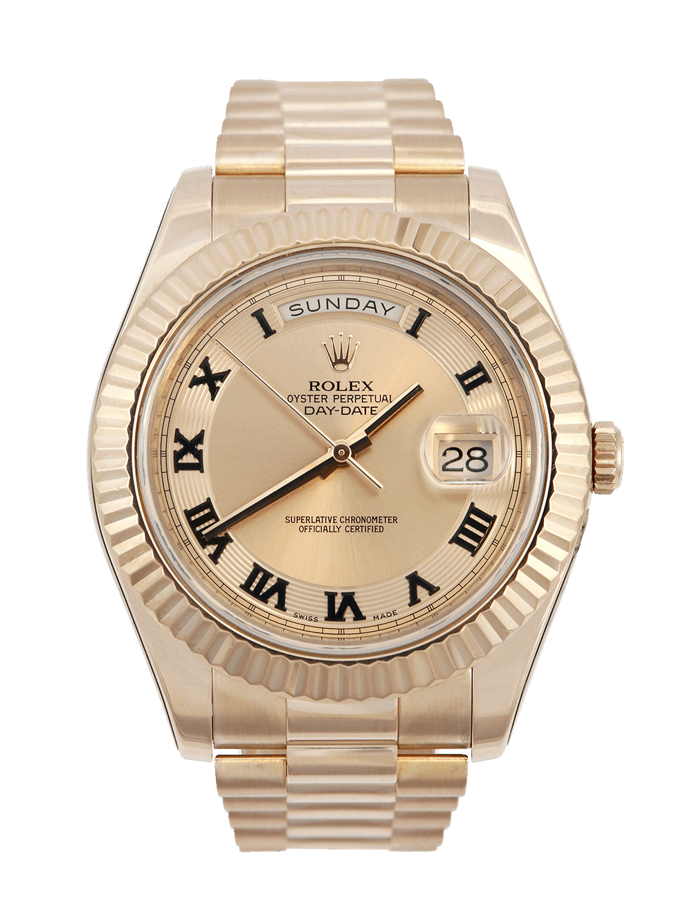 An excellent condition pre-owned rose gold chronometer certified automatic movement 41mm Rolex Day-Date II 218235 featuring a pink concentric with black roman numerals dial housing an external Cyclops date aperture at 3 O’clock and a day aperture in-between 11 & 1 O’clock surrounded by a rose gold fluted bezel. All presented on a rose gold Rolex President bracelet.