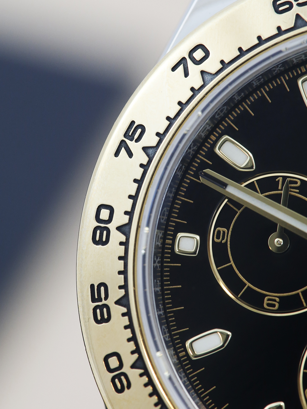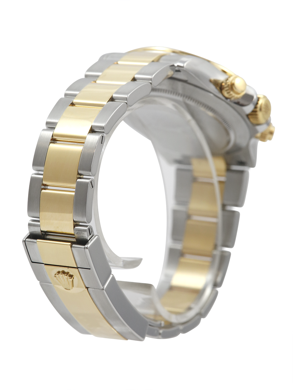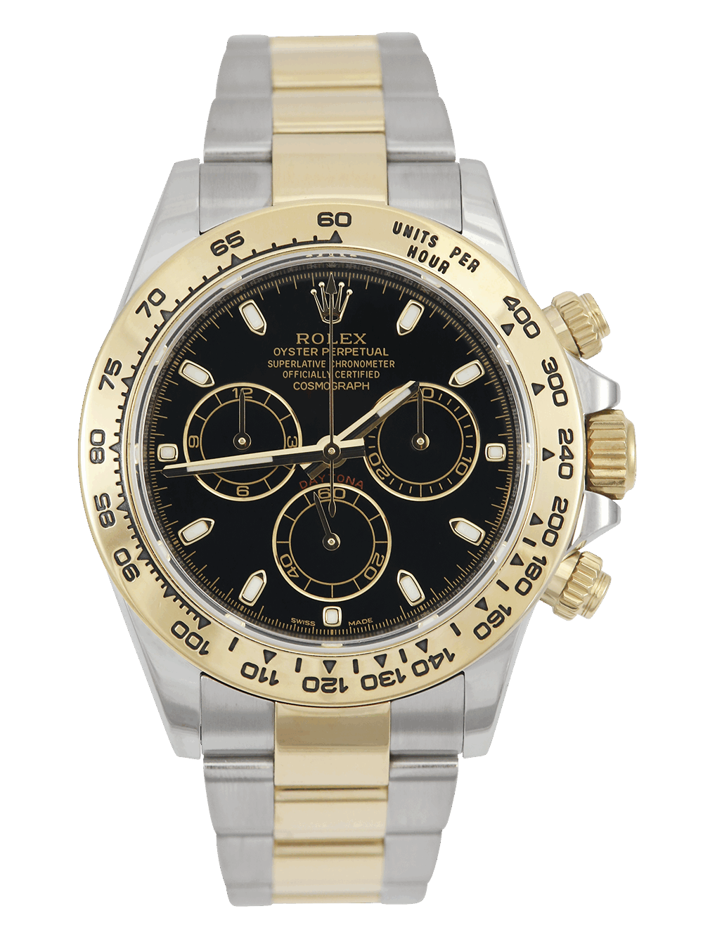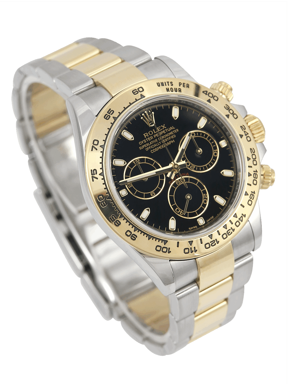 A pre-owned in pristine condition chronometer certified, automatic movement Rolex Daytona model reference 116503. Featuring a 40mm bimetal stainless steel and yellow gold case, housing a black dial with three black sub-dials. The dial is surrounded by a yellow gold units per hour tachymeter bezel. All presented on a full retail length stainless steel and yellow gold Rolex Oyster bracelet with a secure Oysterlock folding clasp.