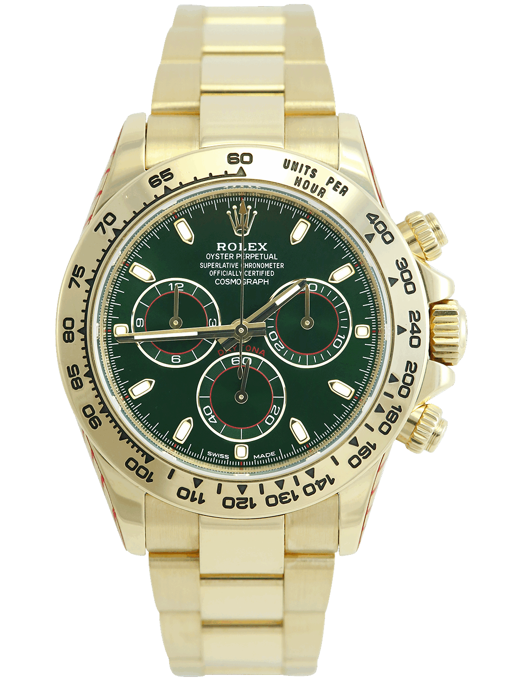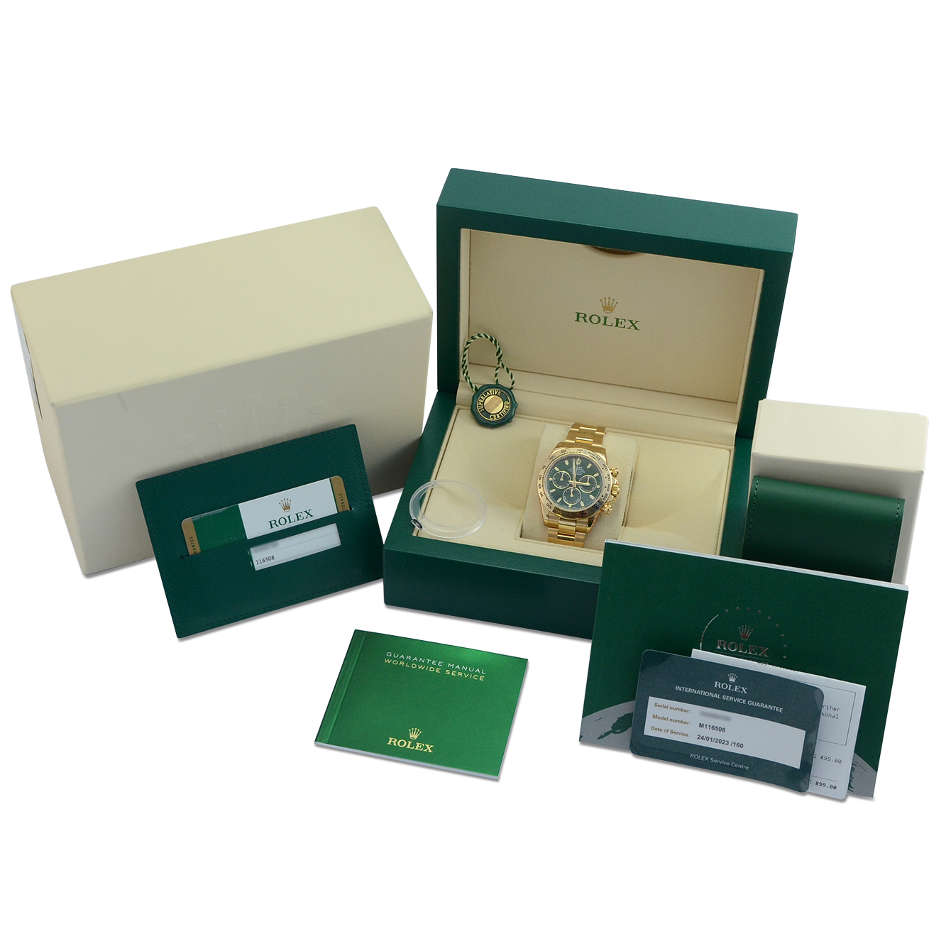 Rolex Daytona 116508 Yellow Gold Green Dial Serviced by Rolex Unworn Since Service Stickers