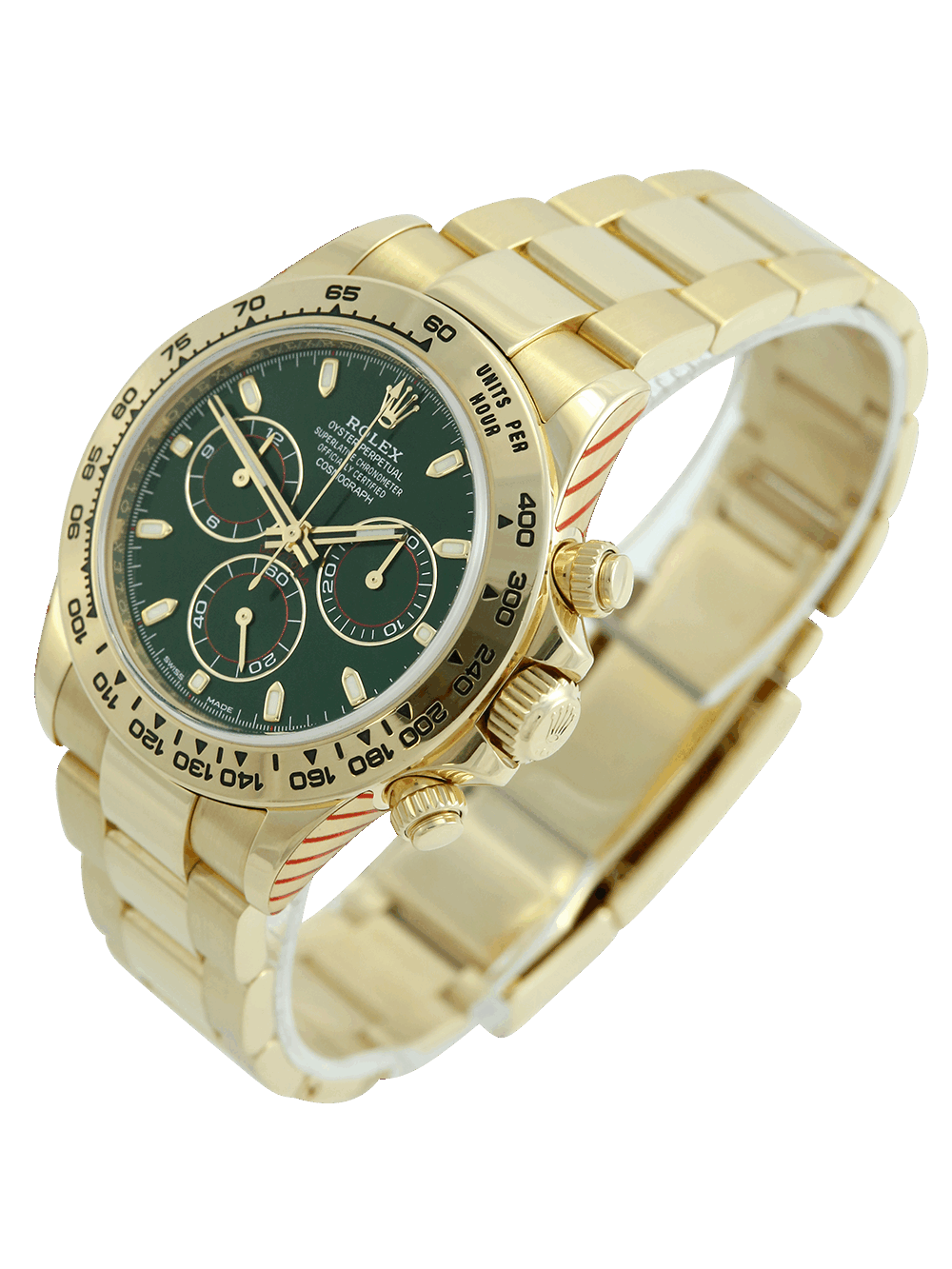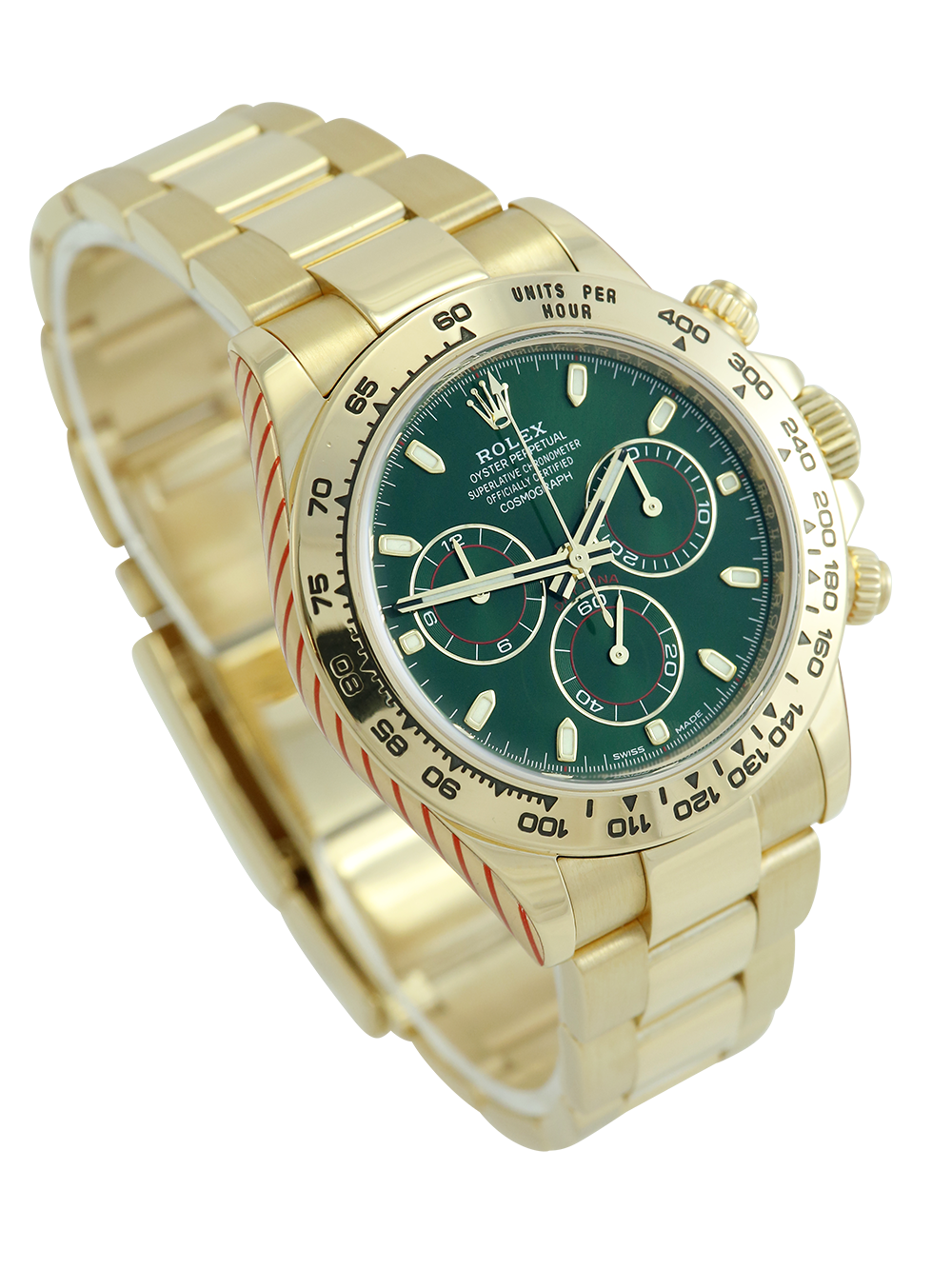 A prefect condition pre-owned 40mm case size yellow gold superlative chronometer, calibre 4130, automatic movement Rolex Daytona model reference 116508 featuring a green baton dial with gold outlined green sub-dials housing red inner rings. The 6 o’clock sub-dial has the word Daytona written in red above it and the dial is surrounded by a yellow gold units per hour bezel. This particular watch comes on a full retail length yellow gold Rolex Oyster bracelet.