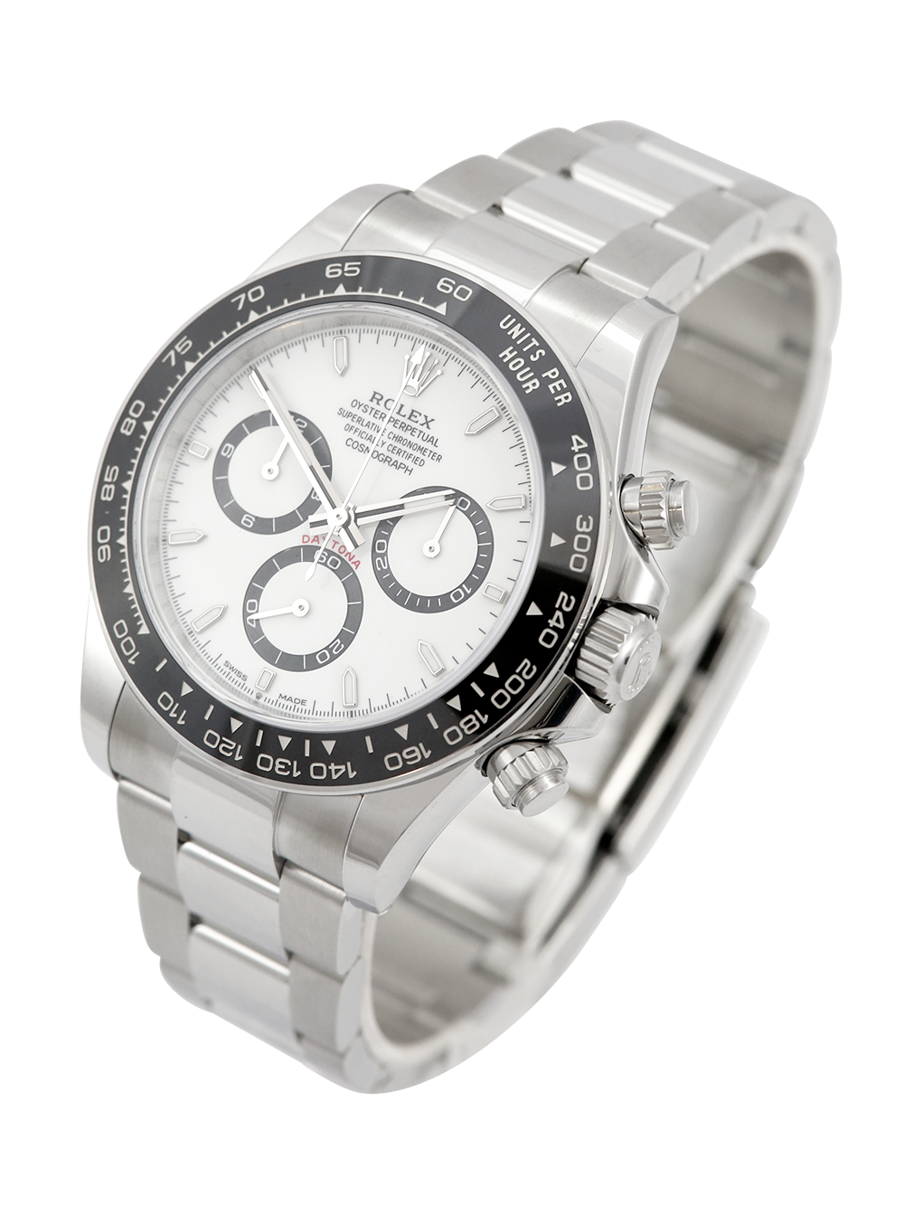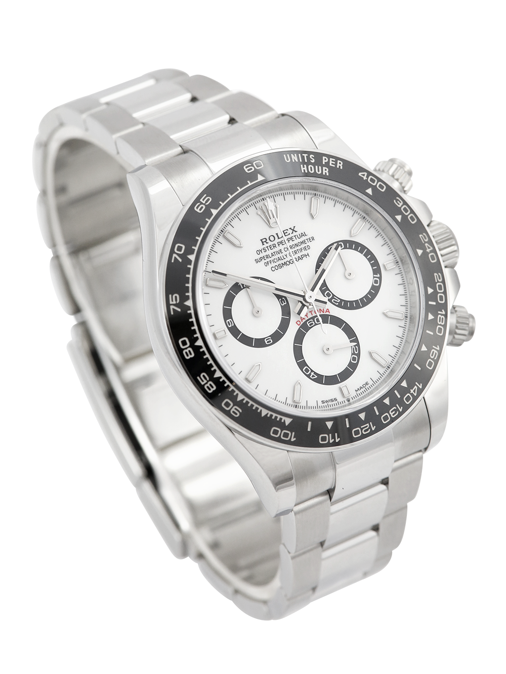 As mentioned above a brand new, unworn and unsized stainless steel 40mm case size superlative chronometer, the latest calibre 4131 automatic movement Rolex Daytona model reference 126500LN featuring a white baton dial housing black-rimmed white sub-dials surrounded by a black ceramic units per hour bezel on a full retail length stainless steel Rolex Oyster bracelet.
