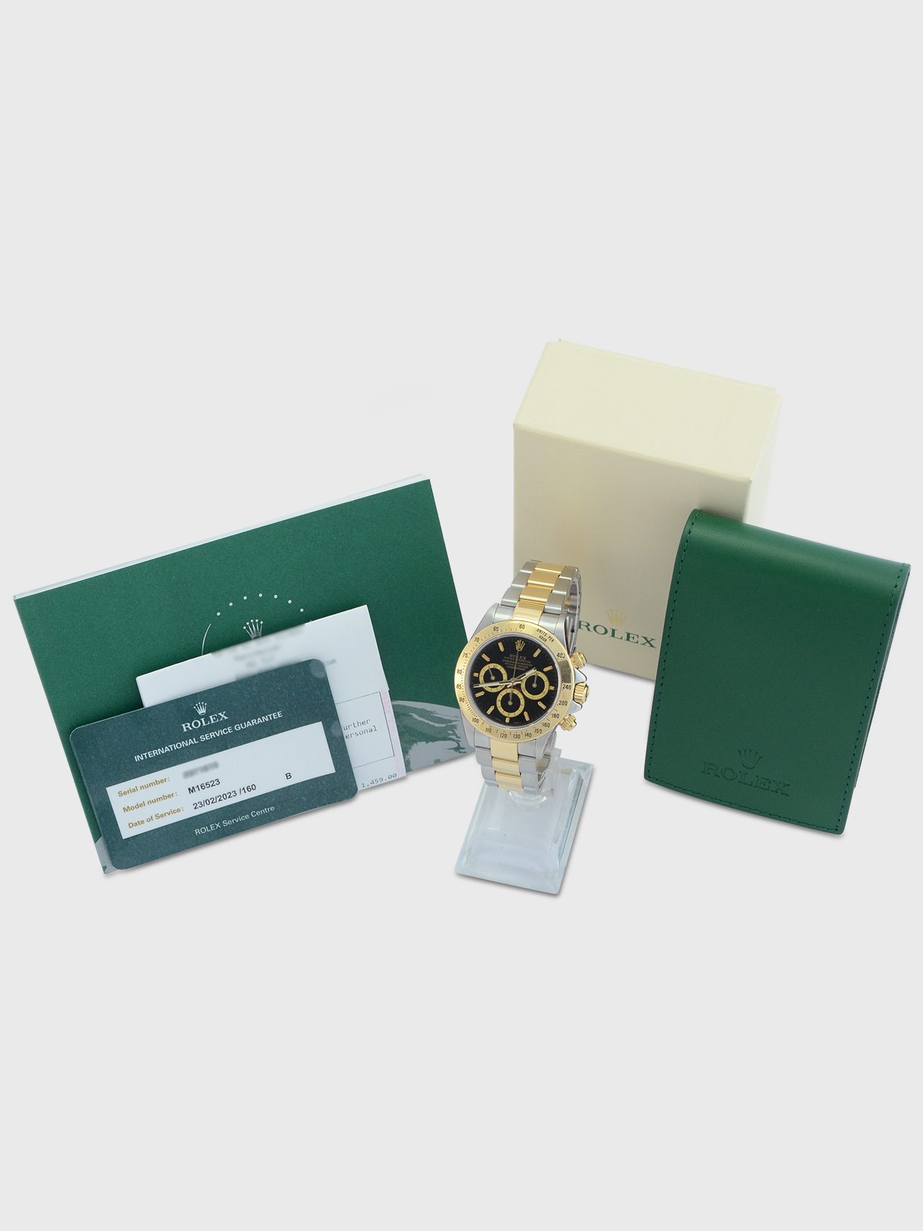 As shown in the detailed images this Rolex serviced watch is supplied with the original new style Rolex service box, the original new style Rolex service pouch, the Rolex service warranty booklet, the Rolex service invoice and the Rolex service warranty card dated February 2023.