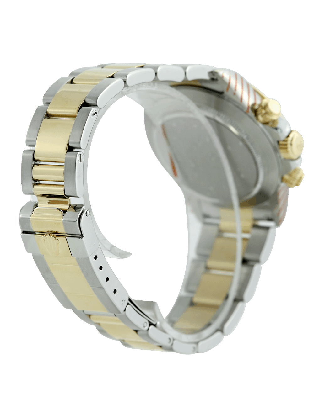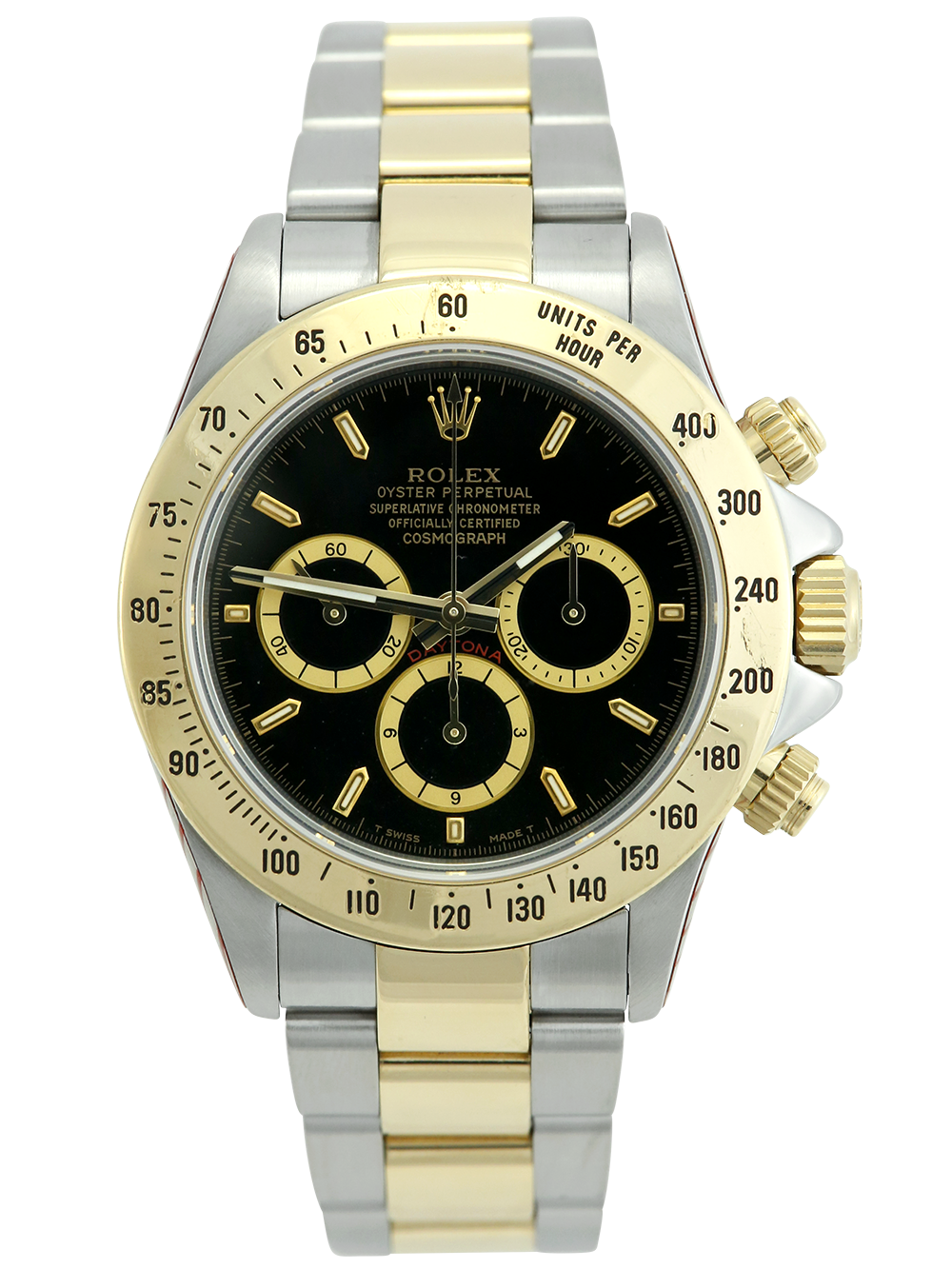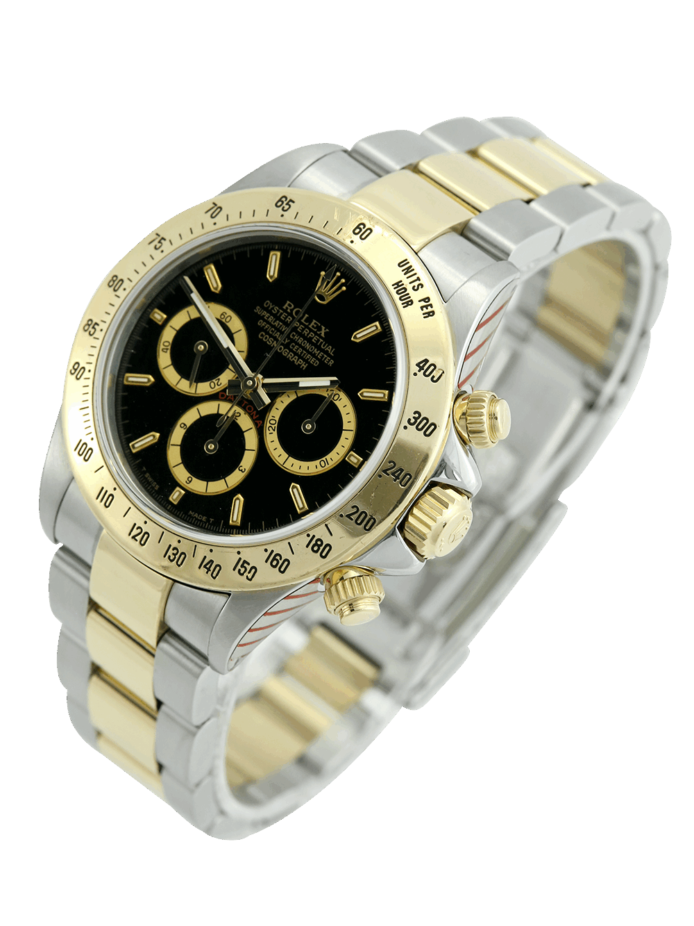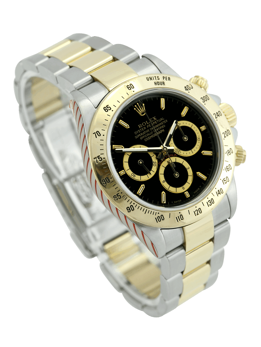An excellent condition pre-owned stainless steel and yellow gold bi-metal chronometer certified automatic movement Rolex ‘Zenith’ Daytona model reference 16523 featuring a black baton dial with gold outlined black sub-dials surrounded by a yellow gold units per hour bezel on a full retail length stainless steel and yellow gold Rolex Oyster bracelet.