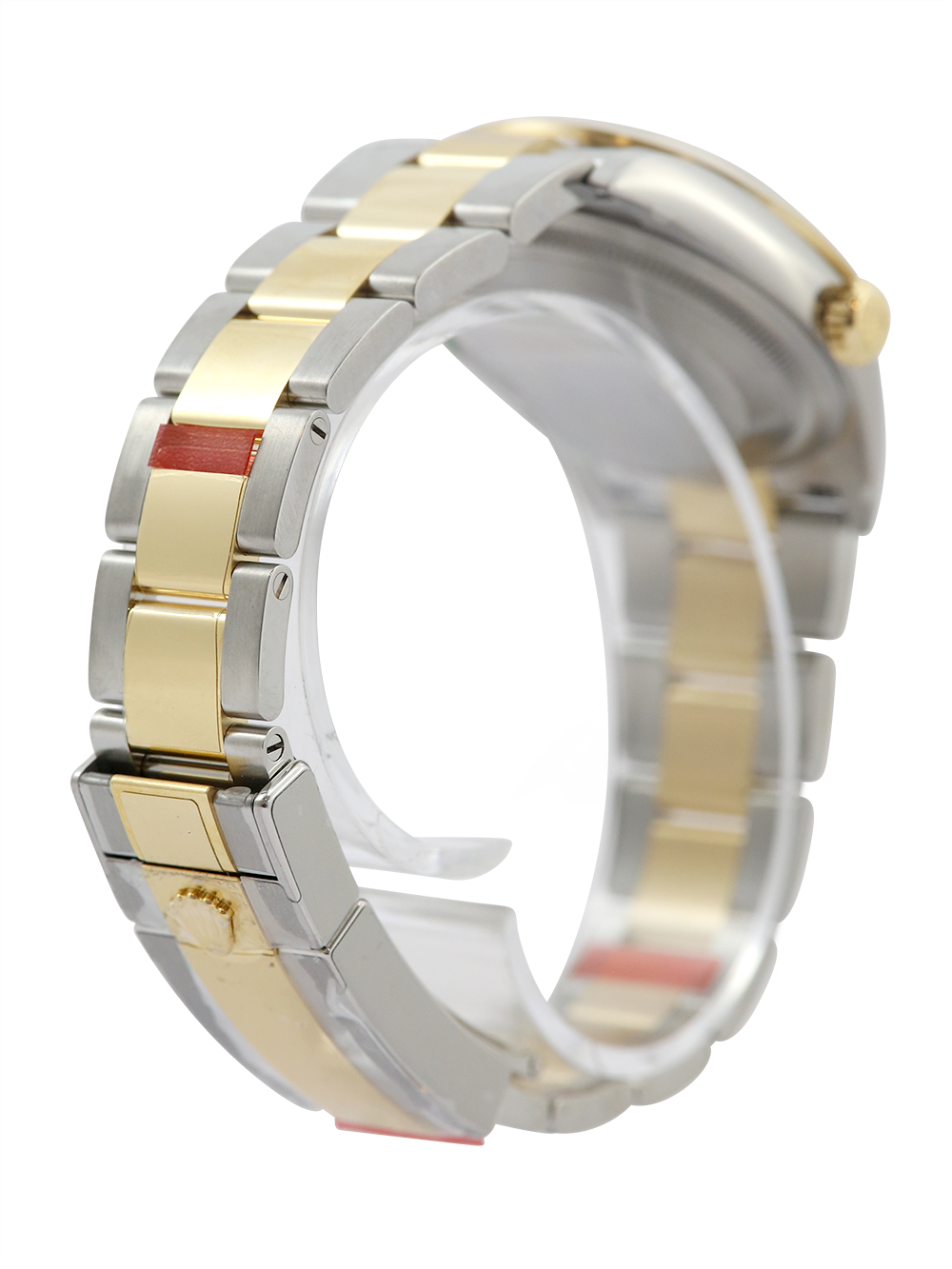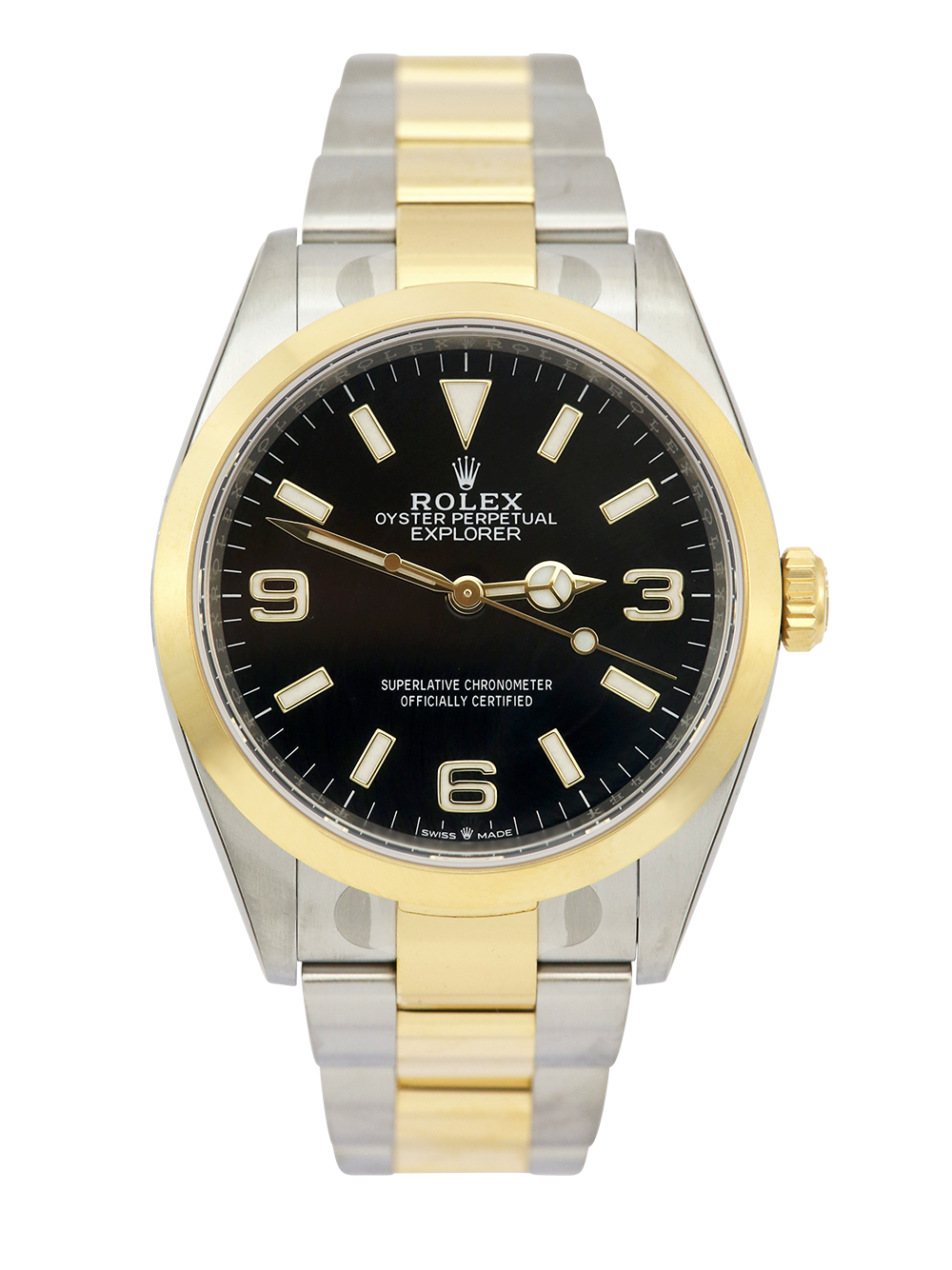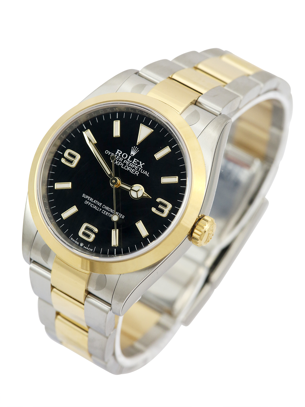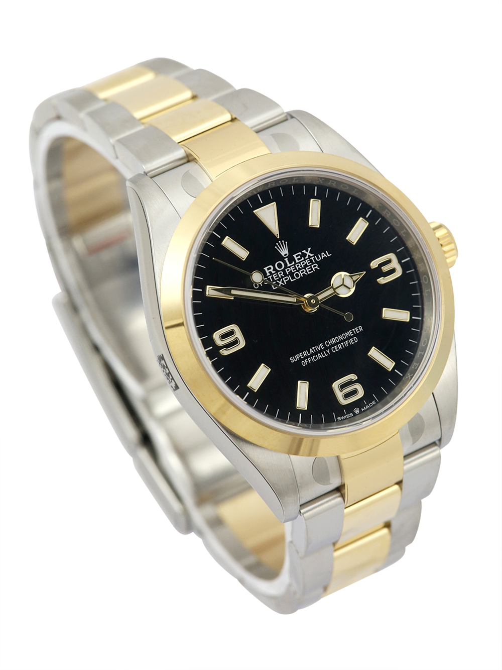 As mentioned above this unworn and unsized with full factory stickers intact a Oystersteel and yellow gold superlative chronometer, calibre 3230 automatic movement 36mm case size Rolex Explorer I model reference 124273 featuring a black baton dial with luminous Arabic numerals for 3,6 & 9 surrounded by a yellow gold polished finish domed bezel on a full retail length Oystersteel and yellow gold Rolex Oyster bracelet.