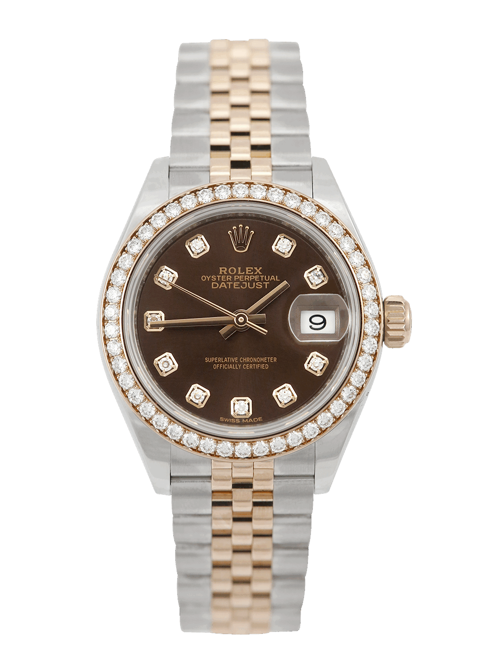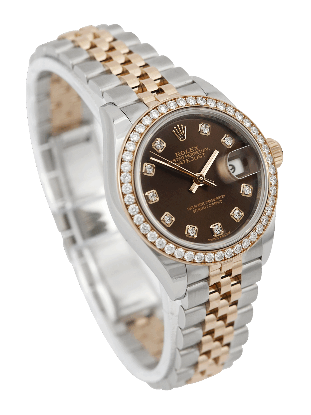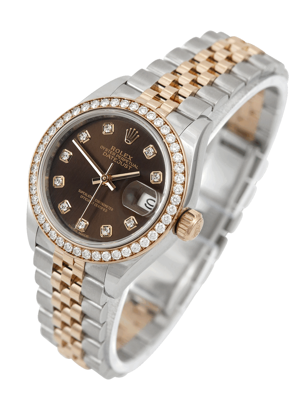 An excellent condition pre-owned unworn stainless steel and rose gold chronometer certified automatic movement 28mm case size Rolex Lady Datejust model reference 279381RBR featuring a chocolate diamond dot dial housing a date aperture at 3 O’clock surrounded by a factory set rose gold diamond bezel on a full retail length stainless steel and rose gold Rolex Jubilee bracelet.
