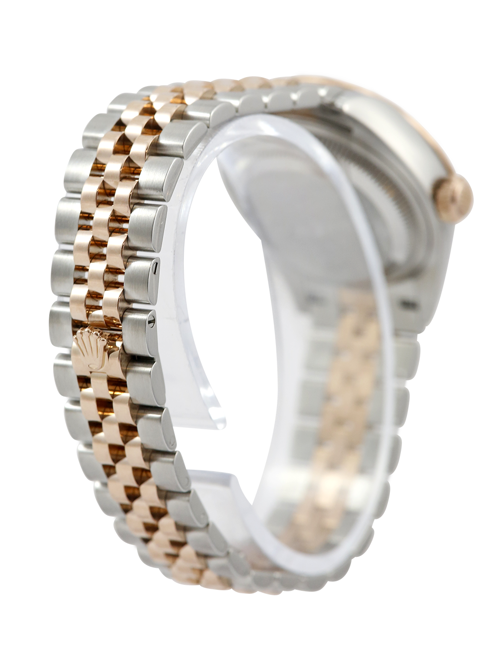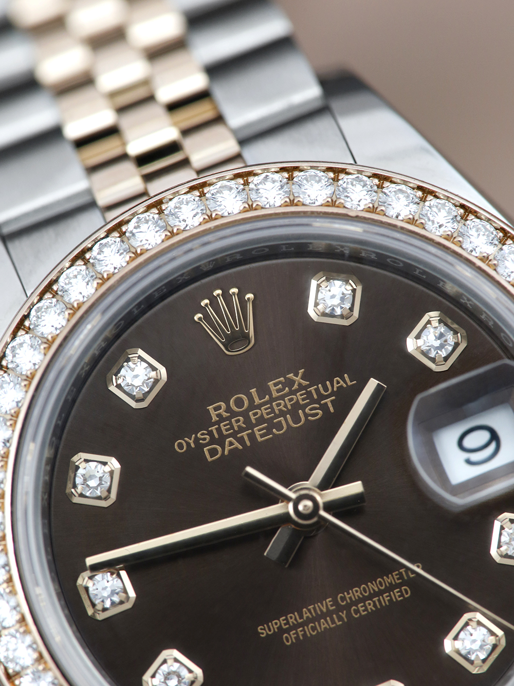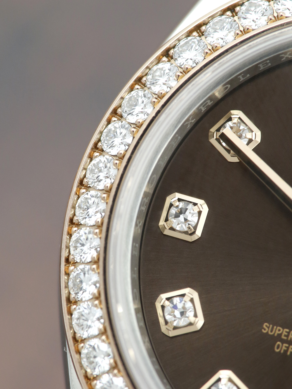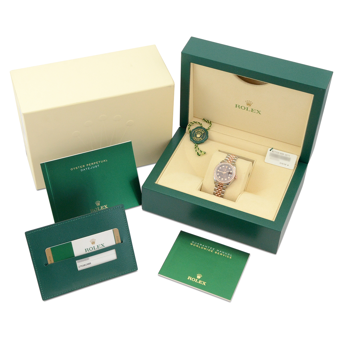 An excellent condition pre-owned unworn stainless steel and rose gold chronometer certified automatic movement 28mm case size Rolex Lady Datejust model reference 279381RBR featuring a chocolate diamond dot dial housing a date aperture at 3 O’clock surrounded by a factory set rose gold diamond bezel on a full retail length stainless steel and rose gold Rolex Jubilee bracelet.
