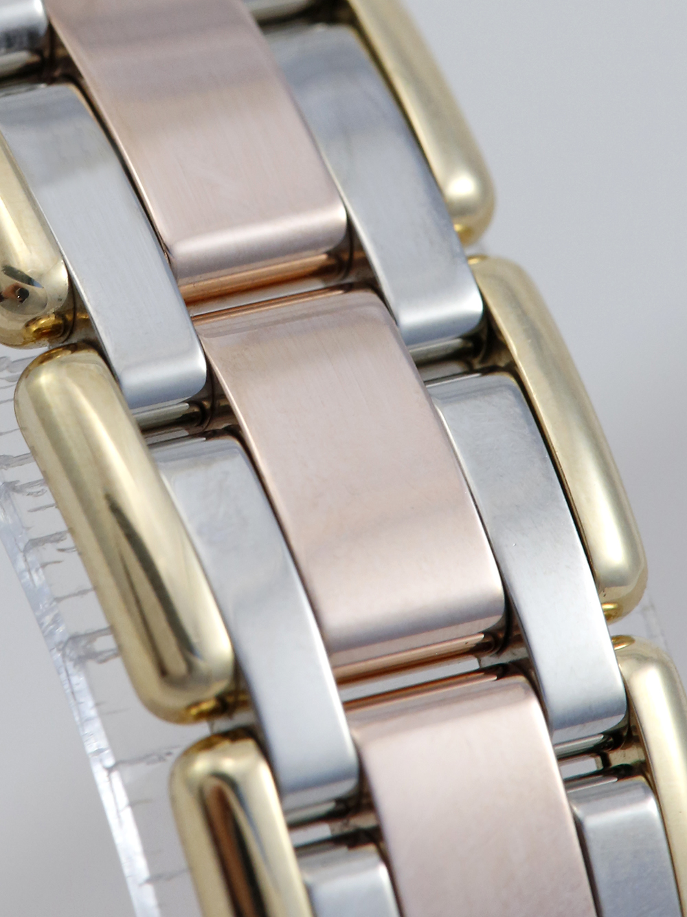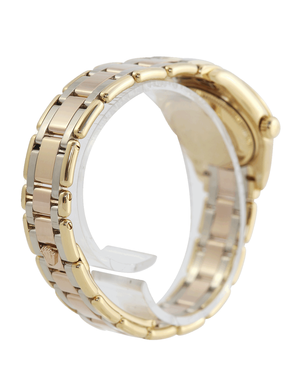 A pre-owned, excellent condition Rolex Pearlmaster model reference 80328 Tridor Three-Colour Gold wristwatch. A yellow gold 29mm case housing a stunning white mother of pearl dial with diamond hour markers a date display at 3 o’clock with a smooth bezel and a single diamond set at the 12 o’clock point on the bezel all presented on a full retail length three colour gold (18k rose, yellow & white gold) ‘Tridor’ Oyster II bracelet with a concealed clasp, sapphire crystal glass, automatic movement and waterproof up to 100m.