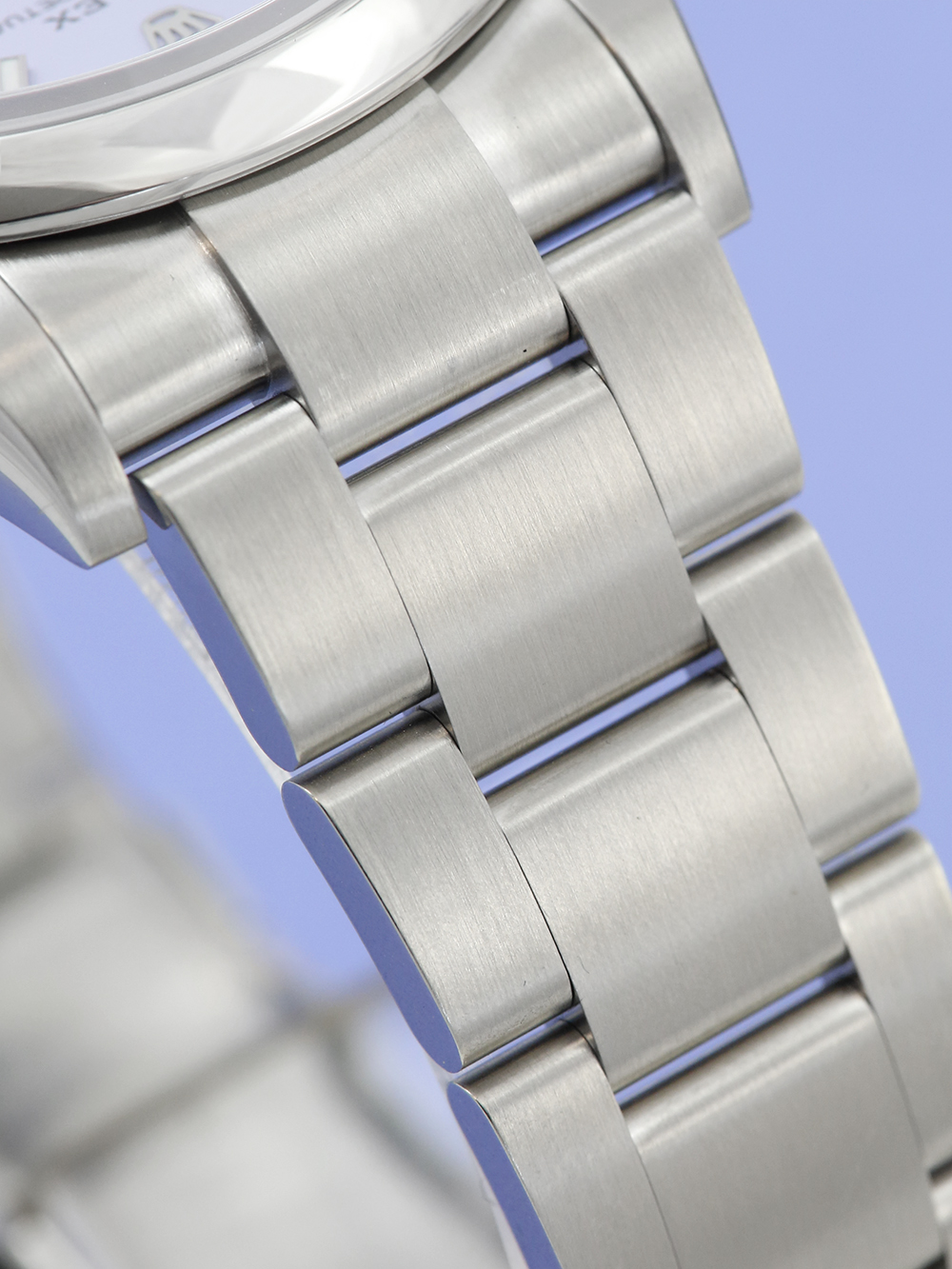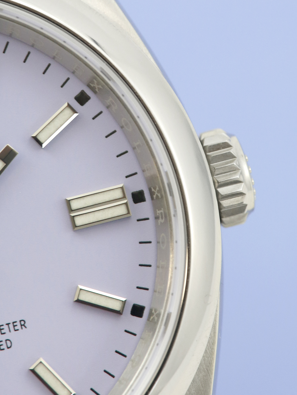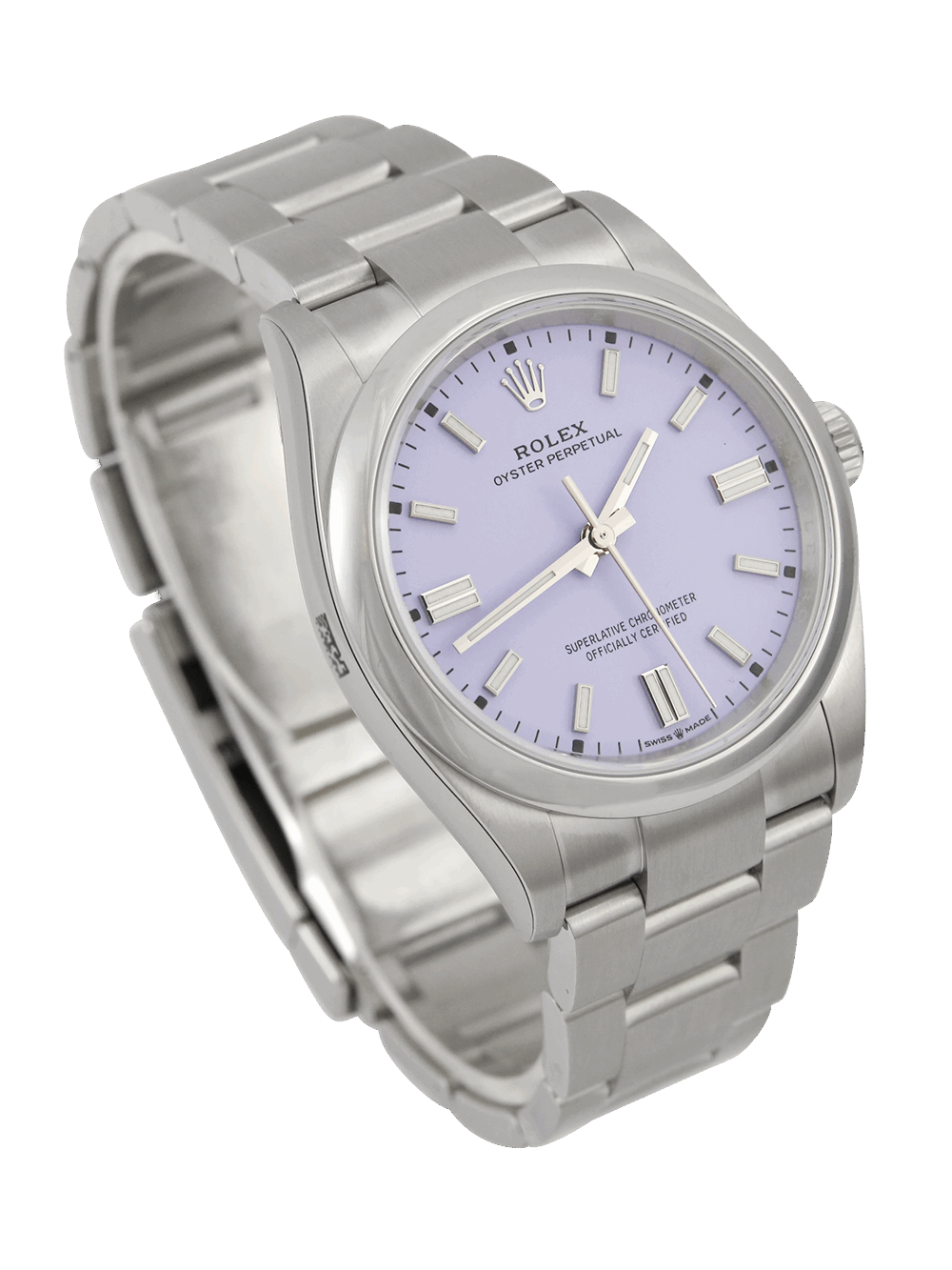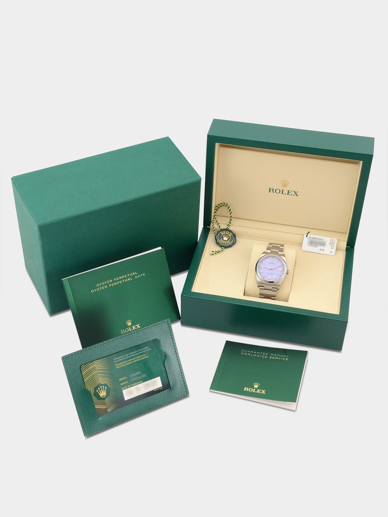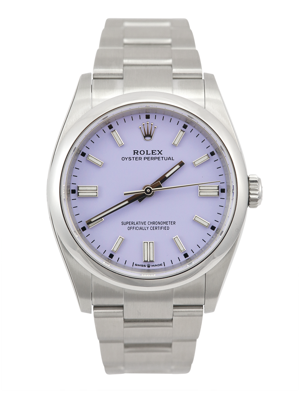 A brand new and unsized chronometer certified, automatic movement Rolex Oyster Perpetual model reference 126000. Featuring a 36mm stainless steel case, housing a Lavender dial with raised luminous batons. The dial is surrounded by a polished finish stainless steel domed bezel and protected by a scratch resistant sapphire crystal. All presented on a full retail length stainless steel Rolex Oyster bracelet with an Oysterclasp.