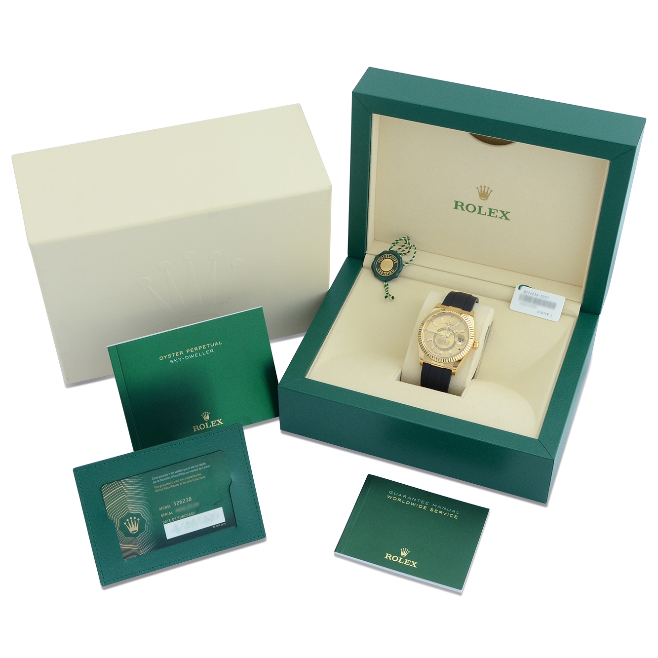 This particular watch is supplied as shown in the detailed images with the original till receipt, the outer box sleeve, both of the Rolex inner and outer boxes, two Rolex swing tags, two Rolex manuals, the Rolex warranty card holder and Rolex warranty card. The card is dated September 2021 when first supplied new in the UK.