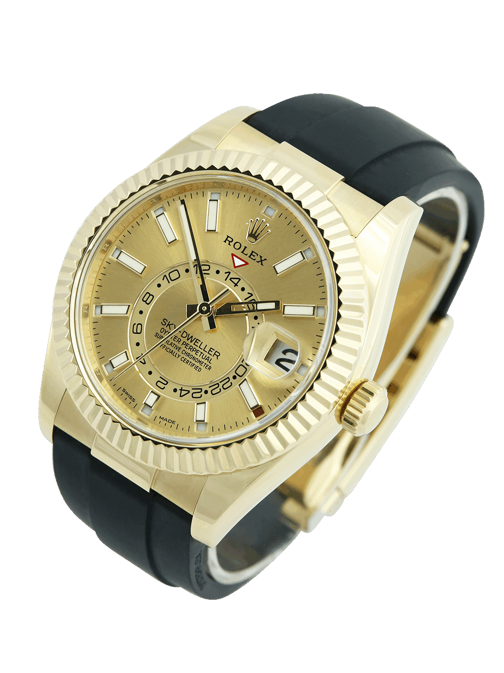 This Rolex Sky-Dweller 326238 was acquired from the original owner and it is presented for sale in an excellent pre-owned condition. It features a 42mm yellow gold case in Oyster technology, which together with the Twinlock screw-down crown ensures the highest standard of waterproofness. The champagne dial is populated by gold-outlined luminous baton hour markers, protected by scratch-resistant sapphire glass and surrounded by an 18ct yellow gold fluted bezel. The watch is powered by the Rolex 9001 calibre, one of the most complex movements ever created by Rolex. Presented on a black rubber Rolex Oysterflex strap with a yellow gold Oysterclasp.