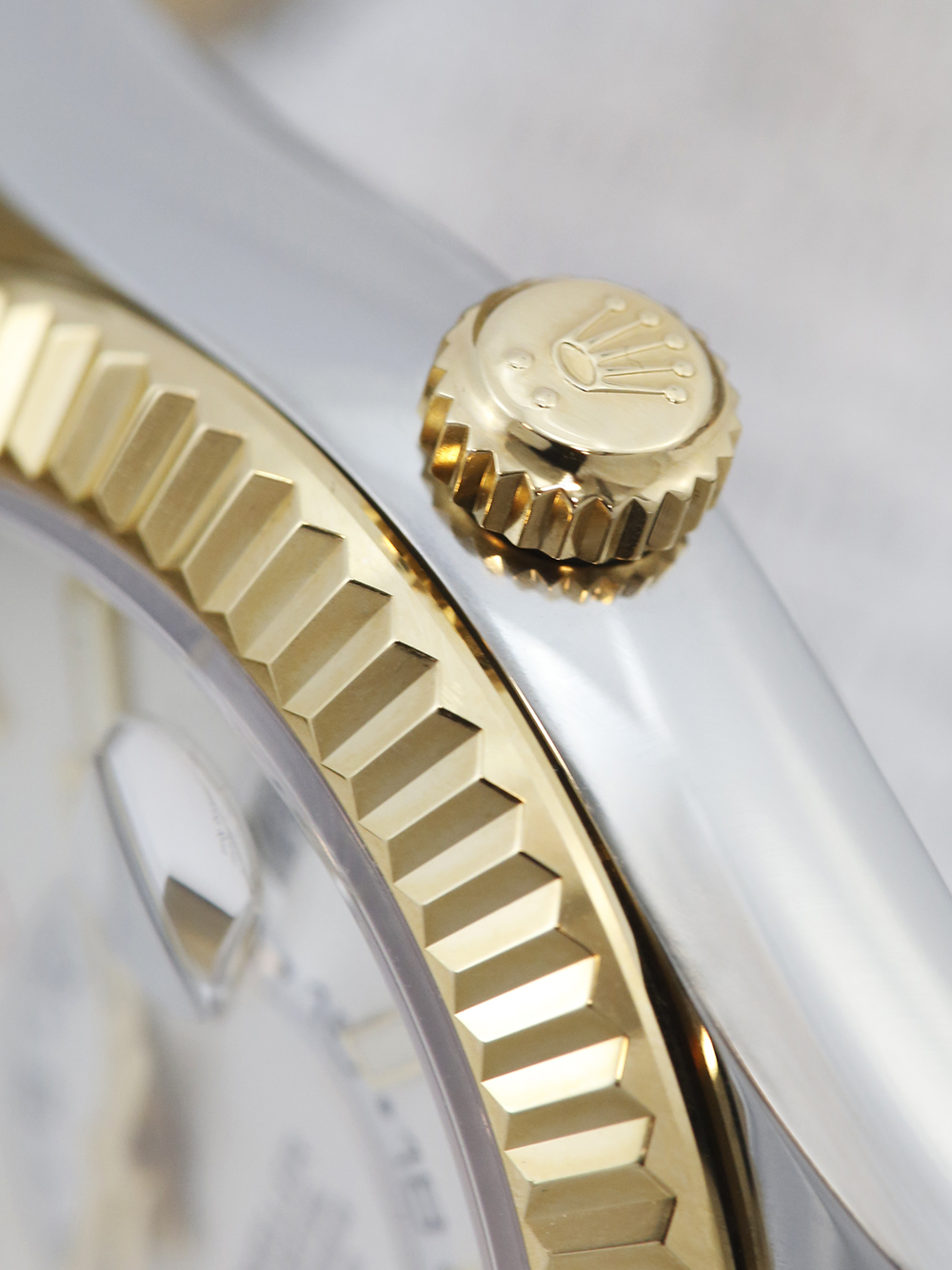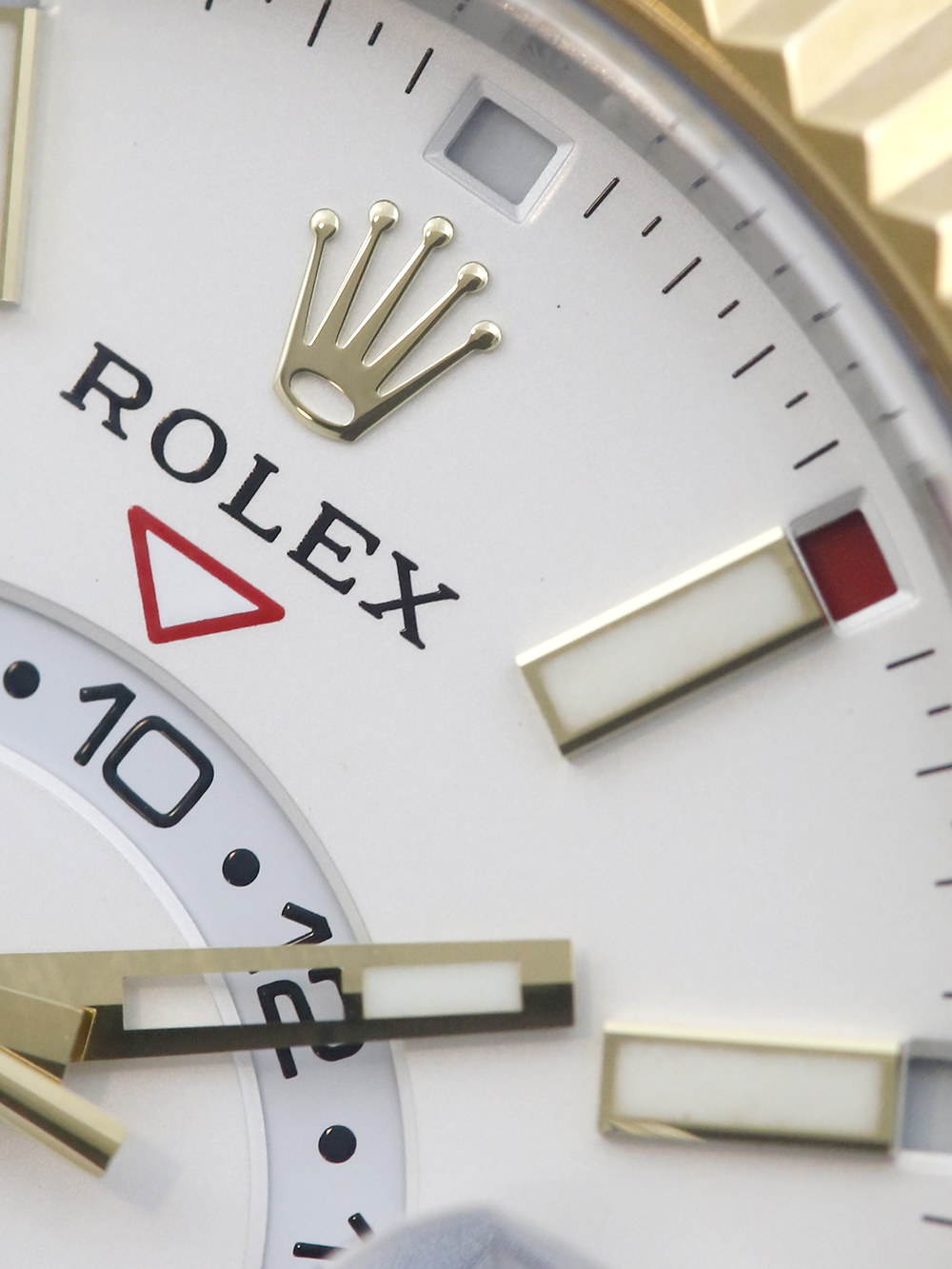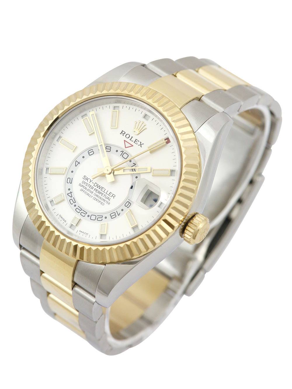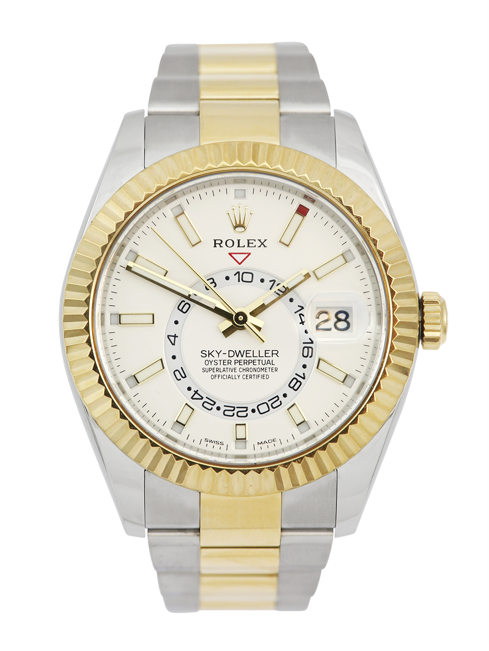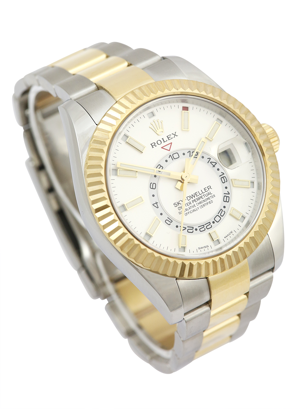 An excellent condition pre-owned 42mm case size Oystersteel and yellow gold bi-metal superlative chronometer, calibre 9001, automatic movement Rolex Sky-Dweller model reference 326933 featuring a white baton dial surrounded by a yellow gold fluted bezel on a full retail length Oystersteel and yellow gold bi-metal Rolex Oyster bracelet.