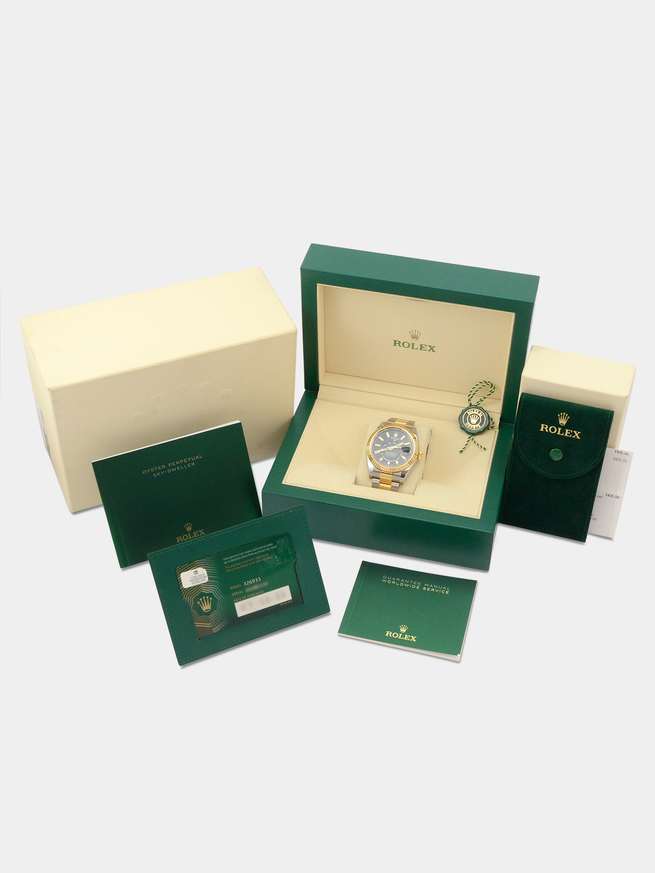 This particular watch is supplied as shown in the detailed images with the original Rolex inner and outer box, one original Rolex swing tag, the two original Rolex manuals, the original Rolex warranty card holder and the original Rolex warranty card. The card is dated November 2021 when first supplied new by the authorised dealer.