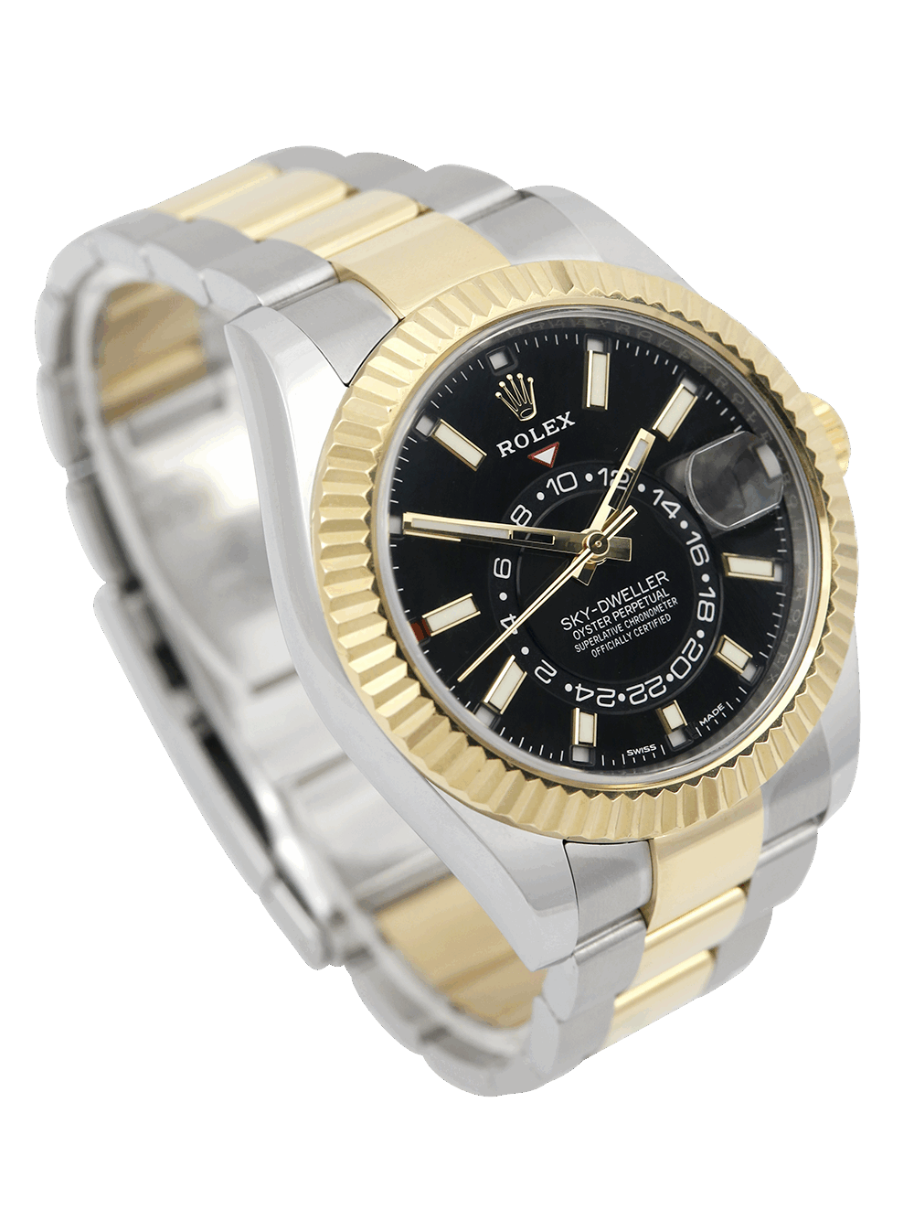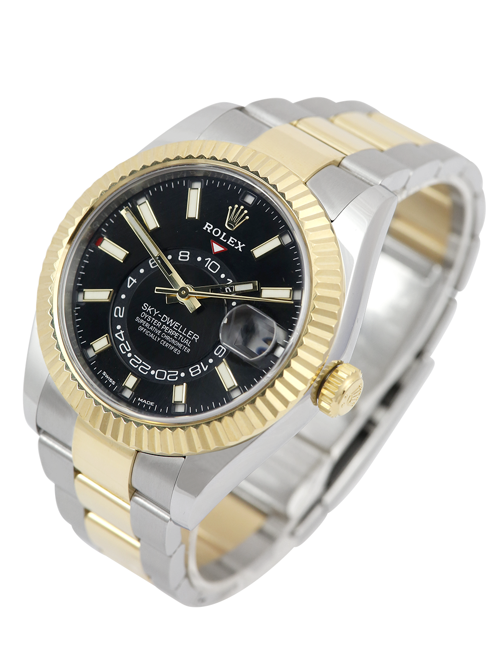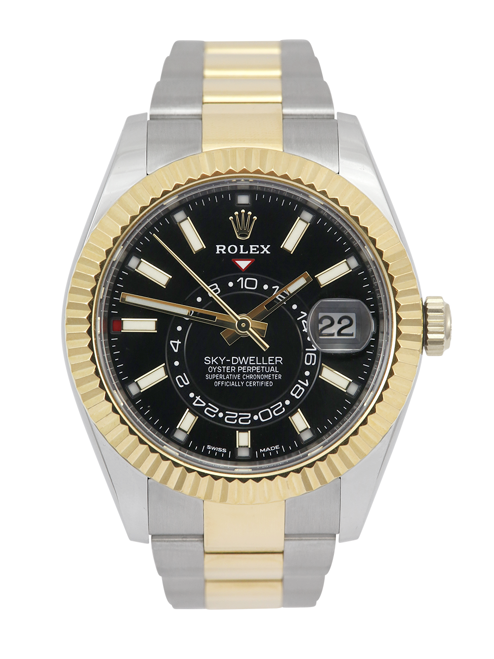 An excellent condition, pre-owned, superlative chronometer certified, automatic movement Rolex Sky-Dweller model reference 326933. Featuring a 42mm bimetal stainless steel and yellow gold case, housing a black baton dial with a central 24h clock, an annual calendar function and a date aperture at 3 o’clock. The dial is surrounded by a yellow gold fluted bezel. All presented on a full retail length stainless steel & yellow gold Rolex Oyster bracelet with an Oysterclasp folding closure.