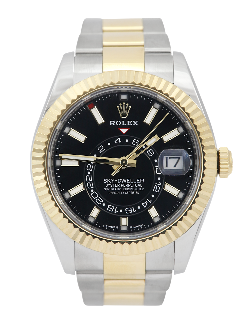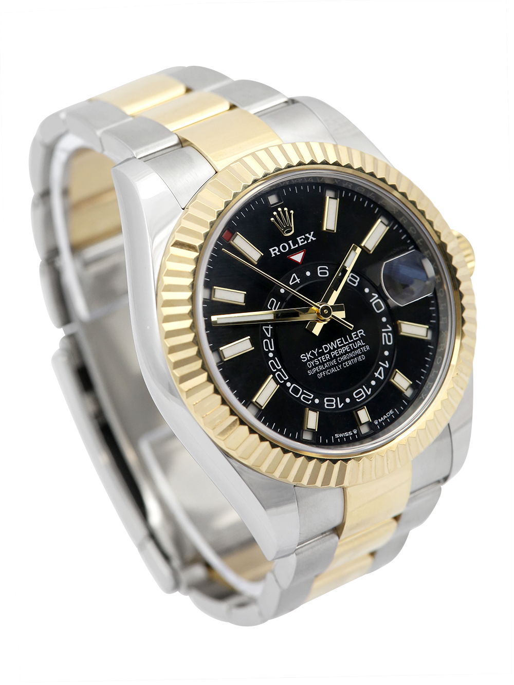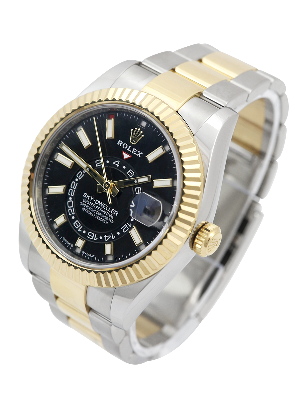 A pre-owned in pristine condition a 42mm case size Bi-Metal Oystersteel and yellow gold superlative chronometer, calibre 9002, automatic movement Oyster Perpetual Sky-Dweller model reference 336933 featuring a bright black baton dial surrounded by a yellow gold fluted bezel presented on a Bi-Metal stainless steel and yellow gold Rolex Oyster bracelet with a folding clasp.