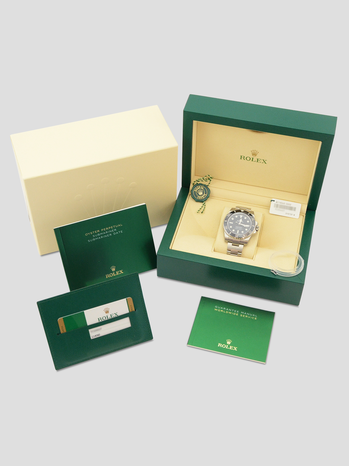 This particular watch is supplied as shown in the detailed images with both of the original inner and outer Rolex boxes, the original Rolex bezel protector, the two original Rolex swing tags, the two original Rolex booklets, the original Rolex warranty card holder and the original Rolex warranty card dated February 2020 when first supplied new by the UK based authorised dealer.