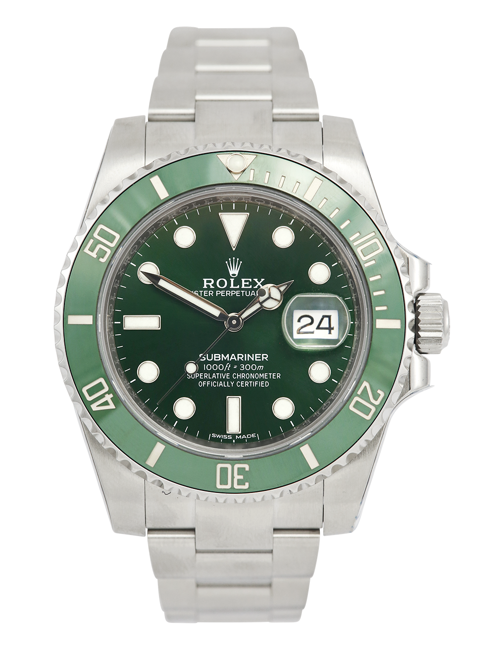 A serviced and unworn since pre-owned in pristine cosmetic condition chronometer certified automatic movement Rolex Submariner Date, model reference 116610LV aka “Hulk”. Featuring a 40mm stainless steel case, housing a green ‘sunburst’ effect baton dial with a date aperture at 3 o’clock and an external cyclops. The dial is surrounded by a green ceramic 60 minute uni-directional rotating diver’s bezel. Fitted with a full retail length stainless steel Rolex Oyster bracelet with a secure folding Oysterlock clasp.