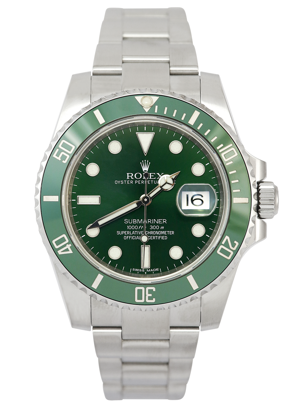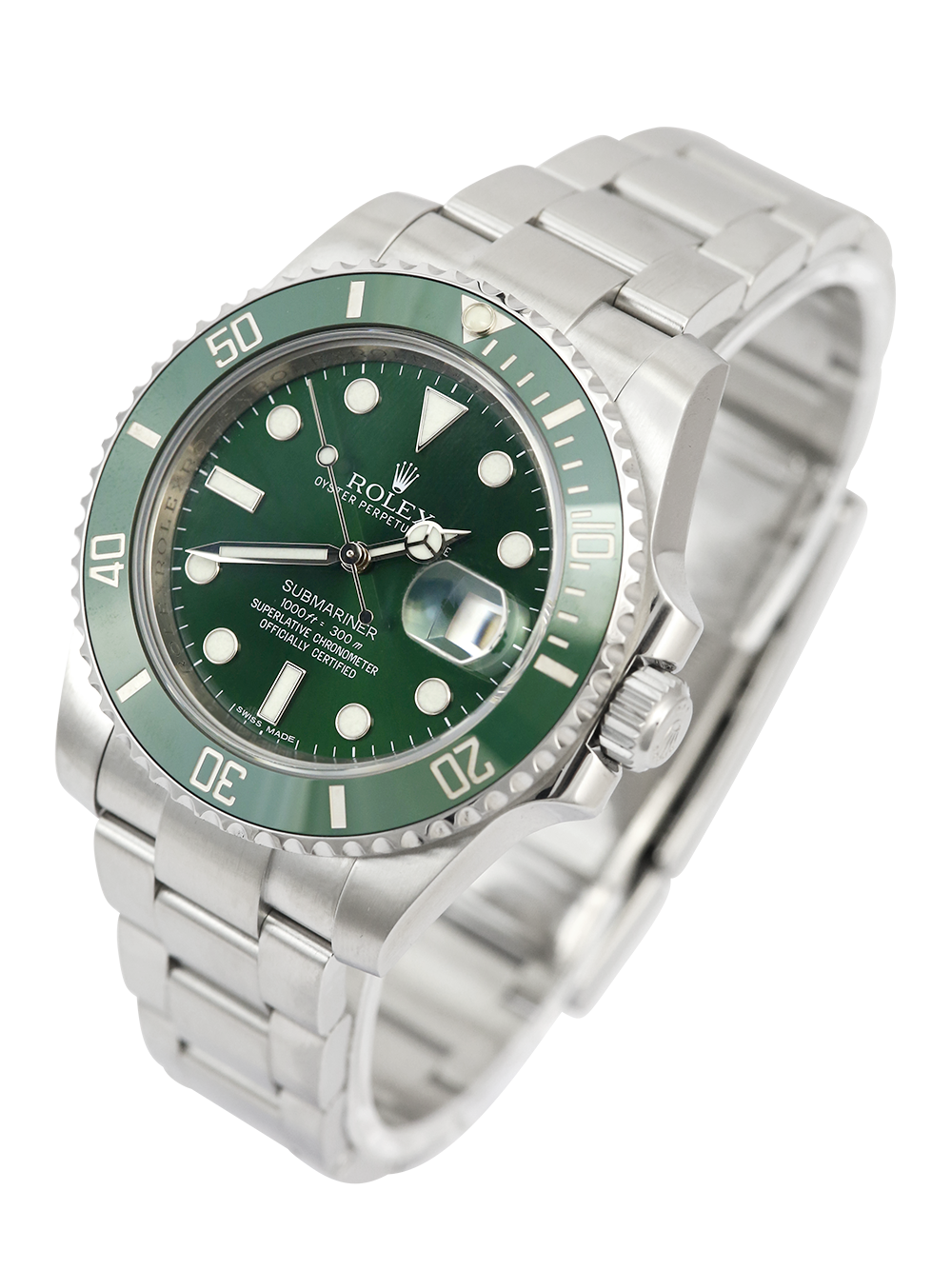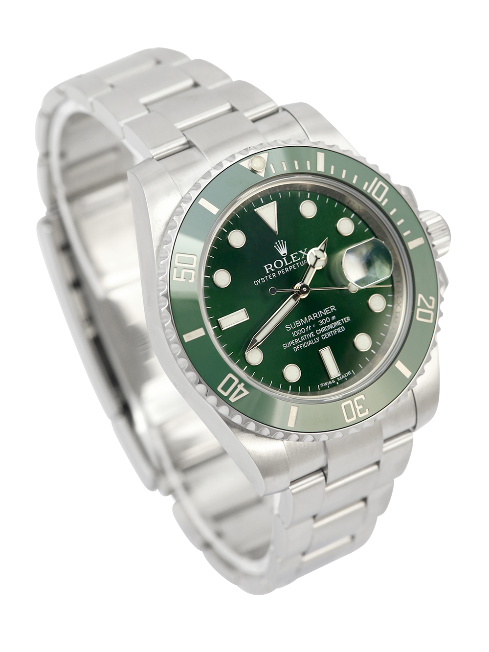 A pre-owned in pristine cosmetic condition chronometer certified automatic movement Rolex Submariner Date, model reference 116610LV aka “Hulk”. Featuring a 40mm stainless steel case, housing a green ‘sunburst’ effect baton dial with a date aperture at 3 o’clock and an external cyclops. The dial is surrounded by a green ceramic 60 minute uni-directional rotating diver’s bezel. Fitted with a full retail length stainless steel Rolex Oyster bracelet with a secure folding Oysterlock clasp.