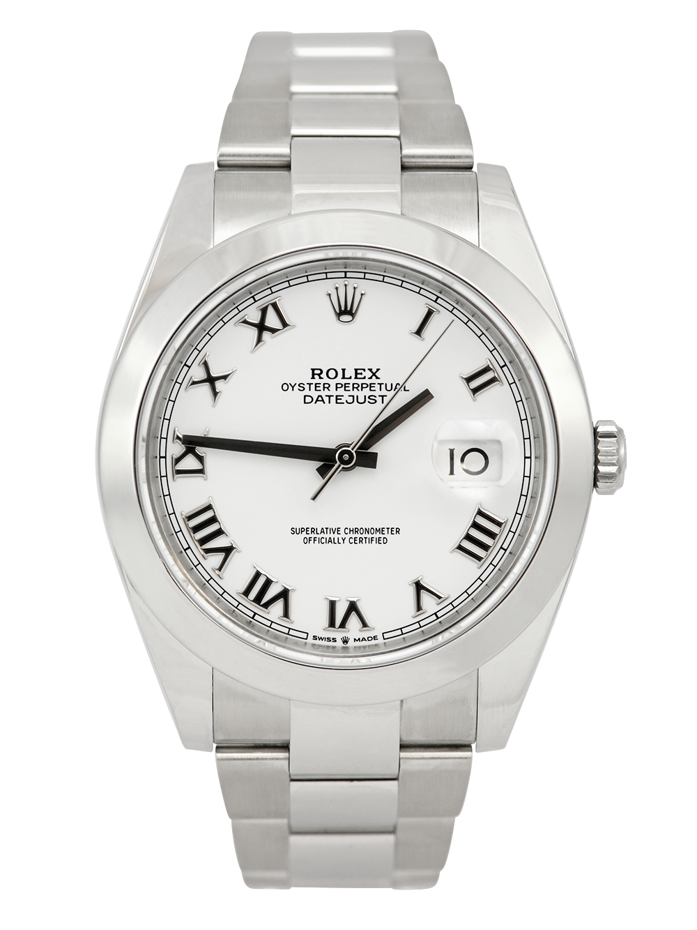 A preowned in pristine condition which is difficult to differentiate between preowned versus unworn new, chronometer certified, automatic movement Rolex Datejust 41 model reference 126300. Featuring a 41mm stainless steel case, housing white Roman numeral dial, a date aperture at 3 o’clock, and an external cyclops. The dial is surrounded by a stainless steel polished finish domed bezel. Presented on a full retail length stainless steel Rolex Oyster bracelet fitted with an Oysterclasp.