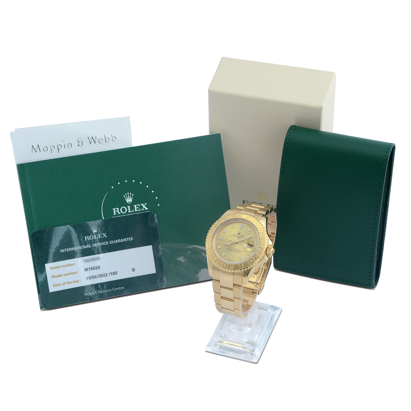 This particular watch is supplied as shown in the detailed images with the service receipt, a Rolex service box, a Rolex service pouch, a Rolex service manual and the Rolex service warranty card dated July 2022.