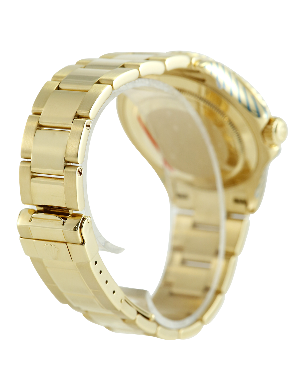 An excellent condition pre-owned yellow gold chronometer certified automatic movement 40mm case size Rolex Yacht-Master 40 model reference 16628 featuring a champagne baton dial surrounded by a yellow gold sandblasted bezel with polished finish numerals on a full retail length yellow gold Rolex Oyster bracelet.