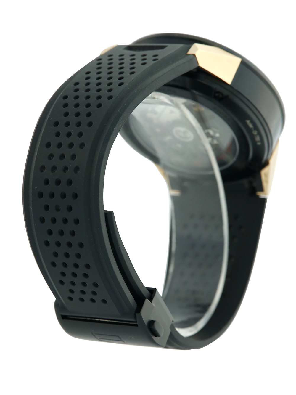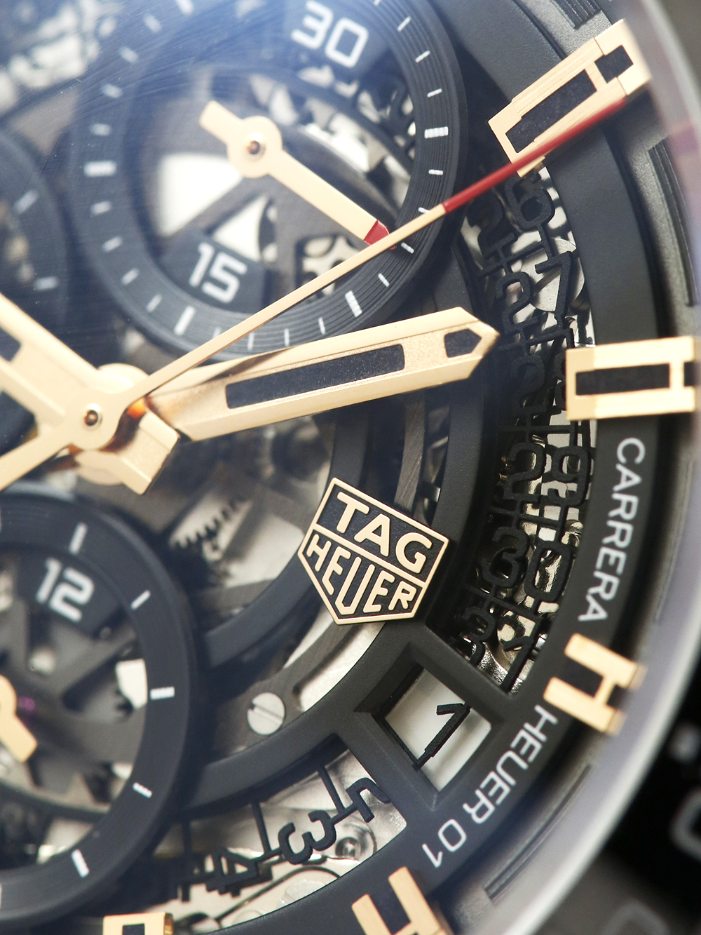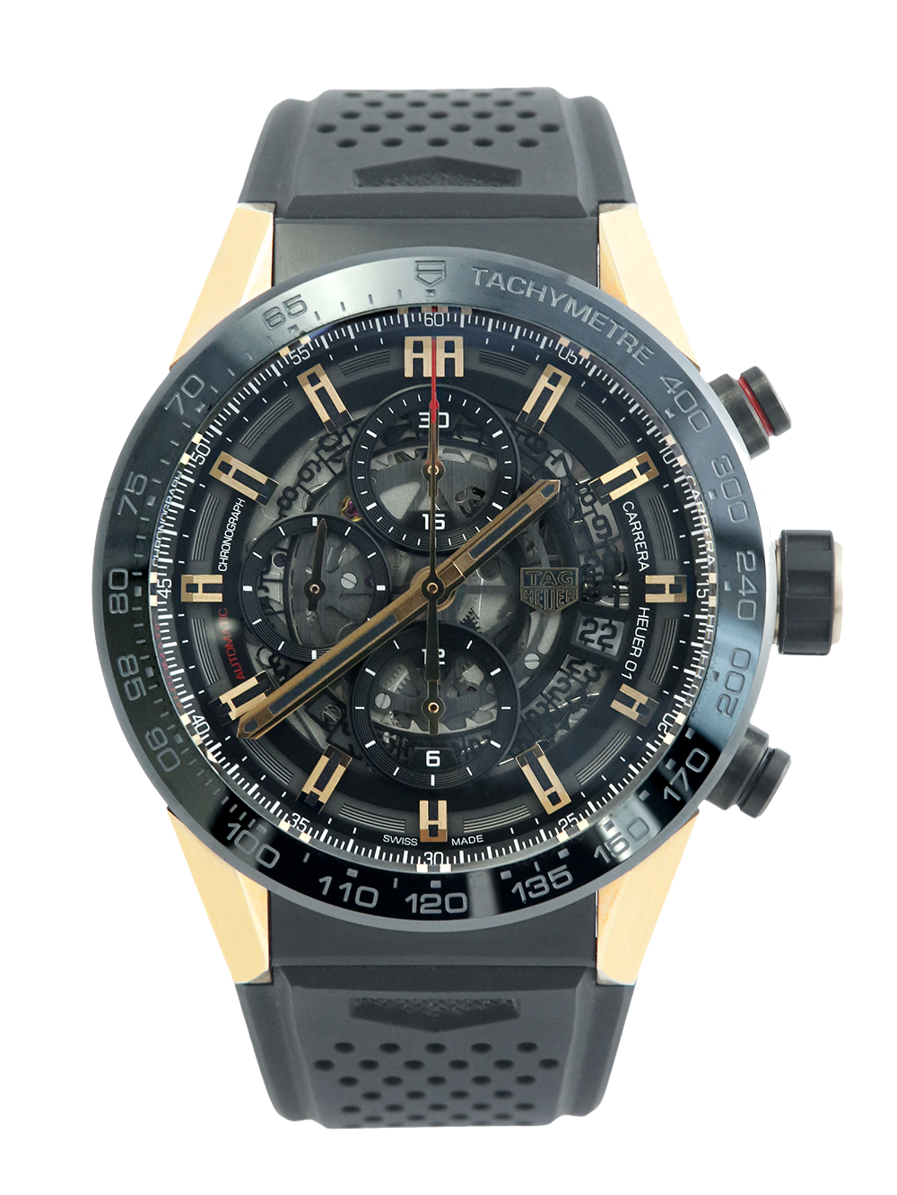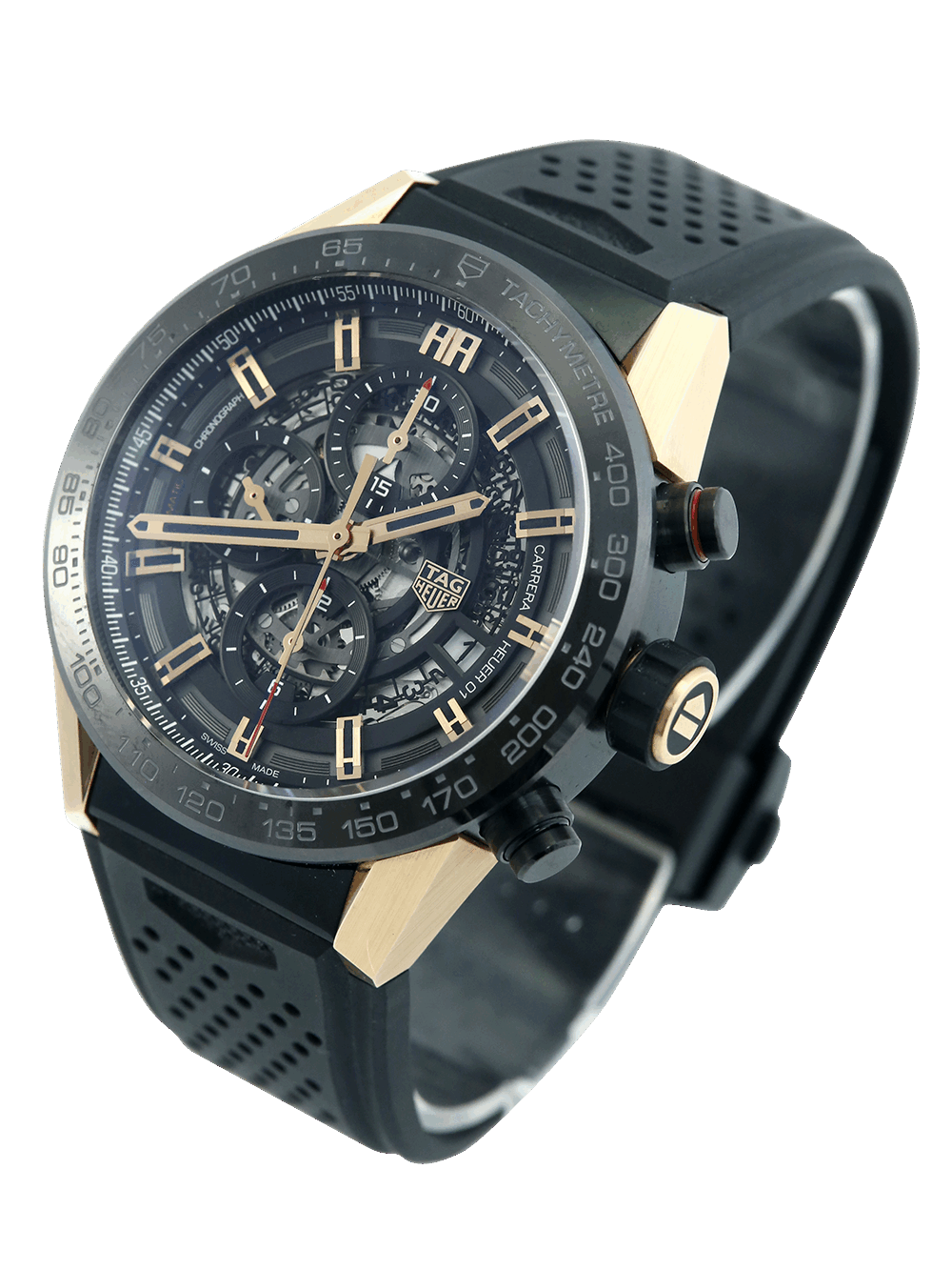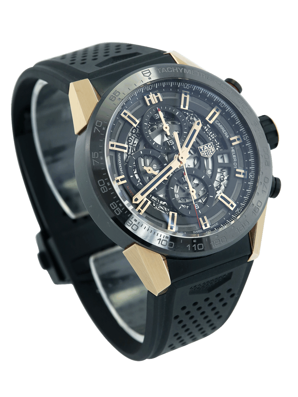 A preowned rose gold, with PVD steel case middle, 43mm case size automatic, calibre Heuer 01, Tag Heuer Carrera Chronograph CAR205A.FT6087 featuring a black skeleton dial with three sub-dials housing a date aperture in-between 3 and 4 O’clock surrounded by a black ceramic tachymetre bezel. This particular watch comes on a black rubber deployment Tag Heuer strap.